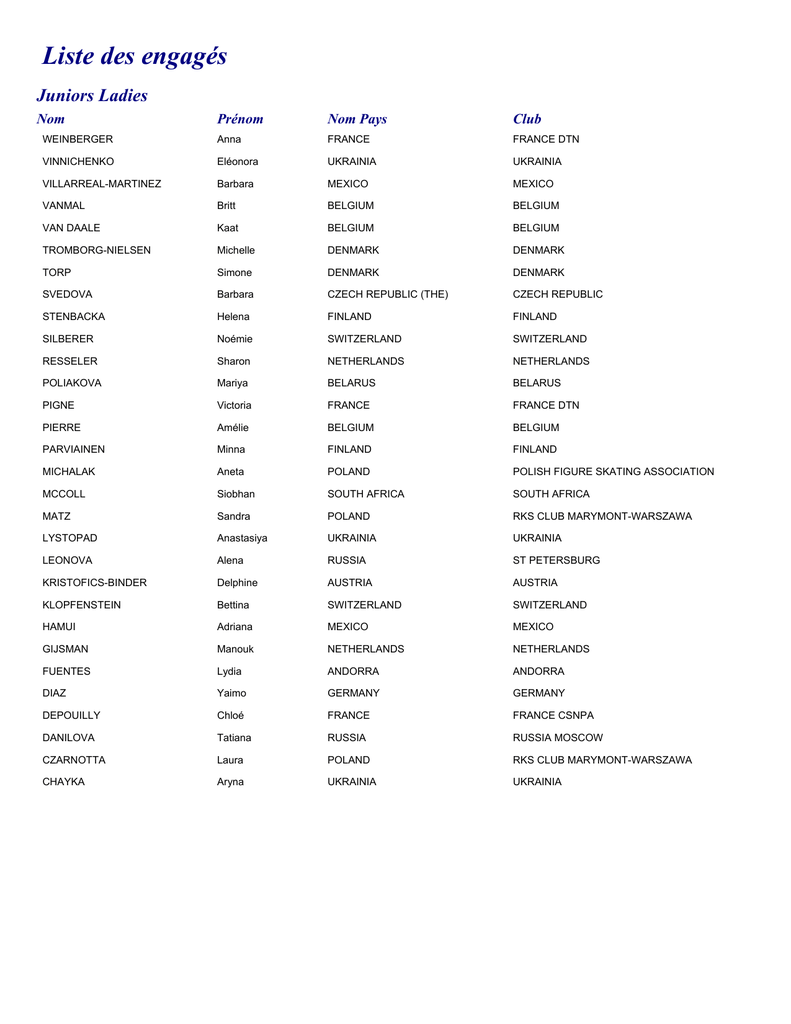 Liste des engagés Juniors Ladies Nom Prénom Nom Pays Club WEINBERGER Anna FRANCE FRANCE DTN VINNICHENKO Eléonora UKRAINIA UKRAINIA VILLARREAL-MARTINEZ Barbara MEXICO MEXICO VANMAL Britt BELGIUM BELGIUM VAN DAALE Kaat BELGIUM BELGIUM TROMBORG-NIELSEN Michelle DENMARK DENMARK TORP Simone DENMARK DENMARK SVEDOVA Barbara CZECH REPUBLIC (THE) CZECH REPUBLIC STENBACKA Helena FINLAND FINLAND SILBERER Noémie SWITZERLAND SWITZERLAND RESSELER Sharon NETHERLANDS NETHERLANDS POLIAKOVA Mariya BELARUS BELARUS PIGNE Victoria FRANCE FRANCE DTN PIERRE Amélie BELGIUM BELGIUM PARVIAINEN Minna FINLAND FINLAND MICHALAK Aneta POLAND POLISH FIGURE SKATING ASSOCIATION MCCOLL Siobhan SOUTH AFRICA SOUTH AFRICA MATZ Sandra POLAND RKS CLUB MARYMONT-WARSZAWA LYSTOPAD Anastasiya UKRAINIA UKRAINIA LEONOVA Alena RUSSIA ST PETERSBURG KRISTOFICS-BINDER Delphine AUSTRIA AUSTRIA KLOPFENSTEIN Bettina SWITZERLAND SWITZERLAND HAMUI Adriana MEXICO MEXICO GIJSMAN Manouk NETHERLANDS NETHERLANDS FUENTES Lydia ANDORRA ANDORRA DIAZ Yaimo GERMANY GERMANY DEPOUILLY Chloé FRANCE FRANCE CSNPA DANILOVA Tatiana RUSSIA RUSSIA MOSCOW CZARNOTTA Laura POLAND RKS CLUB MARYMONT-WARSZAWA CHAYKA Aryna UKRAINIA UKRAINIA Juniors Men Nom Prénom Nom Pays Club ZAKOURIL Marco CZECH REPUBLIC (THE) CZECH REPUBLIC TRETIAKOV Yvan RUSSIA RUSSIA CSKA TEN Denis KAZAKHSTAN KAZAKHSTAN STEIN Patrick GERMANY GERMANY REDIN Mikael SWITZERLAND SWITZERLAND RAYA Javier SPAIN SPAIN MIKHAYLOV Nikita RUSSIA ST PETERSBURG MIALIOKHIN Aliakseï BELARUS BELARUS KIEFER Severin AUSTRIA AUSTRIA IWASAKI Sebastian POLAND RKS CLUB MARYMONT-WARSZAWA HENDRIKX Jorik BELGIUM BELGIUM GHAZICHIAN Alen ARMENIA ARMENIA BORODULIN Artem RUSSIA RUSSIA MOSCOW BONDAR Mikola UKRAINIA UKRAINIA BIALAS Kamil POLAND POLISH FIGURE SKATING ASSOCIATION BESSEGHIER Chafik FRANCE FRANCE CSNPA Novices Ladies Nom Prénom Nom Pays Club ZAPOROZHCHUK Mariya UKRAINIA UKRAINIA VERMA Tara RUSSIA RUSSIA MOSCOW VANNUT Ira BELGIUM BELGIUM VÄISTÖ Sera FINLAND FINLANDE UZUROVA Karina KAZAKHSTAN KAZAKHSTAN TURKOWSKA Paulina POLAND RKS CLUB MARYMONT-WARSZAWA TARRADO Ariana ANDORRA ANDORRA SKINNER Jessica SOUTH AFRICA SOUTH AFRICA SCHULZ Sabrina AUSTRIA AUSTRIA PENCHEVA Maria BULGARIA BULGARIA ORTIZ Patricia SPAIN SPAIN NAKISKO Oleksandra UKRAINIA UKRAINIA MESKAITE Rimgaile LITHUANIA LITHUNIA MEITE Maé Bérénice FRANCE FRANCE CSNPA MADSEN Anita DENMARK DENMARK MAAS Monique BELGIUM BELGIUM LAGAS Barbara NETHERLANDS NETHERLANDS HUUSKONEN Sara FINLAND FINLAND HURTADO Sara SPAIN SPAIN HOFMANN Anna AUSTRIA AUSTRIA HAMUI Adriana MEXICO MEXICO GOSVIANI Nikol RUSSIA ST PETERSBURG GLAZMAN Regina KAZAKHSTAN KAZAKHSTAN FELDER Valeria SWITZERLAND SWITZERLAND EDELSKOY FREDERIKSEN Camilla DENMARK DENMARK DEN HOLLANDER Joyce NETHERLANDS NETHERLANDS CANDRIAN Cindy SWITZERLAND SWITZERLAND BAKUSHEVA Ksenia BELARUS BELARUS ANDRES Tamara SWITZERLAND SWITZERLAND ALAVEZ Priscila MEXICO MEXICO Novices Men Nom Prénom Nom Pays Club UZUROV Rassul KAZAKHSTAN KAZAKHSTAN STRAKACH Pavel BELARUS BELARUS LOFEK sebastian POLAND POLISH FIGURE SKATING ASSOCIATION LAVOISIER Gaylord FRANCE FRANCE CSNPA KURBANOV Murad RUSSIA RUSSIA MOSCOW GACHINSKIY Artur RUSSIA ST PETERSBURG DYMOWSKI Kamil POLAND POLISH FIGURE SKATING ASSOCIATION ARAZA Keiran DENMARK DENMARK Pairs Nom Prénom Nom Pays Club VARTMANN Mari GERMANY GERMANY SMIRNOV Alexander RUSSIA ST PETERSBURG KAWAGUCHI Yuko RUSSIA ST PETERSBURG JUST Florian GERMANY GERMANY COÏA Maxime FRANCE FRANCE DTN CHATAIGNIER Mélodie FRANCE FRANCE DTN CANAC Adeline FRANCE FRANCE DTN BOUZZINE Medhi FRANCE FRANCE DTN Seniors Ladies Nom Prénom Nom Pays Club VENHUIZEN Karen NETHERLANDS NETHERLANDS SHISHKINA Marina KAZAKHSTAN KAZAKHSTAN RADEVA Sonia BULGARIA BULGARIA NAPHTAL Emily MEXICO MEXICO MUHHINA Elena ESTONIA ESTONIA MIKHAÏLOVA Krystsina BELARUS BELARUS LUCA Roxana ROMANIA ROMANIA LINDE Laura GERMANY GERMANY LEE Kristine HONG KONG HONG KONG KREUZER Andréa AUSTRIA AUSTRIA JURKIEWICZ Anna POLAND POLISH FIGURE SKATING ASSOCIATION JAMES Vanessa UNITED KINGDOM UNITED KINGDOM IKONNIKOVA Olga ESTONIA ESTONIA HIETANIEMI Henriikka FINLAND FINLAND FORTIN Vincianne FRANCE FRANCE DTN EPHREM Mérovée MONACO MONACO DUTERTRE Laura FRANCE FRANCE CSNPA DORONINA Ksenia RUSSIA ST PETERSBURG DIDIER Gwendoline FRANCE FRANCE DTRN DIDIER Candice FRANCE FRANCE DTN BLEHA Erica GERMANY GERMANY Seniors Men Nom Prénom Nom Pays Club RAUCHBAUER Christian AUSTRIA AUSTRIA PREVOTEAUX Jérémie FRANCE FRANCE DTN PONSERO Yannick FRANCE FRANCE CSNPA PAULSON Thomas UNITED KINGDOM UNITED KINGDOM MENSHOV Konstantin RUSSIA ST PETERSBURG MAGEROVSKI Mikhail RUSSIA RUSSIA MOSCOW LINDEMANN Stefan GERMANY GERMANY LIEBERS Martin GERMANY GERMANY LIEBERS Peter GERMANY GERMANY LEUSHIN Denis RUSSIA RUSSIA CSKA KELEMEN Zoltan ROMANIA ROMANIA KAZAKOU Aliaksandr BELARUS BELARUS JANECKO Tomas CZECH REPUBLIC (THE) CZECH REPUBLIC GRIAZEV Andreï RUSSIA RUSSIA MOSCOW GIJTENBEEK Christian NETHERLANDS NETHERLANDS FURSOV Yaroslav UKRAINIA UKRAINIA DOMANSKI Przemyslaw POLAND RKS CLUB MARYMONT-WARSZAWA COLOT Jérémie FRANCE FRANCE DTN CHRUSCINSKI Mateusz POLAND POLISH FIGURE SKATING ASSOCIATION BYCHENKO Oleksiy UKRAINIA UKRAINIA BRUMMER Clemens GERMANY GERMANY BORICHEV Naiden BULGARIA BULGARIA ALVARADO-PACHECO Adrian MEXICO MEXICO