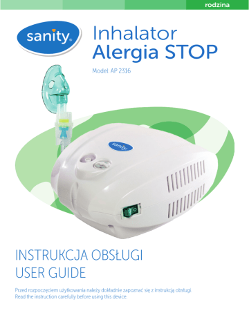 rodzina Inhalator Alergia STOP Model: AP 2316 INSTRUKCJA OBSŁUGI USER GUIDE Przed rozpoczęciem użytkowania należy dokładnie zapoznać się z instrukcją obsługi. Read the instruction carefully before using this device. SPIS TREŚCI WSTĘP...................................................................................................................................................4 BUDOWA INHALATORA....................................................................................................................6 SYMBOLE ZASTOSOWANE W INSTRUKCJI I NA OPAKOWANIU............................................6 WAŻNE ŚRODKI OSTROŻNOŚCI....................................................................................................7 Środki ostrożności dotyczące produktu......................................................................................7 Środki ostrożności dotyczące obsługi.........................................................................................7 Środki ostrożności dotyczące przechowywania.......................................................................7 Środki ostrożności dotyczące czyszczenia.................................................................................7 UŻYTKOWANIE INHALATORA ........................................................................................................8 CZYSZCZENIE......................................................................................................................................9 Odkażanie............................................................................................................................................9 Czyszczenie kompresora.................................................................................................................9 Wymiana filtra.....................................................................................................................................9 CZĘŚCI ZAMIENNE I WYPOSAŻENIE DODATKOWE................................................................10 DANE TECHNICZNE.........................................................................................................................10 DANE KONTAKTOWE......................................................................................................................10 GWARANCJA ....................................................................................................................................19 3 WSTĘP Wersja Polska Szanowny Użytkowniku, Inhalator Alergia STOP Sanity to wyrób medyczny, przeznaczony do terapii inhalacyjnych dla całej rodziny. Został zaprojektowany do skutecznego leczenia alergii i innych chorób układu oddechowego, a także dla codziennej profilaktyki zdrowych płuc. Kompresor wytwarza strumień powietrza, który przedostaje się przez przezroczystą rurkę do nebulizatora. Gdy powietrze dotrze do nebulizatora, przekształca przepisany lek w rozpylony aerozol, składający się z mikroskopijnej wielkości cząsteczek, transportujących lek bezpośrednio do płuc. Należy pamiętać, że przeprowadzanie terapii przy wykorzystaniu nebulizacji powinno zawsze odbywać się pod nadzorem lekarza, specjalisty w dziedzinie zaburzeń oddechowych. Zachęcamy do dokładnego przeczytania niniejszej instrukcji, aby poznać właściwości produktu. Prawidłowa konserwacja i eksploatacja inhalatora zapewnią mu sprawność przez wiele lat. 4 WSTĘP O marce Sanity® Sanity® jest obecna na rynku polskim już od 20 lat jako marka jakościowych i funkcjonalnych produktów medycznych, ułatwiających powrót do zdrowia oraz codzienną profilaktykę zdrowia i pielęgnację całej rodziny. W portfolio marki Sanity® można znaleźć szeroki wybór urządzeń i akcesoriów medycznych służących do wykonywania podstawowych badań diagnostycznych, zabiegów laryngologicznych i rehabilitacyjnych, a także wspomagających codzienną pielęgnację ciała, troskę o zdrowie i higienę dorosłych oraz dzieci. Produkty marki Sanity® cechują wysoka jakość wykonania i praktyczne, przyjazne użytkownikowi rozwiązania. Nasze wyroby spełniają wymagania najsurowszych norm bezpieczeństwa, pozytywnie przeszły testy kliniczne i otrzymały odpowiednie certyfikaty potwierdzające zgodność ze standardami Unii Europejskiej. Nasze wartości Miłość stanowi podstawę naszego człowieczeństwa. To ona napędza nas w życiu i powoduje, że stajemy się lepsi. Troska jest efektem naszych uczuć oraz wrażliwości. Troska o najbliższych kieruje naszymi działaniami i zmienia nasze spojrzenie na przedmioty codziennego użytku. Pomoc to przejaw miłości i troski. Obejmuje wszystkie, nawet drobne czynności, które wykonujemy dla drugiej osoby, dbając o nią w każdej sytuacji. 5 BUDOWA INHALATORA 6. Przewód powietrza 2. Uchwyt 5. Wylot powietrza 3. Otwory wentylacyjne 4. Filtr powietrza 7. Pojemnik na lek 1. Włącznik ON/ wyłącznik OFF 8. Ustnik 9. Maska inhalacyjna dla dorosłych 10. Maska inhalacyjna dla dzieci 11. Zapasowe filtry powietrza SYMBOLE ZASTOSOWANE W INSTRUKCJI I NA OPAKOWANIU Część aplikacyjna typu BF Ochrona przed porażeniem elektrycznym – Urządzenie klasy II Przełącznik OFF Chronić urządzenie przed wilgocią Przełącznik ON Zapoznać się dokładnie z instrukcją przed rozpoczęciem użytkowania Prąd przemienny Ważne zalecenia dotyczące bezpieczeństwa Wytwórca Numer partii Zgodność z wymaganiami dyrektywy o wyrobach medycznych 93/42/EWG Symbol przekreślonego kosza na śmieci na produkcie lub jego opakowaniu oznacza, że produktu nie wolno wyrzucać do zwykłych pojemników na odpady. Obowiązkiem użytkownika jest przekazanie zużytego sprzętu do wyznaczonego punktu zbiórki w celu recyklingu odpadów powstałych ze sprzętu elektrycznego i elektronicznego. Zapewniając prawidłową utylizację pomagasz chronić środowisko naturalne. W celu uzyskania bardziej szczegółowych informacji dotyc