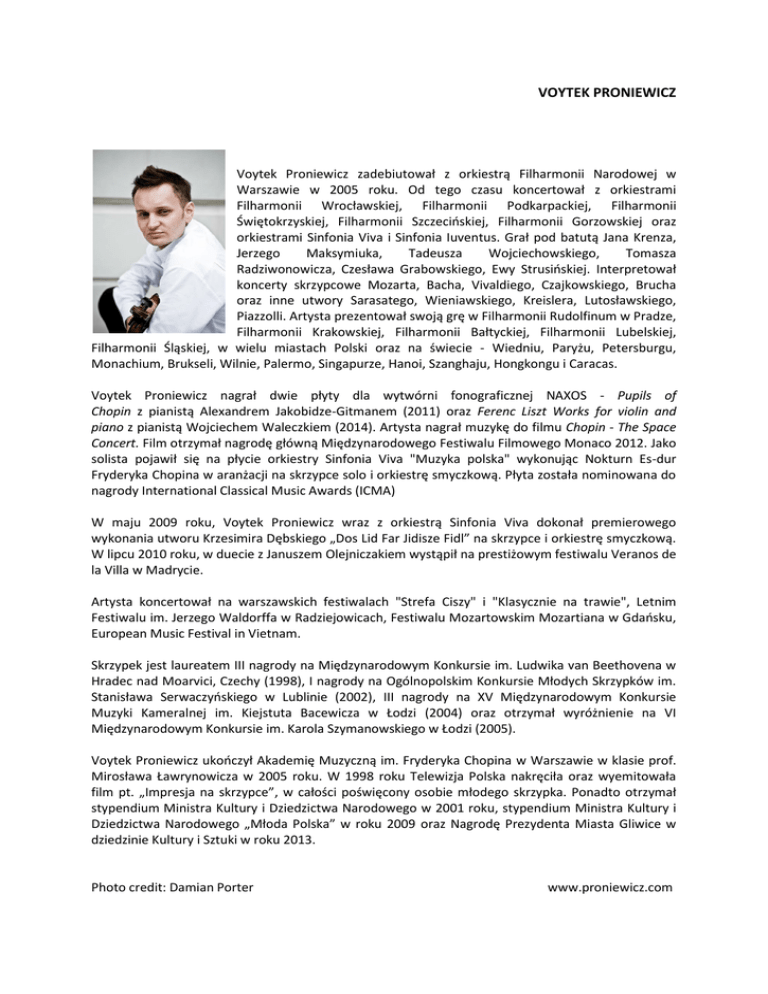 VOYTEK PRONIEWICZ Voytek Proniewicz zadebiutował z orkiestrą Filharmonii Narodowej w Warszawie w 2005 roku. Od tego czasu koncertował z orkiestrami Filharmonii Wrocławskiej, Filharmonii Podkarpackiej, Filharmonii Świętokrzyskiej, Filharmonii Szczecińskiej, Filharmonii Gorzowskiej oraz orkiestrami Sinfonia Viva i Sinfonia Iuventus. Grał pod batutą Jana Krenza, Jerzego Maksymiuka, Tadeusza Wojciechowskiego, Tomasza Radziwonowicza, Czesława Grabowskiego, Ewy Strusińskiej. Interpretował koncerty skrzypcowe Mozarta, Bacha, Vivaldiego, Czajkowskiego, Brucha oraz inne utwory Sarasatego, Wieniawskiego, Kreislera, Lutosławskiego, Piazzolli. Artysta prezentował swoją grę w Filharmonii Rudolfinum w Pradze, Filharmonii Krakowskiej, Filharmonii Bałtyckiej, Filharmonii Lubelskiej, Filharmonii Śląskiej, w wielu miastach Polski oraz na świecie - Wiedniu, Paryżu, Petersburgu, Monachium, Brukseli, Wilnie, Palermo, Singapurze, Hanoi, Szanghaju, Hongkongu i Caracas. Voytek Proniewicz nagrał dwie płyty dla wytwórni fonograficznej NAXOS - Pupils of Chopin z pianistą Alexandrem Jakobidze-Gitmanem (2011) oraz Ferenc Liszt Works for violin and piano z pianistą Wojciechem Waleczkiem (2014). Artysta nagrał muzykę do filmu Chopin - The Space Concert. Film otrzymał nagrodę główną Międzynarodowego Festiwalu Filmowego Monaco 2012. Jako solista pojawił się na płycie orkiestry Sinfonia Viva "Muzyka polska" wykonując Nokturn Es-dur Fryderyka Chopina w aranżacji na skrzypce solo i orkiestrę smyczkową. Płyta została nominowana do nagrody International Classical Music Awards (ICMA) W maju 2009 roku, Voytek Proniewicz wraz z orkiestrą Sinfonia Viva dokonał premierowego wykonania utworu Krzesimira Dębskiego „Dos Lid Far Jidisze Fidl” na skrzypce i orkiestrę smyczkową. W lipcu 2010 roku, w duecie z Januszem Olejniczakiem wystąpił na prestiżowym festiwalu Veranos de la Villa w Madrycie. Artysta koncertował na warszawskich festiwalach "Strefa Ciszy" i "Klasycznie na trawie", Letnim Festiwalu im. Jerzego Waldorffa w Radziejowicach, Festiwalu Mozartowskim Mozartiana w Gdańsku, European Music Festival in Vietnam. Skrzypek jest laureatem III nagrody na Międzynarodowym Konkursie im. Ludwika van Beethovena w Hradec nad Moarvici, Czechy (1998), I nagrody na Ogólnopolskim Konkursie Młodych Skrzypków im. Stanisława Serwaczyńskiego w Lublinie (2002), III nagrody na XV Międzynarodowym Konkursie Muzyki Kameralnej im. Kiejstuta Bacewicza w Łodzi (2004) oraz otrzymał wyróżnienie na VI Międzynarodowym Konkursie im. Karola Szymanowskiego w Łodzi (2005). Voytek Proniewicz ukończył Akademię Muzyczną im. Fryderyka Chopina w Warszawie w klasie prof. Mirosława Ławrynowicza w 2005 roku. W 1998 roku Telewizja Polska nakręciła oraz wyemitowała film pt. „Impresja na skrzypce”, w całości poświęcony osobie młodego skrzypka. Ponadto otrzymał stypendium Ministra Kultury i Dziedzictwa Narodowego w 2001 roku, stypendium Ministra Kultury i Dziedzictwa Narodowego „Młoda Polska” w roku 2009 oraz Nagrodę Prezydenta Miasta Gliwice w dziedzinie Kultury i Sztuki w roku 2013. Photo credit: Damian Porter www.proniewicz.com