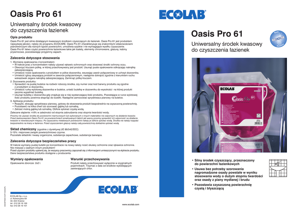 Oasis Pro 61 Uniwersalny środek kwasowy do czyszczenia łazienek Opis produktu Oasis Pro 61 Oasis Pro 61 jest silnie działającym kwasowym środkiem czyszczącym do łazienek. Oasis Pro 61 jest produktem najwyższej jakości, należy do programu ECOCARE. Oasis Pro 61 charakteryzuje się znakomitymi właściwościami pianotwórczymi dla różnych typów powierzchni, umożliwia szybkie i nie wymagające wysiłku czyszczenie. Oasis Pro 61 łatwo czyści powierzchnie łazienkowe takie jak toalety, elementy chromowane, glazurę, kabiny prysznicowe, pozostawiając przyjemny zapach. Uniwersalny środek kwasowy do czyszczenia łazienek Zalecenia dotyczące stosowania 1. Wymiana opakowania z koncentratem: • W trakcie prac z koncentratem należy używać rękawic ochronnych oraz stosować środki ochrony oczu. • Otworzyć kluczem półkę, w której przechowywany jest produkt. Usunąć puste opakowanie odkręcając nakrętkę zabezpieczającą. • Umieścić nowe opakowanie z produktem w półce dozownika, wsuwając zawór połączeniowy w uchwyt dozownika. • Umieścić iglicę zasysającą produkt w zaworze połączeniowym, następnie dokręcić zgodnie z kierunkiem ruchu wskazówek zegara nakrętkę zabezpieczającą. Zamknąć półkę kluczem. 2. Dozowanie produktu: • Sprawdzić na pustej butelce na roztwór roboczy środka, czy numer oraz kod barwny produktu są zgodne z produktem w dozowniku. • Umieścić rurkę wylotową dozownika w butelce, unieść butelkę w dozowniku do wysokości na której produkt zacznie wypełniać butelkę. • Usunąć butelkę z dozownika gdy znajduje się w niej wystarczająca ilość produktu. Pozostająca w rurce wylotowej ilość produktu powinna skapnąć do butelki. Następnie zamocować spryskiwacz pianowy na butelce. 3. Aplikacja produktu: • Rozpylić, stosując spryskiwacz pianowy, gotowy do stosowania produkt bezpośrednio na czyszczoną powierzchnię. • Pozostawić na kilka chwil lub szorować gąbką lub szmatką. • Zetrzeć mokrą gąbką lub szmatką. Obficie spłukać czystą wodą. Zalecane stężenie: 4-8% w zależności od stopnia zabrudzenia oraz stopnia twardości wody. Prosimy nie używać środka do powierzchni marmurowych lub wykonanych z innych materiałów nie odpornych na działanie kwasów. Przed zastosowaniem Oasis Pro 61 na powierzchniach emaliowanych takich jak wanny prosimy sprawdzić ich odporność na działanie kwasów w niewidocznym miejscu. Po czyszczeniu metalowych powierzchni należy je obficie spłukać wodą. Środka nie należy rozpylać bezpośrednio na krany w łazience. Przed czyszczeniem glazury należy całą powierzchnię dokładnie spłukać wodą. Skład chemiczny (zgodnie z dyrektywą UE 89/542/EEC) 5-15%: niejonowe związki powierzchniowo czynne. Pozostałe składniki: kwasy organiczne, substancje zapachowe, substancja barwiąca. Zalecenia dotyczące bezpieczeństwa pracy OASISPRO61CS/P/100303/PL W trakcie wymiany pustej butelki po koncentracie na nową należy nosić okulary ochronne oraz rękawice ochronne. Nie mieszać z żadnym innym produktem! Przed użyciem produktu upewnij się, że wszyscy pracownicy zapoznali się z informacjami umieszczonymi na etykiecie produktu. Dane bezpieczeństwa produktu dostępne u producenta. Wymiary opakowania Warunki przechowywania Opakowanie zbiorcze: 2x2 l. Produkt należy przechowywać wyłącznie w oryginalnych pojemnikach. Trzymać z dala od środków wybielających zawierających chlor. • Silny środek czyszczący, przeznaczony do powierzchni łazienkowych • Usuwa bez potrzeby szorowania nagromadzone osady powstałe w wyniku stosowania wody o dużym stopniu twardości oraz osady z piany mydlanej i brudu • Pozostawia czyszczoną powierzchnię czystą i błyszczącą ECOLAB Sp. z o.o. ul. Kalwaryjska 69 30−504 Kraków tel.: 012 26 16 100 fax: 012 26 16 101 www.ecolab.com