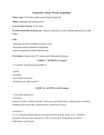 Scenariusz lekcji “Prosty kręgosłup” Temat zajęć: Ćwiczenia ogólno usprawniające kręgosłup Miejsce ćwiczeń: Sala gimnastyczna Czas trwania ćwiczeń: 30-40 minut Przybory/materiały dydaktyczne: materace, plastikowe tyczki, drabinki gimnastyczne, piłki fitness Cele: -wdrażanie nawyku prawidłowej postawy ciała -utrzymanie pełnej ruchomości kręgosłupa -poprawa sprawności układu oddechowego Prowadzący: Nauczyciele WF (opracowała Aleksandra Branigan) CZĘŚĆ I - WSTĘPNA [5 minut] 1. Czynności organizacyjno-porządkowe -zbiórka -powitanie -sprawdzenie obecności -określenie celu zajęć uczniom CZĘŚĆ II - GŁÓWNA [20-30 minut] 1. Ćwiczenia oddechowe -ćwiczenie 1 postawa wysoka w lekkim rozkroku. Ruch-unoszenie RR do boku z jednoczesnym wdechem, następnie opuszczenie RR z jednoczesnym wydechem [10 razy] -ćwiczenie 2 p.w. jw, splecione dłonie ułożone wewnętrzną stroną na czole. Ruch-wraz z wdechem, naciskamy głową na ręce i patrzymy w dół. Liczymy do 5. Wydychamy powietrze i rozluźniamy się [10 razy] 2. Ćwiczenia ogólno usprawniające -ćwiczenie 1 pozycja wysoka, Ruch- ściąganie łopatek ku sobie poprzez splecenie RR za plecami z równoczesnym odgięciem głowy ku tyłowi [15 razy] -ćwiczenie 2 pozycja wysoka, RR oparte w okolicy krzyżowej. Palce skierowane ku tyłowi, kciuki do przodu. Ruch- wyginamy tułów do tyłu jak najdalej, podpierając lędżwia rękami i utrzymując proste kolana. Wytrzymujemy w tej pozycji przez 5 sekund, po czym wracamy do pozycji wyjściowej. [10 razy] -ćwiczenie 3 pozycja stojąca, trzymanie oburącz tyczki za karkiem, Ruch-wykonujemy maksymalne skręty tułowia w obie strony [15 razy] -ćwiczenie 4 siad na krześle, RR założone za głowę. Ruch-delikatne schylanie głowy do przodu. Powrócić do pozycji wyjściowej [15 razy] -ćwiczenie 5 p.w. jw, Ruch- Napinamy mm. brzucha i podnosimy się na palcach [10 razy] -ćwiczenie 6 p.w. jw, Ruch-Jedną rękę zakładamy na biodro, drugą zsuwamy po udzie do kolana zginając tym samym kręgosłup do boku. Wracamy do pozycji wyjściowej [po 10 razy] - ćwiczenie 7 leżenie na plecach, NN wyprostowane, Ruch- unosimy prostą w kolanie nogę jak najwyżej, powoli opuszczamy [po 10 razy] - ćwiczenie 8 Leżenie na plecach, Ruch-zginamy jedną nogę i chwytamy ją poniżej kolana. Następnie zginamy głowę starając się dotknąć czołem do kolana. Wytrzymujemy przez 5 sekund. Powtarzamy ćwiczenie drugą nogę w ten sam sposób [po 10 razy] -ćwiczenie 9 leżenie na plecach na materacu. Ruch-NN uginamy w kolanach i przyciągamy do klatki piersiowej, RR oplatają kolana. Powracamy do pozycji wyjściowej z wydechem [15 razy] -ćwiczenie 10 p.w. jw, wraz z wdechem, podnosimy wyprostowane nogi nad ziemię i trzymamy licząc do 5. Wydychamy powietrze i opuszczamy nogi [15 razy] -ćwiczenie 11 p.w. jw, Ruch- zginamy jedna nogę, chwytamy splecionymi dłońmi za kolano. Wraz z wdechem, podciągamy kolano w stronę tego samego barku (prawa noga do prawego barku). Z wydechem wracamy do pozycji wyjściowej. Zmieniamy nogę [po 10 razy] -ćwiczenie 12 p.w. jw, Ruch-unosimy NN zgięte w kolanach i st.biodrowych,wykonujemy rowerek przez 5 sekund, powracamy do p.w. [10razy] -ćwiczenie 13 leżenie na brzuchu z RR wzdłuż tułowia, Ruch-unosimy barki w górę. Wytrzymujemy przez 10 sekund, następnie odpoczywamy [15 razy] -ćwiczenie 14 p.w. jw+ręce przed głowę trzymając tyczkę .Ruch-unoszenie laski nad podłożem, wytrzymać 5 sekund, powrócić do pozycji wyjściowej [15razy] -ćwiczenie 15 Leżenie na piłce fitnessowej- naprzemienne wznosy RL I NP. ze zmianą na RP I NL- 20 razy -ćwiczenie 16 p.w. jw, Ruch- unosimy tułów na prostych rękach i skręcamy barki na przemian w obie strony, tak aby poczuć napięcie mm. grzbietu. -ćwiczenie 17 Pozycja: klęk podparty. Opieramy się na dłoniach i kolanach. Ruch-Na wdech wykonujemy' "koci grzbiet", na wydech opuszczamy plecy. [15 razy] -ćwiczenie 18 klęcząc opieramy się na obu łokciach. Wykonując wdech wyginamy plecy w "koci grzbiet". Następnie wykonując wydech wyginamy kręgosłup ku dołowi. Aby ćwiczyć górny odcinek kręgosłupa należy wysunąć łokcie bardziej do przodu i obniżyć klatkę piersiową. Aby ćwiczyć dolny odcinek kręgosłupa należy oprzeć się na prostych rękach. CZĘĆ III KOŃCOWA [10 minut] 1. Ćwiczenia oddechowe -ćwiczenie 1 pozycja wysoka ,tyczka trzymana oburącz na wysokości kolców biodrowych przednich górnych, Ruch-wznos RR do góry z jednoczesnym wdechem, opuszczanie RR wraz z wydechem [10 razy] -ćwiczenie 2 p.w. jw,Ruch- uwypuklenie klatki piersiowej przez wdech wraz z lekkim wyprostem tyłowia, następnie pochylenie tułowia do przodu, tyczka zsuwana wzdłuż NN z jednoczesnym wydechem [10 razy] 2. Czynności porządkowe -sprzątnięcie przyborów i przyrządów -omówienie samodzielnego wykonywania ćwiczeń ogólno usprawniających