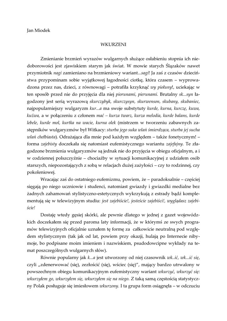 Jan Miodek WKURZENI Zmienianie brzmień wyrazów wulgarnych służące osłabieniu stopnia ich niedoborowości jest zjawiskiem starym jak świat. W mowie starych Ślązaków nawet przymiotnik nagi zamieniano na brzmieniowy wariant...sagi! Ja zaś z czasów dzieciństwa przypominam sobie wyjątkowej łagodności ciotkę, która czasem – wyprowadzona przez nas, dzieci, z równowagi – potrafiła krzyknąć wy piołuny!, uciekając w ten sposób przed nie do przyjęcia dla niej piorunami, pierunami. Brutalny sk...syn łagodzony jest serią wyrazową skurczybyk, skurczysyn, skurwenson, skubany, skubaniec, najpopularniejszy wulgaryzm kur...a ma swoje substytuty kurde, kurna, kurczę, kuwa, kuźwa, a w połączeniu z członem mać – kurza twarz, kurza melodia, kurde balans, kurde lebele, kurde mol, kurtka na wacie, kurna olek (mistrzem w tworzeniu zabawnych zastępników wulgaryzmów był Witkacy: sturba jego suka wlań śmierdząca, sturba jej sucha wlań chełbiasta). Odrażająca dla mnie pod każdym względem – także fonetycznym! – forma zajebisty doczekała się natomiast eufemistycznego wariantu zajefajny. Te złagodzone brzmienia wulgaryzmów są jednak nie do przyjęcia w obiegu oficjalnym, a i w codziennej polszczyźnie – chociażby w sytuacji komunikacyjnej z udziałem osób starszych, niepozostających z sobą w relacjach dużej zażyłości – czy to rodzinnej, czy pokoleniowej. Wracając zaś do ostatniego eufemizmu, powiem, że – paradoksalnie – częściej sięgają po niego uczniowie i studenci, natomiast gwiazdy i gwiazdki medialne bez żadnych zahamowań stylistyczno-estetycznych wykrzykują z estrady bądź komplementują się w telewizyjnym studiu: jest zajebiście!, jesteście zajebiści!, wyglądasz zajebiście! Dostaję wtedy gęsiej skórki, ale pewnie dlatego w jednej z gazet wojewódzkich doczekałem się przed paroma laty informacji, że w którymś ze swych programów telewizyjnych oficjalnie uznałem tę formę za całkowicie neutralną pod względem stylistycznym (tak jak od lat, powiem przy okazji, hulają po Internecie nibymoje, bo podpisane moim imieniem i nazwiskiem, psudodowcipne wykłady na temat poszczególnych wulgarnych słów). Równie popularny jak k...a jest utworzony od niej czasownik wk..ić, wk...ić się, czyli „zdenerwować (się), zezłościć (się), wściec (się)”, mający bardzo utrwalony w powszechnym obiegu komunikacyjnym eufemistyczny wariant wkurzyć, wkurzyć się: wkurzyłem go, wkurzyłem się, wkurzyłem się na niego. Z taką samą częstością statystyczny Polak posługuje się imiesłowem wkurzony. I ta grupa form osiągnęła – w odczuciu społecznym – taki stopień stylistycznej neutralizacji, że bije wszelkie rekordy popularności w nagłówkach i w najoficjalniejszych wypowiedziach mówionych i pisanych („Wkurzeni zadłużeni” – czytam np. przed paroma dniami na tytułowej stronie jednego z tygodników). Nie ukrywam, że nie mogę się z tym pogodzić, dlatego ciągle przypominam o niestosowności takich zachowań. Ale przed paroma laty byłem bliski poddania się. Oto w wywiadzie prasowym z bardzo znanym profesorem, który ukazał się w parę dni po jego śmierci, znalazłem frazę z owym nieszczęsnym wkurzaniem. Postanowiłem wtedy: skoro taki arbiter elegantiarum już także się wkurzał, to daję sobie spokój z wybrzydzaniem na tę formę! Jakież było moje zaskoczenie, a właściwie uczucie ulgi, gdy na drugi dzień zobaczyłem w gazecie stanowczy protest rodziny zmarłego: „Nasz mąż, ojciec, dziadek nawet w domu, wśród bliskich, nigdy się nie wkurzał, nigdy nie był wkurzony. Takie słowa nigdy nie wychodziły z jego ust. To dziennikarz mu je przypisał!”. – Sapienti sat!