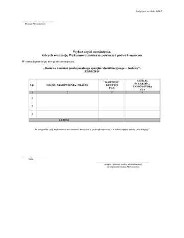 Załącznik nr 9 do SIWZ ………………………………… Pieczęć Wykonawcy Wykaz części zamówienia, których realizację Wykonawca zamierza powierzyć podwykonawcom W ramach przetargu nieograniczonego pn.: „Dostawa i montaż profesjonalnego sprzętu rehabilitacyjnego – dostawy”. ZP/05/2014 Lp. CZĘŚĆ ZAMÓWIENIA (PRACE) WARTOŚĆ BRUTTO PLN 1 2 3 UDZIAŁ W CAŁOŚCI ZAMÓWIENIA (%) 4 1 2 3 RAZEM W przypadku, gdy Wykonawca nie zamierza korzystać z podwykonawstwa – w tabeli wpisać należy „nie dotyczy” …………………………… Data ................................................................................... podpis i pieczęć osoby upoważnionej do reprezentowania Wykonawcy