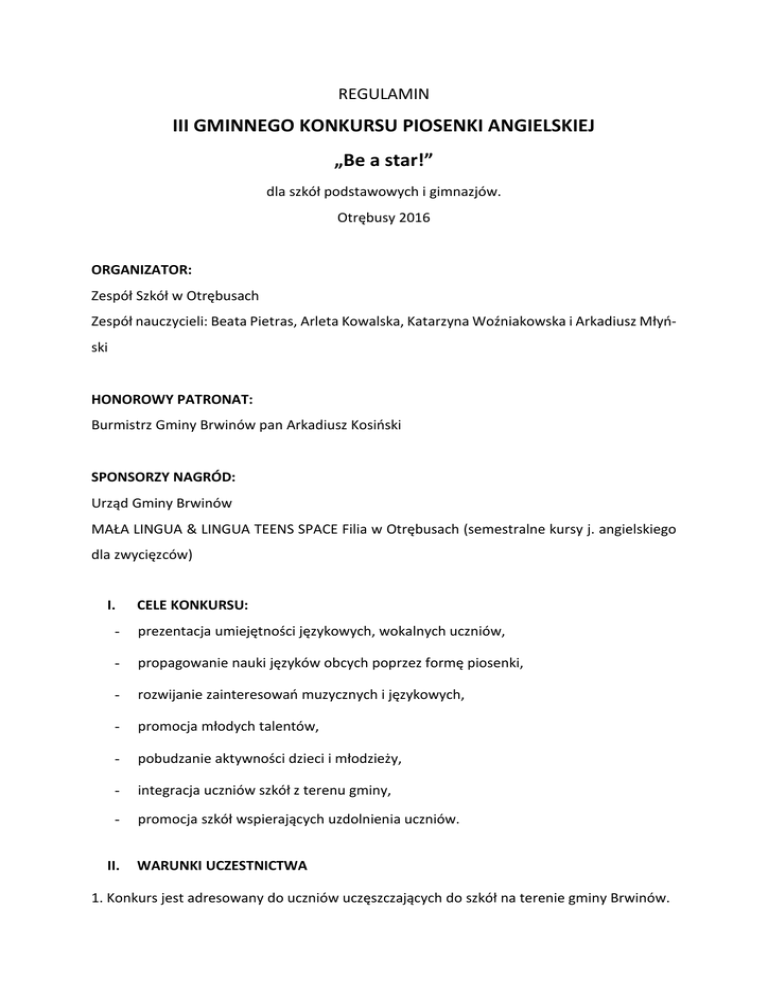 REGULAMIN III GMINNEGO KONKURSU PIOSENKI ANGIELSKIEJ „Be a star!” dla szkół podstawowych i gimnazjów. Otrębusy 2016 ORGANIZATOR: Zespół Szkół w Otrębusach Zespół nauczycieli: Beata Pietras, Arleta Kowalska, Katarzyna Woźniakowska i Arkadiusz Młyński HONOROWY PATRONAT: Burmistrz Gminy Brwinów pan Arkadiusz Kosiński SPONSORZY NAGRÓD: Urząd Gminy Brwinów MAŁA LINGUA & LINGUA TEENS SPACE Filia w Otrębusach (semestralne kursy j. angielskiego dla zwycięzców) I. CELE KONKURSU: - prezentacja umiejętności językowych, wokalnych uczniów, - propagowanie nauki języków obcych poprzez formę piosenki, - rozwijanie zainteresowań muzycznych i językowych, - promocja młodych talentów, - pobudzanie aktywności dzieci i młodzieży, - integracja uczniów szkół z terenu gminy, - promocja szkół wspierających uzdolnienia uczniów. II. WARUNKI UCZESTNICTWA 1. Konkurs jest adresowany do uczniów uczęszczających do szkół na terenie gminy Brwinów. 2. Konkurs ma charakter przeglądu w następujących kategoriach wiekowych: kl. I-III szkoła podstawowa, kl. IV-VI szkoła podstawowa, kl. I-III gimnazjum. W konkursie mogą wziąć udział: soliści, duety/tercety. 3. Każda szkoła przeprowadza wewnętrzne eliminacje, a następnie zgłasza maksymalnie dwie reprezentacje we wskazanej wyżej kategorii (np. solistę+duet/tercet, 2 solistów, 2 duety/tercety). 4. Warunkiem udziału w konkursie jest przygotowanie i prezentacja dowolnej piosenki w języku angielskim z podkładem muzycznym (nie dopuszcza się wersji a cappella). Po zgłoszeniu się do konkursu uczestnik nie ma możliwości zmiany repertuaru. 5. Czas wykonania piosenek nie może przekroczyć 5 minut. 6. Szkoły mogą zgłosić do konkursu uczestników w wybranych kategoriach poprzez nadesłanie na adres organizatorów: wypełnionej karty zgłoszenia - do 15.04.2016r. (załącznik 1 i załącznik 2) nagrania podkładu muzycznego (na płycie CD) w terminie do 18.04.2016r. Płytę należy opisać, podając: nazwę szkoły, tytuł piosenki, imię/imiona i nazwiska wykonawców. 7. Podkładem muzycznym podczas konkursu może być akompaniament własny bądź nagranie instrumentalne na płycie CD (bez słów*) * wyjątek stanowią uczniowie klas 1-3 szkoły podstawowej. 8. Piosenki, które będą wykonywane przez uczestników konkursu mogą być ich własną twórczością. 9. Uczeń musi rozumieć słowa piosenki. 10. Repertuar i ruch sceniczny zależą od inwencji twórczej uczestnika konkursu i podlegają ocenie. 11. Piosenki nie mogą zawierać niecenzuralnych treści. 12. Zgłoszenie kandydata jest równoznaczne z akceptacją regulaminu konkursu. III. JURY, OCENA, NAGRODY 1. Organizator powoła Jury, w składzie którego znajdą się: profesjonalni muzycy, nauczyciele języka angielskiego (po jednym przedstawicielu z każdej uczestniczącej szkoły), 2. 3. przedstawiciel sponsora nagród, przedstawiciel Burmistrza. Ocenie podlegać będą: dobór repertuaru do wieku i możliwości wykonawcy strona muzyczno-wokalna (walory głosowe, muzykalność), poprawność językowa, interpretacja prezentowanych utworów, ogólny wyraz artystyczny. Jury może przyznać: miejsca od 1-3 we wszystkich kategoriach, wyróżnienia. 4. Decyzje Jury są ostateczne. 5. Wszyscy uczestnicy konkursu otrzymają dyplomy uczestnictwa, a zwycięzcy dyplomy i nagrody rzeczowe. IV. POSTANOWIENIA KOŃCOWE 1. Zgłoszenie (załącznik 1 i załączniki 2) należy wypełnić i przesłać na adres organizatora: Zespół Szkół w Otrębusach ul. Piaseckiego 2 05-805 Otrębusy z dopiskiem III GMINNY KONKURS PIOSENKI ANGIELSKIEJ 2. Konkurs odbędzie się 25 kwietnia 2016 roku o godzinie 10.00 w Zespole Szkół w Otrębusach. 3. Harmonogram konkursu: 10:00 – uroczyste rozpoczęcie imprezy przez Burmistrza Gminy (lub jego przedstawiciela) i organizatorów 10:15 – 14:15 – przesłuchania konkursowe według ustalonego harmonogramu 14:45 – ogłoszenie wyników i wręczenie nagród 4. Informacja o wynikach zostanie zamieszczona na stronie internetowej organizatora. 5. Organizator zastrzega sobie prawo dysponowania danymi osobowymi uczestników konkursu, nagraniami, zdjęciami. Dane osobowe gromadzone są przez Organizatora wyłącznie na potrzeby realizacji Konkursu. 6. Uczestnicy przyjeżdżają na koszt własny. 7. Organizator zapewnia uczestnikom słodki poczęstunek i napój. Dane teleadresowe szkoły Adres: ul. Piaseckiego 2, 05-805 Otrębusy tel. +48 22 7585810 tel./fax+48 22 7585817 e-mail: [email protected] www: www.otrebusy.edu.pl