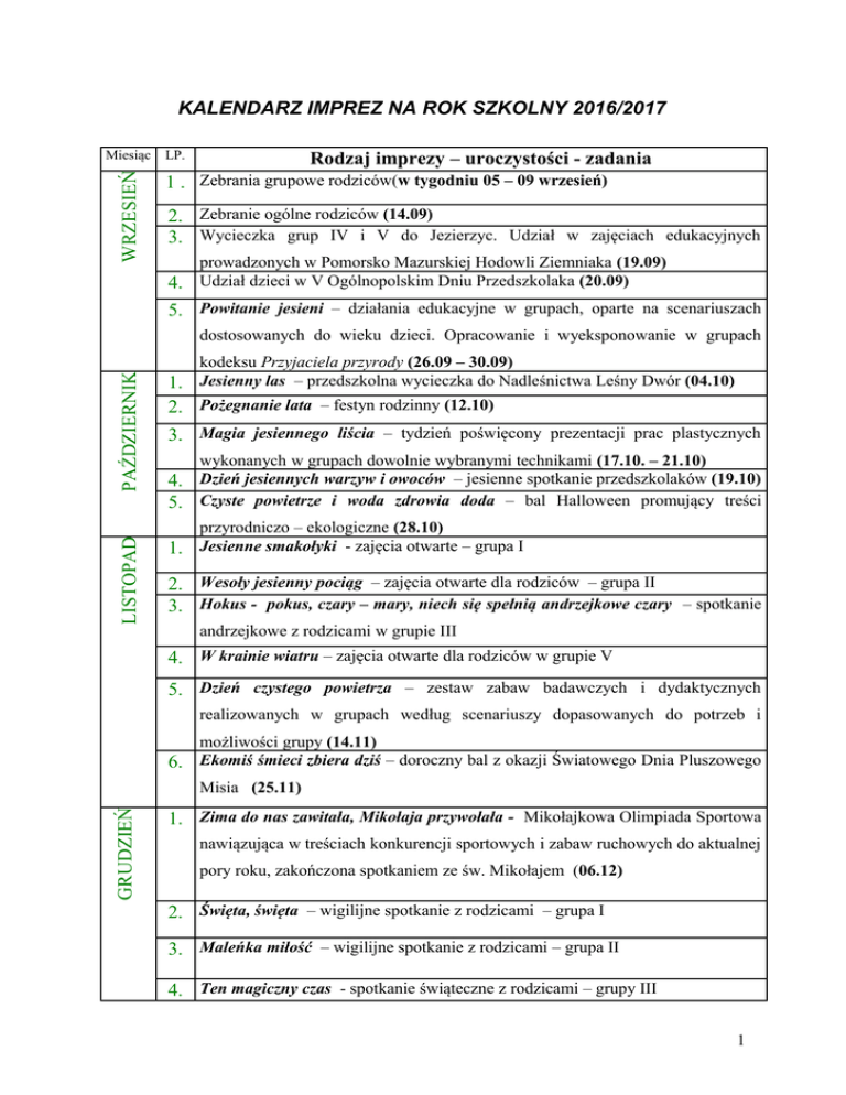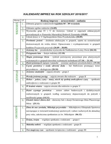 KALENDARZ IMPREZ NA ROK SZKOLNY 2016/2017 WRZESIEŃ Miesiąc LP. Rodzaj imprezy – uroczystości - zadania 1 . Zebrania grupowe rodziców(w tygodniu 05 – 09 wrzesień) 2. Zebranie ogólne rodziców (14.09) 3. Wycieczka grup IV i V do Jezierzyc. Udział w zajęciach edukacyjnych prowadzonych w Pomorsko Mazurskiej Hodowli Ziemniaka (19.09) 4. Udział dzieci w V Ogólnopolskim Dniu Przedszkolaka (20.09) 5. Powitanie jesieni – działania edukacyjne w grupach, oparte na scenariuszach LISTOPAD PAŹDZIERNIK dostosowanych do wieku dzieci. Opracowanie i wyeksponowanie w grupach kodeksu Przyjaciela przyrody (26.09 – 30.09) 1. Jesienny las – przedszkolna wycieczka do Nadleśnictwa Leśny Dwór (04.10) 2. Pożegnanie lata – festyn rodzinny (12.10) 3. Magia jesiennego liścia – tydzień poświęcony prezentacji prac plastycznych wykonanych w grupach dowolnie wybranymi technikami (17.10. – 21.10) 4. Dzień jesiennych warzyw i owoców – jesienne spotkanie przedszkolaków (19.10) 5. Czyste powietrze i woda zdrowia doda – bal Halloween promujący treści przyrodniczo – ekologiczne (28.10) 1. Jesienne smakołyki - zajęcia otwarte – grupa I 2. Wesoły jesienny pociąg – zajęcia otwarte dla rodziców – grupa II 3. Hokus - pokus, czary – mary, niech się spełnią andrzejkowe czary – spotkanie andrzejkowe z rodzicami w grupie III 4. W krainie wiatru – zajęcia otwarte dla rodziców w grupie V 5. Dzień czystego powietrza – zestaw zabaw badawczych i dydaktycznych realizowanych w grupach według scenariuszy dopasowanych do potrzeb i możliwości grupy (14.11) 6. Ekomiś śmieci zbiera dziś – doroczny bal z okazji Światowego Dnia Pluszowego GRUDZIEŃ Misia (25.11) 1. Zima do nas zawitała, Mikołaja przywołała - Mikołajkowa Olimpiada Sportowa nawiązująca w treściach konkurencji sportowych i zabaw ruchowych do aktualnej pory roku, zakończona spotkaniem ze św. Mikołajem (06.12) 2. Święta, święta – wigilijne spotkanie z rodzicami – grupa I 3. Maleńka miłość – wigilijne spotkanie z rodzicami – grupa II 4. Ten magiczny czas - spotkanie świąteczne z rodzicami – grupy III 1 5. Ekologiczne ozdoby świąteczne – zajęcia otwarte dla rodziców – grupa IV 6. Bożonarodzeniowe spotkanie z rodzicami połączone z prezentacją spektaklu STYCZEŃ jasełkowego – grupa V 7. Kolędowy czas – świąteczne spotkanie przedszkolaków (22.12) 1. Uroczyste spotkania grupowe z okazji Dnia Babci i Dziadka – przegląd dorobku muzyczno-tanecznego i teatralnego, wykorzystanie treści Bożonarodzeniowych i karnawałowych (wg harmonogramu imprez grup) 2. Ekologiczny karnawał – bal karnawałowy; uwzględnienie w scenariuszu balu zabaw i konkursów o tematyce przyrodniczo - ekologicznej. W programie Zimowy quiz matematyczny dostosowany poziomem wiadomości do poszczególnych grup wiekowych. 3. Dzień Ligi Przyrody – zajęcia przeprowadzone w grupach pogłębiające wiedzę dzieci o znaczeniu ekologii oraz zagrożonych gatunkach zwierząt i roślin. Spotkanie z przedstawicielem Ligi Ochrony Przyrody Zarząd Okręgu w Słupsku LUTY (09.01) 1. Śnieżna kraina – tydzień poświęcony prezentacji prac plastycznych wykonanych w grupach dowolnie wybranymi technikami (06.02 – 10.02) 2. Zima w lesie - wycieczka do lasu w związku z obchodami Światowego Dnia Dokarmiania Zwierząt Leśnych (11 luty) 3. 4. MARZEC 5. Walentynki – nasze uczucia – przedszkolna impreza integracyjna (14.02) Dary pola weźmiemy, pączki ugotujemy – bal początkowy (23.02) Pierwsza pomoc przedmedyczna – warsztaty dla dzieci z zakresu udzielania pierwszej pomocy 1. Przedszkolny pierwszy dzień wiosny zakończony zielony korowód na powitanie wiosny akcją Świat to nasza okolica – przedszkolne sprzątanie świata (21.03) 2. Wiosno, ach to ty –zajęcia otwarte - grupa I 3. Wiosenne spotkanie z panią Wiosną – warsztatowe spotkanie plastyczno – taneczne w grupie II 4. Mali przyrodnicy – zajęcia diagnozujące – grupa V 5. Światowy Dzień Wody - – zestaw zabaw badawczych i dydaktycznych realizowanych w grupach według scenariuszy dopasowanych do potrzeb i możliwości grupy (22.03) 2 6. Sztuka na talerzu - kulinarne zajęcia warsztatowe przeprowadzone w grupach w Dniu nowalijek z wykorzystaniem pierwszych wiosennych warzyw (24.03) 7. Zielona piosenka – Festiwal Piosenki Ekologicznej (30.03) 1. Pisanki, pisanki, jajka wielkanocne – zajęcia otwarte – grupa I 2. Awantura o jajka – wielkanocne spotkanie z rodzicami – grupa II (11.04) KWIECIEŃ 3. To już Wielkanoc – zajęcia otwarte z rodzicami w grupie III 4. Wielkanocne zwyczaje – wielkanocne spotkanie z rodzicami połączone z prezentacją spektaklu – grupa IV 5. W wielkanocnej krainie – świąteczne spotkanie z rodzicami – grupa V 6. Zielony plac przedszkolny – przedszkolna impreza integracyjna z okazji Dnia Ziemi połączona z sadzeniem drzew w ogrodzie przedszkolnym (21.04) 7. Poszukiwacze ciszy – organizacja w grupach zabaw dźwiękowych i relaksacyjnych w Międzynarodowym Dniu Świadomego Zagrożenia Hałasem (25.04) 5. Eko – zabawy, konkursy, zagadki dla przedszkolnej gromadki – Międzygrupowy Turniej Wiedzy Ekologicznej (26.04) 1. Ci co mruczą i szczekają nas do siebie zapraszają – akcja zbiórki karmy dla MAJ zwierząt i przekazania jej w trakcie wycieczki do schroniska dla zwierząt (04-12 maj) 2. Ekomama – przyjaciel mój i Ziemi – festyn rodzinny (27.05) Finał konkursu fotograficznego Cztery pory roku w przyrodzie 3. Udział dzieci w marszu godności i Festynie z okazji Dnia Godności Osób Niepełnosprawnych, prezentacja programu artystycznego grup IV i V 1. Tygodniowy cykl imprez z okazji Dnia Dziecka (29.05. – 02.06.): w programie CZERWIEC między innymi: 2. Przedszkolak kinomaniakiem Tajemnice Leśnego Kota Na łonie natury Letnia Olimpiada Sportowa Tajemnice Słowińskiego Parku Narodowego - wycieczka Garden Party małego ekologa – bal przedszkolaków na zakończ