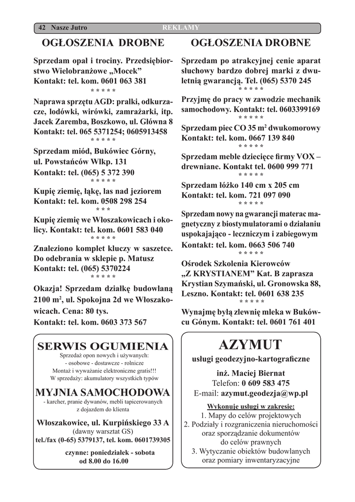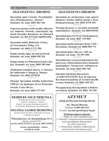 42 Nasze Jutro REKLAMY Ogłoszenia drobne OGŁOSZENIA DROBNE Sprzedam opał i trociny. Przedsiębiorstwo Wielobranżowe „Mocek” Kontakt: tel. kom. 0601 063 381 Sprzedam po atrakcyjnej cenie aparat słuchowy bardzo dobrej marki z dwuletnią gwarancją. Tel. (065) 5370 245 ***** Naprawa sprzętu AGD: pralki, odkurzacze, lodówki, wirówki, zamrażarki, itp. Jacek Zaremba, Boszkowo, ul. Główna 8 Kontakt: tel. 065 5371254; 0605913458 ***** Sprzedam miód, Bukówiec Górny, ul. Powstańców Wlkp. 131 Kontakt: tel. (065) 5 372 390 ***** Kupię ziemię, łąkę, las nad jeziorem Kontakt: tel. kom. 0508 298 254 *** Kupię ziemię we Włoszakowicach i okolicy. Kontakt: tel. kom. 0601 583 040 ***** Znaleziono komplet kluczy w saszetce. Do odebrania w sklepie p. Matusz Kontakt: tel. (065) 5370224 ***** Okazja! Sprzedam działkę budowlaną 2100 m2, ul. Spokojna 2d we Włoszakowicach. Cena: 80 tys. Kontakt: tel. kom. 0603 373 567 Serwis ogumienia Sprzedaż opon nowych i używanych: - osobowe - dostawcze - rolnicze Montaż i wyważanie elektroniczne gratis!!! W sprzedaży: akumulatory wszystkich typów Myjnia samochodowa - karcher, pranie dywanów, mebli tapicerowanych z dojazdem do klienta Włoszakowice, ul. Kurpińskiego 33 A (dawny warsztat GS) tel./fax (0-65) 5379137, tel. kom. 0601739305 czynne: poniedziałek - sobota od 8.00 do 16.00 ***** Przyjmę do pracy w zawodzie mechanik samochodowy. Kontakt: tel. 0603399169 ***** Sprzedam piec CO 35 m2 dwukomorowy Kontakt: tel. kom. 0667 139 840 ***** Sprzedam meble dziecięce firmy VOX – drewniane. Kontakt tel. 0600 999 771 ***** Sprzedam łóżko 140 cm x 205 cm Kontakt: tel. kom. 721 097 090 ***** Sprzedam nowy na gwarancji materac magnetyczny z biostymulatorami o działaniu uspokajająco - leczniczym i zabiegowym Kontakt: tel. kom. 0663 506 740 ***** Ośrodek Szkolenia Kierowców „Z KRYSTIANEM” Kat. B zaprasza Krystian Szymański, ul. Gronowska 88, Leszno. Kontakt: tel. 0601 638 235 ***** Wynajmę byłą zlewnię mleka w Bukówcu Gónym. Kontakt: tel. 0601 761 401 AZYMUT usługi geodezyjno-kartograficzne inż. Maciej Biernat Telefon: 0 609 583 475 E-mail: [email protected] Wykonuje usługi w zakresie: 1. Mapy do celów projektowych 2. Podziały i rozgraniczenia nieruchomości oraz sporządzanie dokumentów do celów prawnych 3. Wytyczanie obiektów budowlanych oraz pomiary inwentaryzacyjne