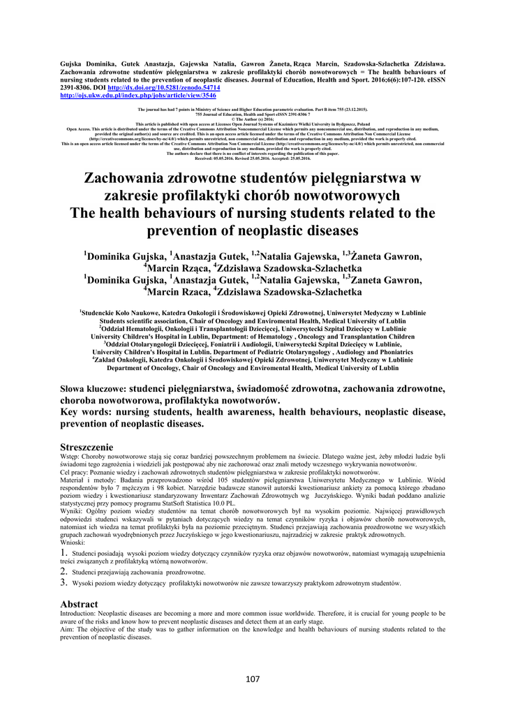 Gujska Dominika, Gutek Anastazja, Gajewska Natalia, Gawron Żaneta, Rząca Marcin, Szadowska-Szlachetka Zdzisława. Zachowania zdrowotne studentów pielęgniarstwa w zakresie profilaktyki chorób nowotworowych = The health behaviours of nursing students related to the prevention of neoplastic diseases. Journal of Education, Health and Sport. 2016;6(6):107-120. eISSN 2391-8306. DOI http://dx.doi.org/10.5281/zenodo.54714 http://ojs.ukw.edu.pl/index.php/johs/article/view/3546 The journal has had 7 points in Ministry of Science and Higher Education parametric evaluation. Part B item 755 (23.12.2015). 755 Journal of Education, Health and Sport eISSN 2391-8306 7 © The Author (s) 2016; This article is published with open access at Licensee Open Journal Systems of Kazimierz Wielki University in Bydgoszcz, Poland Open Access. This article is distributed under the terms of the Creative Commons Attribution Noncommercial License which permits any noncommercial use, distribution, and reproduction in any medium, provided the original author(s) and source are credited. This is an open access article licensed under the terms of the Creative Commons Attribution Non Commercial License (http://creativecommons.org/licenses/by-nc/4.0/) which permits unrestricted, non commercial use, distribution and reproduction in any medium, provided the work is properly cited. This is an open access article licensed under the terms of the Creative Commons Attribution Non Commercial License (http://creativecommons.org/licenses/by-nc/4.0/) which permits unrestricted, non commercial use, distribution and reproduction in any medium, provided the work is properly cited. The authors declare that there is no conflict of interests regarding the publication of this paper. Received: 05.05.2016. Revised 25.05.2016. Accepted: 25.05.2016. Zachowania zdrowotne studentów pielęgniarstwa w zakresie profilaktyki chorób nowotworowych The health behaviours of nursing students related to the prevention of neoplastic diseases 1 Dominika Gujska, 1Anastazja Gutek, 1,2Natalia Gajewska, 1,3Żaneta Gawron, 4 Marcin Rząca, 4Zdzisława Szadowska-Szlachetka 1 Dominika Gujska, 1Anastazja Gutek, 1,2Natalia Gajewska, 1,3Zaneta Gawron, 4 Marcin Rzaca, 4Zdzislawa Szadowska-Szlachetka 1 Studenckie Koło Naukowe, Katedra Onkologii i Środowiskowej Opieki Zdrowotnej, Uniwersytet Medyczny w Lublinie Students scientific association, Chair of Oncology and Enviromental Health, Medical University of Lublin 2 Oddział Hematologii, Onkologii i Transplantologii Dziecięcej, Uniwersytecki Szpital Dziecięcy w Lublinie University Children's Hospital in Lublin, Department: of Hematology , Oncology and Transplantation Children 3 Oddział Otolaryngologii Dziecięcej, Foniatrii i Audiologii, Uniwersytecki Szpital Dziecięcy w Lublinie, University Children's Hospital in Lublin. Department of Pediatric Otolaryngology , Audiology and Phoniatrics 4 Zakład Onkologii, Katedra Onkologii i Środowiskowej Opieki Zdrowotnej, Uniwersytet Medyczny w Lublinie Department of Oncology, Chair of Oncology and Enviromental Health, Medical University of Lublin Słowa kluczowe: studenci pielęgniarstwa, świadomość zdrowotna, zachowania zdrowotne, choroba nowotworowa, profilaktyka nowotworów. Key words: nursing students, health awareness, health behaviours, neoplastic disease, prevention of neoplastic diseases. Streszczenie Wstęp: Choroby nowotworowe stają się coraz bardziej powszechnym problemem na świecie. Dlatego ważne jest, żeby młodzi ludzie byli świadomi tego zagrożenia i wiedzieli jak postępować aby nie zachorować oraz znali metody wczesnego wykrywania nowotworów. Cel pracy: Poznanie wiedzy i zachowań zdrowotnych studentów pielęgniarstwa w zakresie profilaktyki nowotworów. Materiał i metody: Badania przeprowadzono wśród 105 studentów pielęgniarstwa Uniwersytetu Medycznego w Lublinie. Wśród respondentów było 7 mężczyzn i 98 kobiet. Narzędzie badawcze stanowił autorski kwestionariusz ankiety za pomocą którego zbadano poziom wiedzy i kwestionariusz standaryzowany Inwentarz Zachowań Zdrowotnych wg Juczyńskiego. Wyniki badań poddano analizie statystycznej przy pomocy programu StatSoft Statistica 10.0 PL. Wyniki: Ogólny poziom wiedzy studentów na temat chorób nowotworowych był na wysokim poziomie. Najwięcej prawidłowych odpowiedzi studenci wskazywali w pytaniach dotyczących wiedzy na temat czynników ryzyka i objawów chorób nowotworowych, natomiast ich wiedza na temat profilaktyki była na poziomie przeciętnym. Studenci przejawiają zachowania prozdrowotne we wszystkich grupach zachowań wyodrębnionych przez Juczyńskiego w jego kwestionariuszu, najrzadziej w zakresie praktyk zdrowotnych. Wnioski: 1. Studenci posiadają wysoki poziom wiedzy dotyczący czynników ryzyka oraz objawów nowotworów, natomiast wymagają uzupełnienia treści związanych z profilaktyką wtórną nowotworów. 2. 3. Studenci przejawiają zachowania prozdrowotne. Wysoki poziom wiedzy dotyczący profilaktyki nowotworów nie zawsze towarzyszy praktykom zdrowotnym studentów. Abstract Introduction: Neoplastic diseases are becoming a more and more common issue worldwide. Therefore, it is crucial for young people to be aware of the risks and know how to prevent neoplastic diseases and detect them at an early stage. Aim: The objective of the study was to gather information on the knowledge and health behaviours of nursing students related to the prevention of neoplastic diseases. 107 Material and methods: The survey was carried out among 105 students of nursing from the Medical University of Lublin. The survey group consisted of 7 men and 98 women. The questionnaire prepared by the authors and the standardised Health Behaviour Inventory by Juczyński were used as research tools for identifying the level of the students' knowledge. The statistical analysis of the survey results was carried out with the use of the StatSoft Statistica 10.0 PL software. Results: The general