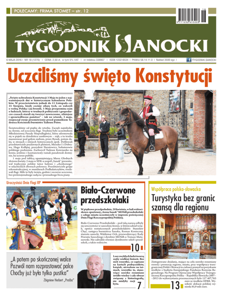 POLECAMY: FRIMA STOMET – str. 12 6 MAJA 2016 | NR 18 (1270) | CENA: 2,50 zł, w tym 5% VAT | nr indeksu 338907 | ISSN 1232-6534 | PKWiU 58.14.11.0 | Nakład 3500 egz. | /TYGODNIK.SANOCKI Uczciliśmy święto Konstytucji „Święto uchwalenia Konstytucji 3 Maja to jeden z najważniejszych dni w historycznym kalendarzu Polaków. W przeciwieństwie jednak do 11 Listopada czy 15 Sierpnia, kiedy czcimy o�arę tych, co walczyli o wolną Polskę i jej bronili, 3 Maja przypomina nam o ludziach, którzy w trudnych politycznie i gospodarczo czasach starali się tworzyć nowoczesne, silniejsze i sprawiedliwsze państwo” – tak we wtorek, 3 maja, rozpoczął swoje przemówienie przed pomnikiem Tadeusza Kościuszki burmistrz Tadeusz Pióro. Świętowaliśmy od piątku do wtorku. Zaczęli najmłodsi, na Arenie, od uczczenia �agi. Trudniej było uczestnikom Młodzieżowej Parady Niepodległości, która uformowała się w piątek na dziedzińcu zamkowym – ziąb, a tu trzeba maszerować pod gołym niebem, przez Rynek, potem dalej, w strojach z różnych historycznych epok. De�lowali przedstawiciele pradawnych plemion, Mieszko I i Dobrawa, Hugo Kołłątaj, prezydent Narutowicz, bohaterowie polskiego podziemia. Zachwycił Tadeusz Kościuszko na koniu; jeździec i kasztanowaty rumak paradowali dostojnie, ku uciesze publiki. 1 maja pod tablicą upamiętniającą Marsz Głodnych złożono kwiaty. 2 maja w SDK-u zespół „Sanok” prezentował tradycyjne polskie tańce ludowe i „chodzonego” w szlacheckich dworach poloneza. Przedstawiciele grupy rekonstrukcyjnej, w mundurach Podhalańczyków, rozdawali �agi. Miłe to były święta, godnie i szczerze uczczone, bez pretensjonalnego zadęcia i przesadnego bicia piany. Uroczystości Dnia Flagi RP Biało-Czerwone przedszkolaki Współpraca polsko-słowacka W piątkowe przedpołudnie, 29 kwietnia, w hali widowiskowo-sportowej „Arena Sanok” MOSiR przedszkolaki z całego miasta uczestniczyły w imprezie poświęconej Dniu Flagi Rzeczypospolitej Polskiej. Turystyka bez granic szansą dla regionu Biało-Czerwone Przedszkolaki – pod taką nazwą odbyły się uroczystości w sanockiej Arenie, w której udział wzięli, oprócz roztańczonych przedszkolaków: Stanisław Chęć, zastępca burmistrza Sanoka, Roman Konieczny, starosta sanocki, Waldemar Och, przewodniczący Rady Powiatu Sanockiego i dyrektor MOSiR-u Tomasz Matuszewski. Nie zabrakło również dyrektorów szkół i przedszkoli, a także rodziców. 10 „A potem po skończonej walce Pozwól nam rozprostować palce Choćby już była tylko pustka” Zbigniew Herbert „Prośba” Losy zwykłych ludzi tworzą zręby wielkiej historii. Bez nich wszystko, co zapisane na kartach podręczników, książek, utrwalone na taśmach, wszystko to, stanowiące szeroko rozumiane źródło wiedzy i cały obszar związany z historiogra�ą, nie miałyby racji bytu. 7 Zintegrowane działania, mające na celu szeroko rozumiany rozwój i promocję regionu, miasta, przy współpracy transgranicznej Polski i Słowacji to ciekawy pomysł na pozyskanie środków z budżetu Europejskiego Funduszu Rozwoju Regionalnego. Na Program Operacyjny Współpracy Transgranicznej Rzeczpospolita Polska – Republika Słowacka 2007– –2013 do wykorzystania przeznaczonych było 157 407,763 euro ze środków EFRR. Wysokość alokacji polskiej wyniosła 85,9 mln euro. 13 2 Z TYGODNIA NA TYDZIEŃ Dziś w numerze Wolontariusze docenieni Bruksela bez reklam, tonąca w zieleni Dwie najaktywniejsze wolontariuszki: emerytka Anna Kopiec i licealistka Maria Berdysz, wyróżnione tytułem „Wolontariusz Roku 2015”, oraz Agnieszka Marcinik z „ekonomika”, laureatka konkursu literackiego, pojechały z wizytą do Brukseli. Wycieczka była podziękowaniem i nagrodą za zaangażowanie i pracę w Powiatowym Centrum Wolontariatu. Sanoczanki mówią, że Bruksela, mimo niedawnych ataków terrorystycznych, nadal jest spokojnym i uroczym miastem. ski podpowie, co można zrobić, by odechciało się w kółko biadolić... W powiecie, niestety, nie udało się uniknąć biadolenia: szkoły, szpital, korupcja wyborcza – Jolanta Ziobro relacjonuje dla Państwa to wszystko. Na ulice wysypali się maturzyści. Są młodzi, pięknie się prezentują w odświętnych ubraniach, na twarzach jeszcze zawadiacki uśmiech, ale już i cień jakiś się skrada, bo przed nimi przecież egzamin dojrzałości. Czy za współczesną formalną dojrzałością podąża odpowiedzialność? Zastanawialiśmy się nad tym ostatnio w redakcji, może spróbujemy wkrótce coś napisać. Janina Lewandowska i Janusz Szuber poddali pomysł, by w budynku Miejskiej Biblioteki Publicznej znalazła się tablica, upamiętniającą Mariana Pankowskiego. „Tygodnik Sanocki” jest „za”. – To już nasza tradycja. Praca w wolontariacie jest całkowicie bezinteresowna i bezpłatna, niemniej staramy się doceniać naszych wspaniałych wolontariuszy – mówi Czesława Kurasz, prezes PCW. Jedną z nagród jest wycieczka do Brukseli, którą od kilku lat funduje europosłanka PO Elżbieta Łukacijewska. – Pani poseł wspiera nasze działania, nie tylko w ramach PCW, ale też Uniwersytetu III Wieku. Dzięki niej wielu sanoczan zaangażowanych |w wolontariat i pracę społeczną miało okazję gościć w Brukseli i Parlamencie Europejskim – podkreśla nasza rozmówczyni. W tym roku tytuł „Wolontariusz Roku 2015” przyznano dwóm fantastycznym kobietom: Marii Berdysz z II LO i Annie Kopiec z Uni- Pamiątkowa fotka z europosłanką Elżbietą Łukacijewską, która od lat zaprasza do Brukseli wolontariuszy z Powiatowego Centrum Wolontariatu i Uniwersytetu III Wieku Doniesienia z Parlamentu Europejskiego Via Carpathia dla rozwoju Europy Wschodniej Komisja Rozwoju Regionalnego Parlamentu Europejskiego (REGI) przyjęła opinię, w której podkreśla znaczenie budowy szlaku Via Carpathia i wskazuje na możliwość utworzenia strategii makroregionalnej dla regionu Kar