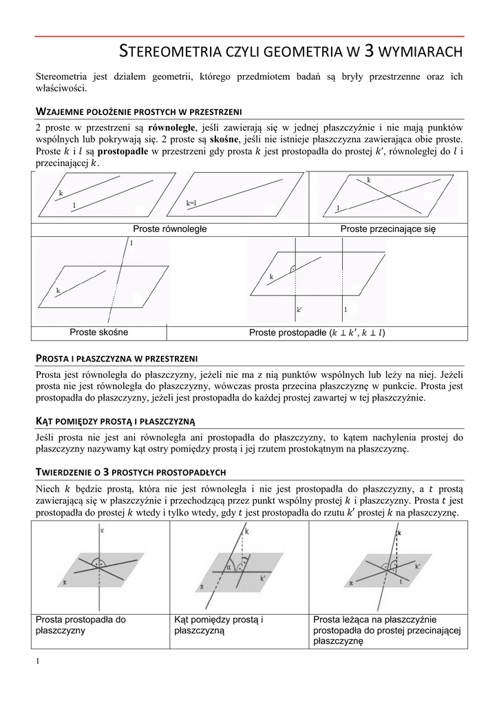 STEREOMETRIA CZYLI GEOMETRIA W 3 WYMIARACH Stereometria jest działem geometrii, którego przedmiotem badań są bryły przestrzenne oraz ich właściwości. WZAJEMNE POŁOŻENIE PROSTYCH W PRZESTRZENI 2 proste w przestrzeni są równoległe, jeśli zawierają się w jednej płaszczyźnie i nie mają punktów wspólnych lub pokrywają się. 2 proste są skośne, jeśli nie istnieje płaszczyzna zawierająca obie proste. Proste i są prostopadłe w przestrzeni gdy prosta jest prostopadła do prostej , równoległej do i przecinającej . Proste równoległe Proste skośne Proste przecinające się Proste prostopadłe ( , ) PROSTA I PŁASZCZYZNA W PRZESTRZENI Prosta jest równoległa do płaszczyzny, jeżeli nie ma z nią punktów wspólnych lub leży na niej. Jeżeli prosta nie jest równoległa do płaszczyzny, wówczas prosta przecina płaszczyznę w punkcie. Prosta jest prostopadła do płaszczyzny, jeżeli jest prostopadła do każdej prostej zawartej w tej płaszczyźnie. KĄT POMIĘDZY PROSTĄ I PŁASZCZYZNĄ Jeśli prosta nie jest ani równoległa ani prostopadła do płaszczyzny, to kątem nachylenia prostej do płaszczyzny nazywamy kąt ostry pomiędzy prostą i jej rzutem prostokątnym na płaszczyznę. TWIERDZENIE O 3 PROSTYCH PROSTOPADŁYCH Niech będzie prostą, która nie jest równoległa i nie jest prostopadła do płaszczyzny, a prostą zawierającą się w płaszczyźnie i przechodzącą przez punkt wspólny prostej i płaszczyzny. Prosta jest prostopadła do prostej wtedy i tylko wtedy, gdy jest prostopadła do rzutu prostej na płaszczyznę. Prosta prostopadła do płaszczyzny 1 Kąt pomiędzy prostą i płaszczyzną Prosta leżąca na płaszczyźnie prostopadła do prostej przecinającej płaszczyznę PŁASZCZYZNY W PRZESTRZENI Płaszczyznę w przestrzeni jednoznacznie wyznaczają: 3 niewspółliniowe punkty 2 przecinające się proste Prosta i punkt poza nią 2 różne proste równoległe Płaszczyzny nazywamy równoległymi, jeżeli nie mają punktów wspólnych lub pokrywają się. Płaszczyzny, które nie są równoległe przecinają się. Częścią wspólną dwóch przecinających się płaszczyzn jest prosta. Dwie płaszczyzny nazywamy prostopadłymi, jeżeli istnieje taka prosta, która zawiera się w jednej z tych płaszczyzn i jest prostopadła do drugiej płaszczyzny. Płaszczyzny przecinają się wzdłuż prostej Płaszczyzny prostopadłe Kątem dwuściennym nazywamy zbiór złożony z dwóch półpłaszczyzn o wspólnej krawędzi i jednej z dwóch figur wyciętych z przestrzeni przez sumę tych półpłaszczyzn. Kątem liniowym kąta dwuściennego nazywamy kąt płaski otrzymany w wyniku przecięcia kąta dwuściennego płaszczyzną prostopadłą do jego krawędzi. Miarą kąta dwuściennego nazywamy miarę jego kąta liniowego. Odległość punktu od płaszczyzny jest równa odległości tego punktu od jego rzutu prostokątnego na płaszczyznę. A' - rzut prostokątny punktu A na płaszczyznę p. - odległość punktu A od płaszczyzny p. Kąt dwuścienny 2 Odległość punktu od płaszczyzny FIGURY PRZESTRZENNE (BRYŁY) Figurę nazywamy przestrzenną (bryłą), jeżeli nie zawiera się w żadnej płaszczyźnie. Figurę w przestrzeni nazywamy ograniczoną, jeżeli zawiera się w pewnej kuli. Figurę w przestrzeni nazywamy nieograniczoną, jeżeli nie zawiera się w żadnej kuli. WIELOŚCIANY Bryłę nazywamy wielościanem, jeżeli jej brzeg jest sumą skończonej liczby wielokątów, zwanych ścianami wielościanu, przy czym: 1. Jeśli dwa wielokąty zawierają się w jednej płaszczyźnie, to mają co najwyżej jeden punkt wspólny, 2. Każde dwa punkty brzegowe bryły można połączyć łamaną zawartą w jej brzegu. Boki ścian wielościanu nazywamy krawędziami, a wierzchołki ścian - wierzchołkami wielościanu. Twierdzenie Eulera. Jeśli wielościan wypukły ma w wierzchołków, k krawędzi i s ścian, to GRANIASTOSŁUP Graniastosłupem nazywamy wielościan, którego dwie ściany, zwana podstawami, są przystającymi wielokątami leżącymi w płaszczyznach równoległych, a pozostałe ściany, zwane ścianami bocznymi, są równoległobokami, których wszystkie wierzchołki są jednocześnie wierzchołkami podstaw. Graniastosłupy dzielimy na: proste – krawędzie boczne są prostopadłe do podstaw pochyłe – jego krawędzie boczne nie są prostopadłe do podstaw prawidłowe – o podstawach będących wielokątami foremnymi równoległościany – podstawą jest równoległobok, a przeciwległe ściany są równoległe prostopadłościany – wszystkie ściany to prostokąty sześciany – wszystkie ściany to kwadraty Wysokość graniastosłupa jest to odległość między podstawami. Przekątna graniastosłupa jest to odcinek łączący dwa wierzchołki nie leżące na jednej ścianie. OSTROSŁUP Ostrosłupem nazywamy wielościan, którego podstawa jest dowolnym wielokątem, a ściany boczne są trójkątami o wspólnym wierzchołku S, który nazywamy wierzchołkiem ostrosłupa. Wysokość ostrosłupa to odległość wierzchołka od podstawy.Ostrosłupy dzielimy na: proste – na podstawie których można opisać okrąg, a punkt w którym wysokość styka się z podstawą, jest jednocześnie środkiem tego okręgu czworościany – o podstawie trójkąta prawidłowe –krawędzie boczne są równej długości a podstawą jest wielokąt foremny KĄTY W W GRANIASTOSŁUPACH I OSTROSŁUPACH Kątem nachylenia ściany bocznej do podstawy (zarówno dla graniastosłupa jak i ostrosłupa) nazywamy kąt pomiędzy prostą prostopadłą do krawędzi podstawy, leżącą w płaszczyźnie tej ściany i podstawą. Kątem nachylenia krawędzi ściany bocznej do podstawy nazywamy zaś kąt pomiędzy tą krawędzią i podstawą. Kąt nachylenia ścian bocznych jest to kąt pomiędzy płaszczyznami tych ścian. 3 Wielościanem foremnym (bryłą platońską) nazywamy wielościan wypukły, którego ściany są przystającymi wielokątami foremnymi. Oto WSZYSTKIE