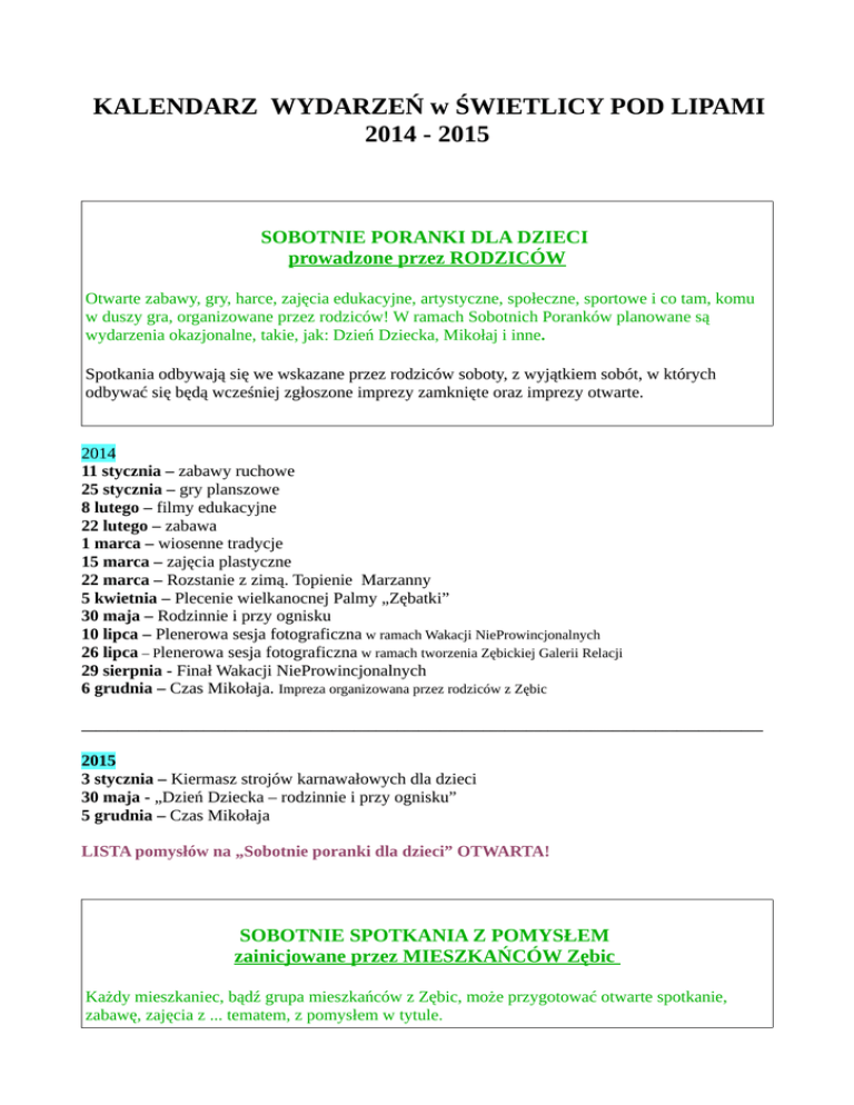 KALENDARZ WYDARZEŃ w ŚWIETLICY POD LIPAMI 2014 - 2015 SOBOTNIE PORANKI DLA DZIECI prowadzone przez RODZICÓW Otwarte zabawy, gry, harce, zajęcia edukacyjne, artystyczne, społeczne, sportowe i co tam, komu w duszy gra, organizowane przez rodziców! W ramach Sobotnich Poranków planowane są wydarzenia okazjonalne, takie, jak: Dzień Dziecka, Mikołaj i inne. Spotkania odbywają się we wskazane przez rodziców soboty, z wyjątkiem sobót, w których odbywać się będą wcześniej zgłoszone imprezy zamknięte oraz imprezy otwarte. 2014 11 stycznia – zabawy ruchowe 25 stycznia – gry planszowe 8 lutego – filmy edukacyjne 22 lutego – zabawa 1 marca – wiosenne tradycje 15 marca – zajęcia plastyczne 22 marca – Rozstanie z zimą. Topienie Marzanny 5 kwietnia – Plecenie wielkanocnej Palmy „Zębatki” 30 maja – Rodzinnie i przy ognisku 10 lipca – Plenerowa sesja fotograficzna w ramach Wakacji NieProwincjonalnych 26 lipca – Plenerowa sesja fotograficzna w ramach tworzenia Zębickiej Galerii Relacji 29 sierpnia - Finał Wakacji NieProwincjonalnych 6 grudnia – Czas Mikołaja. Impreza organizowana przez rodziców z Zębic _______________________________________________________________________________________________ 2015 3 stycznia – Kiermasz strojów karnawałowych dla dzieci 30 maja - „Dzień Dziecka – rodzinnie i przy ognisku” 5 grudnia – Czas Mikołaja LISTA pomysłów na „Sobotnie poranki dla dzieci” OTWARTA! SOBOTNIE SPOTKANIA Z POMYSŁEM zainicjowane przez MIESZKAŃCÓW Zębic Każdy mieszkaniec, bądź grupa mieszkańców z Zębic, może przygotować otwarte spotkanie, zabawę, zajęcia z ... tematem, z pomysłem w tytule. Z wyjątkiem sobót, w których odbywać się będą imprezy wcześniej zgłoszone. 2014 18 stycznia - I figura Karnawałowego Kalejdoskopu – Z muzyką lat 80. w tle 1 lutego - II figura Karnawałowego Kalejdoskopu – Lata 70. 14 lutego - III figura Karnawałowego Kalejdoskopu – Walentynki – Love 1 marca – IV figura Karnawałowego Kalejdoskopu – Ostatki - „Na luzie” 4 marca – V figura Karnawałowego Kalejdoskopu – Śledzik – „Po PRLowsku” 9 marca – „Czekoladowe spotkanie w gronie Pań” 5 kwietnia - Plecenie PALMY "ZĘBATKI" 30 maja - „Rodzinnie – przy ognisku” 28 czerwca - „Na ławeczce” 5 lipca - „Na drugiej ławeczce” 20 lipca – „Spotkanie u Irenki”. Sesja fotograficzna z wykorzystaniem techniki kolodionowej. 26 lipca – Sesja fotograficzna na polu państwa Zdobylaków w ramach tworzenia Zębickiej Galerii Relacji 27 września – Wykopki „Na Polu Zdobylaków” 27 grudnia – Kolędowanie w Świetlicy Pod Lipami 2015 17 stycznia – I figura Karnawałowego Kalejdoskopu – Z fantazyjnym nakryciem głowy 31 stycznia – II figura Karnawałowego Kalejdoskopu 14 lutego – III figura Karnawałowego Kalejdoskopu 17 lutego – IV figura Karnawałowego Kalejdoskopu 7 marca – Wieczór „Na wysokich obcasach” LISTA pomysłów na „Sobotnie spotkania” OTWARTA! ZĘBICKIE SPOTKANIA W RYTMIE PÓR ROKU Od czterech lat - zębicka tradycja świętowania zmian pór roku! Organizatorzy: Rada Sołecka, Stowarzyszenie Teraz Gmina, Mieszkańcy Zębic 2014 13 czerwca - Zębicka Noc ŚWIĘTOJAŃSKA 30 sierpnia - Zębickie BABIE LATO 2015 20 czerwca - Zębicka Noc Świętojańska 29 sierpnia - Zębickie Babie Lato WAKACJE NiePROWINCJONALNE Zajęcia dla dzieci z Zębic i z sąsiednich miejscowości realizowane podczas letnich wakacji Organizator: Stowarzyszenie Teraz Gmina 2014 lipiec - sierpień lipiec 2 lipca – Spotkanie organizacyjne dla dzieci i rodziców 8 wtorek – zajęcia ogólnorozwojowe 10 czwartek – zajęcia fotograficzne 15 wtorek – zajęcia ogólnorozwojowe 17 czwartek – zajęcia artystyczne 22 wtorek – zajęcia ogólnorozwojowe 24 czwartek – zajęcia artystyczne 29 wtorek – zajęcia ogólnorozwojowe 31 czwartek – zajęcia sportowe sierpień 5 wtorek – zajęcia ogólnorozwojowe 7 czwartek – zajęcia artystyczne 12 wtorek – zajęcia ogólnorozwojowe 14 czwartek – zajęcia artystyczne 19 wtorek – zajęcia ogólnorozwojowe 21 czwartek – zajęcia fotograficzne 26 wtorek – zajęcia ogólnorozwojowe 28 czwartek – zajęcia sportowe 29 piątek – Finał Wakacji NieProwincjonalnych 2015 KONTYNUACJA Zębicka GALERIA RELACJI Sesje fotograficzne mieszkańców Zębic zakończone fotograficzną wystawą Organizator: Stowarzyszenie Teraz Gmina 2014 10 lipca – zajęcia fotograficzne dla grupy dzieci 19 lipca – indywidualne sesje fotograficzne dla najstarszych mieszkańców Zębic. Fotografie wykonywane techniką kolodionową 20 lipca – sesja fotograficzna dla grupy osób 55(+), dorastających i wychowujących się w Zębicach. Fotografie wykonywane techniką kolodionową i cyfrową 26 lipca – sesja fotograficzna na polu państwa Zdobylaków 21 sierpnia– zajęcia fotograficzne dla grupy dzieci 30 sierpnia - OTWARCIE wystawy, pt.: „Zębicka Galeria Relacji” 7 września - Zębicka Galeria Relacji na Dożynkach Gminnych w Świętej Katarzynie 1- 21 października - Zębicka Galeria Relacji w holu Starostwa Powiatu Wrocławskiego 2015 KONTYNUACJA CZAS PLAŻOWEJ PIŁKI SIATKOWEJ Rozgrywki piłki plażowej organizowane przez pasjonatów siatkówki, na boisku do gry w siatkę plażową, wybudowanym z dużym wkładem społecznej energii. Wakacyjny KURS KOMPUTEROWY dla początkujących Projekt:"Certyfikowane kursy komputerowe ECCC", współfinansowanego ze środków Unii Europejskiej, w ramach Europejskiego Funduszu Społecznego, Programu Operacyjnego Kapitał Ludzki Organizator: Euro-Capital Doradztwo Gospodarcze 2014 1 lipca – zebranie organizacyjne 27, 28, 30 lipca (niedziela, poniedziałek, środa, od 17.00 do 21.40) 3, 4, 6 sierpnia (niedziela od 16.15 do 21.40, poniedziałek i środa, od 17. 00 do 21.40) 10, 11, 13 sierpnia (niedziela od 16.15 do 21.40, poniedziałek i środa od 17. 00 do 21.40) 17, 18, 20 sierpnia (niedziela od 16.15 do 21.40, p