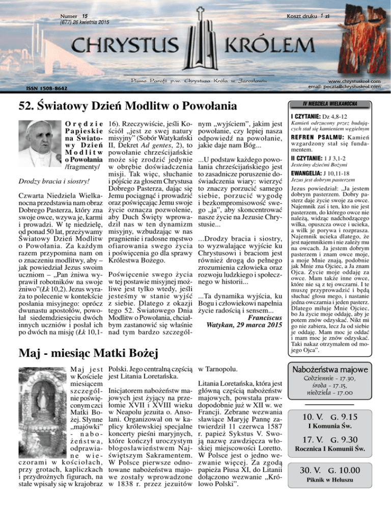 1 15 (677) 26 kwietnia 2015 52. Światowy Dzień Modlitw o Powołania Orędzie Papieskie na Światowy Dzień Modlitw o Powołania /fragmenty/ Drodzy bracia i siostry! Czwarta Niedziela Wielkanocna przedstawia nam obraz Dobrego Pasterza, który zna swoje owce, wzywa je, karmi i prowadzi. W tę niedzielę, od ponad 50 lat, przeżywamy Światowy Dzień Modlitw o Powołania. Za każdym razem przypomina nam on o znaczeniu modlitwy, aby – jak powiedział Jezus swoim uczniom – „Pan żniwa wyprawił robotników na swoje żniwo”(Łk 10,2). Jezus wyraża to polecenie w kontekście posłania misyjnego: oprócz dwunastu apostołów, powołał siedemdziesięciu dwóch innych uczniów i posłał ich po dwóch na misję (Łk 10,1- 16). Rzeczywiście, jeśli Kościół „jest ze swej natury misyjny” (Sobór Watykański II, Dekret Ad gentes, 2), to powołanie chrześcijańskie może się zrodzić jedynie w obrębie doświadczenia misji. Tak więc, słuchanie i pójście za głosem Chrystusa Dobrego Pasterza, dając się Jemu pociągnąć i prowadzić oraz poświęcając Jemu swoje życie oznacza pozwolenie, aby Duch Święty wprowadził nas w ten dynamizm misyjny, wzbudzając w nas pragnienie i radosne męstwo ofiarowania swego życia i poświęcenia go dla sprawy Królestwa Bożego. nym „wyjściem”, jakim jest powołanie, czy lepiej nasza odpowiedź na powołanie, jakie daje nam Bóg... ...U podstaw każdego powołania chrześcijańskiego jest to zasadnicze poruszenie doświadczenia wiary: wierzyć to znaczy porzucić samego siebie, porzucić wygodę i bezkompromisowość swego „ja”, aby skoncentrować nasze życie na Jezusie Chrystusie... ...Drodzy bracia i siostry, to wyzwalające wyjście ku Chrystusowi i braciom jest również drogą do pełnego zrozumienia człowieka oraz Poświęcenie swego życia rozwoju ludzkiego i społeczw tej postawie misyjnej moż- nego w historii... liwe jest tylko wtedy, jeśli jesteśmy w stanie wyjść ...Ta dynamika wyjścia, ku z siebie. Dlatego z okazji Bogu i człowiekowi napełnia tego 52. Światowego Dnia życie radością i sensem... Modlitw o Powołania, chciałFranciscus bym zastanowić się właśnie Watykan, 29 marca 2015 nad tym bardzo szczegól- Maj - miesiąc Matki Bożej Maj jest w Kościele miesiącem szczególnie poświęconym czci Matki Bożej. Słynne „majówki” - nabożeństwa, odprawiane wieczorami w kościołach, przy grotach, kapliczkach i przydrożnych figurach, na stałe wpisały się w krajobraz Polski. Jego centralną częścią w Tarnopolu. jest Litania Loretańska. Litania Loretańska, która jest Inicjatorem nabożeństw ma- główną częścią nabożeństw jowych jest żyjący na prze- majowych, powstała prawłomie XVII i XVIII wieku dopodobnie już w XII w. we w Neapolu jezuita o. Anso- Francji. Zebrane wezwania lani. Organizował on w ka- sławiące Maryję Pannę zaplicy królewskiej specjalne twierdził 11 czerwca 1587 koncerty pieśni maryjnych, r. papież Sykstus V. Swoktóre kończył uroczystym ją nazwę zawdzięcza włobłogosławieństwem Naj- skiej miejscowości Loretto. świętszym Sakramentem. W Polsce jest o jedno weW Polsce pierwsze odno- zwanie więcej. Za zgodą towane nabożeństwa majo- papieża Piusa XI, do Litanii we zostały wprowadzone dołączono wezwanie „Krów 1838 r. przez jezuitów lowo Polski”. IV NIEDZIELA WIELKANOCNA I CZYTANIE: Dz 4,8-12 Kamień odrzucony przez budujących stał się kamieniem węgielnym REFREN PSALMU: Kamień wzgardzony stał się fundamentem. II CZYTANIE: 1 J 3,1-2 Jesteśmy dziećmi Bożymi EWANGELIA: J 10,11-18 Jezus jest dobrym pasterzem Jezus powiedział: „Ja jestem dobrym pasterzem. Dobry pasterz daje życie swoje za owce. Najemnik zaś i ten, kto nie jest pasterzem, do którego owce nie należą, widząc nadchodzącego wilka, opuszcza owce i ucieka, a wilk je porywa i rozprasza. Najemnik ucieka dlatego, że jest najemnikiem i nie zależy mu na owcach. Ja jestem dobrym pasterzem i znam owce moje, a moje Mnie znają, podobnie jak Mnie zna Ojciec, a Ja znam Ojca. Życie moje oddaję za owce. Mam także inne owce, które nie są z tej owczarni. I te muszę przyprowadzić i będą słuchać głosu mego, i nastanie jedna owczarnia i jeden pasterz. Dlatego miłuje Mnie Ojciec, bo Ja życie moje oddaję, aby je potem znów odzyskać. Nikt mi go nie zabiera, lecz Ja od siebie je oddaję. Mam moc je oddać i mam moc je znów odzyskać. Taki nakaz otrzymałem od mojego Ojca”. Nabożeństwa majowe Codziennie - 17.30, środa - 17.15, niedziela - 17.00 10. V. g. 9.15 I Komunia Św. 17. V. g. 9.30 Rocznica I Komunii Św. 30. V. g. 10.00 Piknik w Heluszu 2 Chrystus Królem Zbiórka na tacę Niedziela 26 IV 15 GRUPA I Niedziela 3 V 15 GRUPA II Msze św. wspólnotowe NIEDZIELA – Parafialny Klub Sportowy Kolping-Jarosław PONIEDZIAŁEK – Wspólnota osób zbierających składki na inwestycje WTOREK – RóżaXIIIśw.Kingip. Boryło + Róża Boga Ojca VIII - p. Chomik ŚRODA – Róża XVI św. Klary p. Taciuch, Róża Boga Ojca VI p. Płoskoń CZWARTEK – Dzieło Pomocy Duszom Czyśćcowym + Dzieło Pomocy Powołaniom PIĄTEK – Krąg I św. Wojciecha + Krąg III św. Zofii + Róża XII św. Barbary - p. Bąk SOBOTA – Krąg II - św. Marka + Krąg IV św. Franciszka i Hiacynty + Chór parafialny D z i ę k u j e m y ... Ogłoszenia parafialne 1. Dziś nabożeństwo i koronka do Bożego Miłosierdzia o godz. 17.00. 2. Dzisiejsza Niedziela Dobrego Pasterza to Światowy Dzień Modlitw o Powołania. Rozpoczyna ona tydzień modlitw o powołania do służby w Kościele. Brakuje kleryków, ale też brakuje ministrantów i lektorów. To zła zapowiedź dla przyszłości Kościoła. 3. W piątek (1 V) początek nabożeństw majowych. W dni powszednie nabożeństwa będą o godz. 17.30, w środy o godz. 17.15. Prosimy, aby rodzice i dziadkowie przychodzili na nabożeństwo z dziećmi i wprowadzali je w piękną polską tradycję. 4. W tym tygodniu wypada pierwszy piątek i