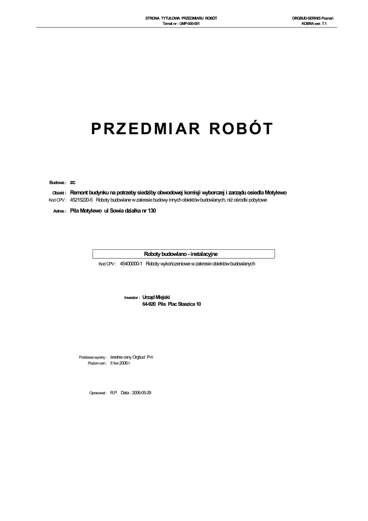 STRONA TYTUŁOWA PRZEDMIARU ROBÓT Temat nr : UMP-000-001 P RZ E DMI AR ROBÓT Budowa : Obiekt : zc Remont budynku na potrzeby siedziby obwodowej komisji wyborczej i zarządu osiedla Motylewo Kod CPV : 45215220-5 Roboty budowlane w zakresie budowy innych obiektów budowlanych, niŜ ośrodki pobytowe Adres : Piła Motylewo ul Sowia działka nr 130 Roboty budowlano - instalacyjne Kod CPV : 45400000-1 Roboty wykończeniowe w zakresie obiektów budowlanych Inwestor : Urząd Miejski 64-920 Piła Plac Staszica 10 Podstawa wyceny : średnie ceny Orgbud P-ń Poziom cen : II kw 2006 r Opracował : R.P. Data : 2006-05-29 ORGBUD-SERWIS Poznań KOBRA wer. 7.1 S PI S DZ I AŁ ÓW P RZ EDMI ARU Temat nr : UMP-000-001 ORGBUD-SERWIS Poznań KOBRA wer. 7.1 Budowa : zc Obiekt : Remont budynku na potrzeby siedziby obwodowej komisji wyborczej i zarządu osiedla Motylewo Adres : Piła Motylewo ul Sowia działka nr 130 Roboty budowlano - instalacyjne SPIS DZIAŁÓW PRZEDMIARU Lp. Opis stanu / elementu 1. STAN : Roboty budowlane - instalacyjne 1.1. Roboty dekarskie 1.2. Elewacja ocieplenie ścian zewnętrznych 1.3. Ścianki działowe 1.4. Tynki i okładziny wewnętrzne 1.5. PodłoŜa, posadzki, podłogi 1.6. Stolarka drzwiowa 1.7. Stolarka okienna 1.8. Wewnętrzna instalacja elektryczna 1.9. Instalacja wod - kan - - - Koniec wydruku spisu działów przedmiaru - - - Str: 1 PRZ EDMI AR ROBÓT Temat nr : UMP-000-001 ORGBUD-SERWIS Poznań KOBRA wer. 7.1 Budowa : zc Obiekt : Remont budynku na potrzeby siedziby obwodowej komisji wyborczej i zarządu osiedla Motylewo Adres : Piła Motylewo ul Sowia działka nr 130 Roboty budowlano - instalacyjne Lp. Str: 1 Podstawa kalkulacji / Opis pozycji Ilość Jedn. miary 1. STAN : Roboty budowlane - instalacyjne 1.1. ELEMENT : Roboty dekarskie Poz. 1. KNR 4-01 0519-06 Rozbiórka pokrycia z papy na dachach betonowych - pierwsza warstwa łącznie z demontaŜem instalacji odgromowej Opis pozycji obmiaru 90,695 m2 WyraŜenie arytmetyczne Wynik Poz. 2. KNR 4-01 0519-07 Rozbiórka pokrycia z papy na dachach betonowych - następna druga --warstwa x1 90,695 Razem obmiar = 90,695 90,695 m2 Poz. 3. kal. Utylizacja papy łącznie z wywozem Opis pozycji obmiaru 18,7*4,85 = 816,255 kg WyraŜenie arytmetyczne Wynik Poz. 4. KNR 202-1102-02-00 IZOiEPB ORGBUD W-wa Warstwy wyrównawcze pod posadzki, z zaprawy cementowej M 12, grubości 10 mm, zatarte: na gładko Poz. 5. KNR 202-0219-02-01 IZOiEPB ORGBUD W-wa 90,695*2*4,5 = 816,255 Razem obmiar = 816,255 90,695 m2 0,120 m3 [ Wydanie - Warszawa 1985 r.z uwzgl.BI do 9/96 ] Gzymsy Ŝelbetowe z betonu zwykłego B-15, o wysięgu: ponad 15 do 50 cm Opis pozycji obmiaru WyraŜenie arytmetyczne Wynik Poz. 6. KNR 202-0406-01-00 IZOiEPB ORGBUD W-wa 0,1*0,3*4,0 = 0,120 Razem obmiar = 0,120 0,923 m3 [ Wydanie - Warszawa 1985 r.z uwzgl.BI do 9/96 ] Konstrukcje dachowe z tarcicy iglastej wymiarowej nasyconej -murłaty o przekroju poprzecznym drewna: do 180 cm2 analogia osadzenie belki startowej 14*14 cm Opis pozycji obmiaru WyraŜenie arytmetyczne Wynik 0,14*0,14*(18,7*2+4,85*2) = 0,923 Razem obmiar = 0,923 Poz. 7. KNR 202-0609-01-00 IZOiEPB ORGBUD W-wa 90,695 m2 [ Wydanie - Warszawa 1985 r.z uwzgl.BI do 9/96 ] Izolacje cieplne i przeciwdźwiękowe poziome z płyt styropianowych, układane na wierzchu konstrukcji: na lepiku asfalt., zagrunt.roztw.asf. Płyta styrop laminowana 1 x papa EPS 100 grub 14 cm Poz. 8. KNR 017-2609-05-00 IGM Warszawa Ocieplenie dachu budynków płytami styropianowymi metodą lekką-mokrą, przy uŜyciu gotowych zapraw klejących - przymocowanie płyt styropianowych za pomocą dybli plastikowych do dachu z betonu Opis pozycji obmiaru 272,085 szt WyraŜenie arytmetyczne Wynik 90,695*3 = 272,085 Razem obmiar = 272,085 PRZ EDMI AR ROBÓT Temat nr : UMP-000-001 ORGBUD-SERWIS Poznań KOBRA wer. 7.1 Roboty budowlano - instalacyjne STAN : 1. Roboty budowlane - instalacyjne ELEMENT : 1.1. Roboty dekarskie Lp. Podstawa kalkulacji Str: 2 / Opis pozycji Ilość Poz. 9. KNR 202-0504-01-02 WACETOB Warszawa Pokrycie dachów papą termozgrzewalną Papa zgrzew.mod.,poliest.w/k Zdunbit WF jednowarstwowe Poz. 10. KNR 202-0506-02-10 IZOiEPB ORGBUD W-wa Obróbki z blachy ocynkowanej grubości 0,55 mm, o szerokości w rozwinięciu: ponad 25 cm Opis pozycji obmiaru Jedn. miary 90,695 m2 16,485 m2 WyraŜenie arytmetyczne Wynik Poz. 11. KNR 202-0508-03-10 IZOiEPB ORGBUD W-wa (18,7*2+4,85*2)*0,35 = 16,485 Razem obmiar = 16,485 18,700 m [ Wydanie - Warszawa 1985 r.z uwzgl.BI do 9/96 ] Rynny dachowe półokrągłe, z blachy ocynkowanej grubości 0,55 mm, o średnicy: 12 cm Poz. 12. KNR 202-0510-02-10 IZOiEPB ORGBUD W-wa Rury spustowe okrągłe z blachy ocynkowanej grubości 0,55 mm, o średnicy: 10 cm Opis pozycji obmiaru 6,400 m WyraŜenie arytmetyczne Wynik 3,2*2 = 6,400 Razem obmiar = 6,400 1.2. ELEMENT : Elewacja ocieplenie ścian zewnętrznych Poz. 13. KNR 401-0725-03-10 IGM Warszawa 119,026 m2 Uzupełnienie tynków zewnętrznych zwykłych kategorii II, na ścianach, loggiach i balkonach z cegieł pustaków ceramicznych i gazobetonów, przy powierzchni uzupełnianych tynków w jednym miejscu: ponad 2,0 do 5,0 m2, przy uŜyciu wapna such. przyjęto 80 % Opis pozycji obmiaru WyraŜenie arytmetyczne Wynik ( 18,7*3,2+18,7*2,78+4,85*3,81*2 ) * ( 0,8 ) = 119,026 Razem obmiar = 119,026 Poz. 14. KNR 401-0304-02-00 IGM Warszawa Uzupełnienie ścian lub zamurowanie otworów o objętości do 2,0 m3 w jednym miejscu, bloczkami z betonu komórkowego na zaprawie cementowowapiennej,przy uŜyciu wapna suchogaszonego Opis pozycji obmiaru 1,306 m3 WyraŜenie arytmetyczne Wynik 2,8*1,6*0,24+1,2*0,8*0,24 = 1,306 Razem obmiar = 1,306 Poz. 15. KNR 017-2610-01-00 IGM Warszawa 133,293 m2 Ocieplenie płytami styropian.metodą lekką-mokrą, przy uŜyciu got.zapraw klejących, wraz z przygotowaniem podłoŜa i ręcznym wyk.wyprawy elewacyjnej cienkowarstwowej z got.suchej mieszanki, ścian z gazobetonu /sucha mieszanka CT 35/ styropian grub 12 cm Opis pozycji obmiaru WyraŜenie aryt