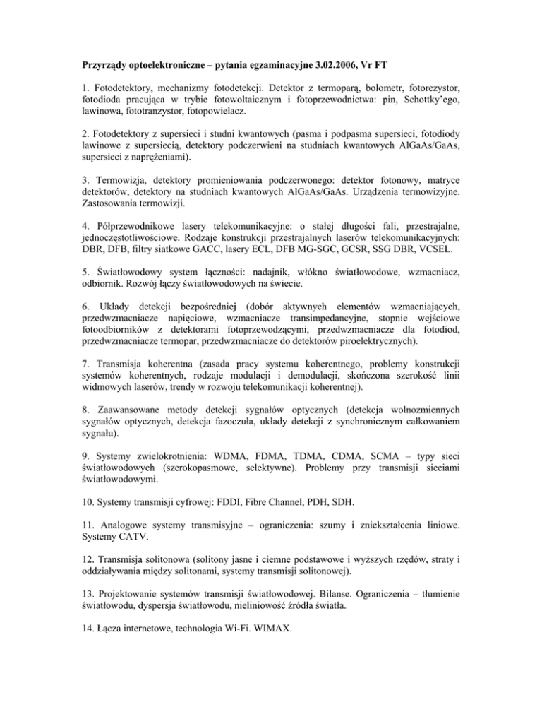 Przyrządy optoelektroniczne – pytania egzaminacyjne 3.02.2006, Vr FT 1. Fotodetektory, mechanizmy fotodetekcji. Detektor z termoparą, bolometr, fotorezystor, fotodioda pracująca w trybie fotowoltaicznym i fotoprzewodnictwa: pin, Schottky’ego, lawinowa, fototranzystor, fotopowielacz. 2. Fotodetektory z supersieci i studni kwantowych (pasma i podpasma supersieci, fotodiody lawinowe z supersiecią, detektory podczerwieni na studniach kwantowych AlGaAs/GaAs, supersieci z naprężeniami). 3. Termowizja, detektory promieniowania podczerwonego: detektor fotonowy, matryce detektorów, detektory na studniach kwantowych AlGaAs/GaAs. Urządzenia termowizyjne. Zastosowania termowizji. 4. Półprzewodnikowe lasery telekomunikacyjne: o stałej długości fali, przestrajalne, jednoczęstotliwościowe. Rodzaje konstrukcji przestrajalnych laserów telekomunikacyjnych: DBR, DFB, filtry siatkowe GACC, lasery ECL, DFB MG-SGC, GCSR, SSG DBR, VCSEL. 5. Światłowodowy system łączności: nadajnik, włókno światłowodowe, wzmacniacz, odbiornik. Rozwój łączy światłowodowych na świecie. 6. Układy detekcji bezpośredniej (dobór aktywnych elementów wzmacniających, przedwzmacniacze napięciowe, wzmacniacze transimpedancyjne, stopnie wejściowe fotoodbiorników z detektorami fotoprzewodzącymi, przedwzmacniacze dla fotodiod, przedwzmacniacze termopar, przedwzmacniacze do detektorów piroelektrycznych). 7. Transmisja koherentna (zasada pracy systemu koherentnego, problemy konstrukcji systemów koherentnych, rodzaje modulacji i demodulacji, skończona szerokość linii widmowych laserów, trendy w rozwoju telekomunikacji koherentnej). 8. Zaawansowane metody detekcji sygnałów optycznych (detekcja wolnozmiennych sygnałów optycznych, detekcja fazoczuła, układy detekcji z synchronicznym całkowaniem sygnału). 9. Systemy zwielokrotnienia: WDMA, FDMA, TDMA, CDMA, SCMA – typy sieci światłowodowych (szerokopasmowe, selektywne). Problemy przy transmisji sieciami światłowodowymi. 10. Systemy transmisji cyfrowej: FDDI, Fibre Channel, PDH, SDH. 11. Analogowe systemy transmisyjne – ograniczenia: szumy i zniekształcenia liniowe. Systemy CATV. 12. Transmisja solitonowa (solitony jasne i ciemne podstawowe i wyższych rzędów, straty i oddziaływania między solitonami, systemy transmisji solitonowej). 13. Projektowanie systemów transmisji światłowodowej. Bilanse. Ograniczenia – tłumienie światłowodu, dyspersja światłowodu, nieliniowość źródła światła. 14. Łącza internetowe, technologia Wi-Fi. WIMAX. 15. Zastosowania optoelektroniki: odtwarzacze i nagrywarki DVD, systemy dekodowania dźwięku przestrzennego (Dolby Digital, DTS, THX). Standardy płyt DVD – DVD RAM, DVD-Video, DVD-Audio, SACD, SVCD. 16. Zastosowania optoelektroniki, ekrany: plazmowe PDP, LCD. Telewizja wysokiej rozdzielczości HDTV. Projektory: CRT, 3LCD, DLP, LCOS, OLED, SED. 17. Zastosowania optoelektroniki, karty pamięci w fotograficznych aparatach cyfrowych, odtwarzaczach MP3, kamerach, palmtopach, laptopach, telefonie komórkowym (pamięci FLASH – NOR i NAND). Kartowe standardy: SM, MMC, SD, Memory Stick, CF, xDPicture, USB. 18. Zastosowania optoelektroniki, matryce aparatu cyfrowego: matryce CCD – metoda przesuwu ładunku do wyjścia, układy CMOS, porównanie. 19. Zastosowania optoelektroniki, bariera optoelektroniczna, czujniki światłowodowe, czytnik kodu kreskowego. 20. Zastosowania optoelektroniki, dysk magnetooptyczny, odtwarzacz płyt kompaktowych, drukarka laserowa. 21. Zastosowania optoelektroniki, lampy analizujące: ikonoskop, widikon, plumbikon, lampa z przewodnictwem elektronów wtórnych. 22. Zastosowania optoelektroniki, urządzenia wyświetlające: ferroelektryczne, luminescencyjne, elektroluminescencyjne. ciekłokrystaliczne,