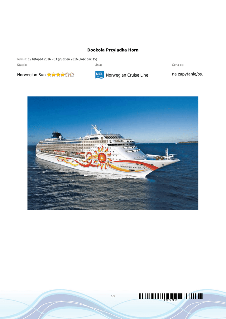 Dookoła Przylądka Horn Termin: 19 listopad 2016 - 03 grudzień 2016 (ilość dni: 15) Statek: Norwegian Sun Linia: Cena od: Norwegian Cruise Line na zapytanie/os. 1/3 EV:35333 TRASA REJSU Data Port Wpłynięcie Wypłynięcie sobota 19.11.2016 Valparaiso --:-- 17:00 dzień 2 niedziela 20.11.2016 Dzień na morzu --:-- --:-- dzień 3 poniedziałek 21.11.2016 Puerto Montt 08:00 18:00 wtorek 22.11.2016 Puerto Chacabuco 10:00 17:00 środa 23.11.2016 Kanały Patagońskie --:-- --:-- środa 23.11.2016 Fiordy Chilijskie --:-- --:-- czwartek 24.11.2016 Cieśnina Magellana --:-- --:-- piątek 25.11.2016 Punta Arenas 06:00 18:00 sobota 26.11.2016 Kanał Beagle --:-- --:-- sobota 26.11.2016 Ushuaia 12:00 20:00 --:-- --:-- 09:00 16:00 --:-- --:-- dzień 1 dzień 4 dzień 5 dzień 5 dzień 6 dzień 7 dzień 8 dzień 8 dzień 9 dzień 10 dzień 11 Chile Chile Chile Chile Chile Chile Chile Chile Argentyna niedziela 27.11.2016 Przylądek Horn poniedziałek 28.11.2016 Stanley (daw. Port Stanley) wtorek 29.11.2016 Dzień na morzu Chile Falklandy 2/3 EV:35333 Legenda Data Port Wpłynięcie Wypłynięcie środa 30.11.2016 Puerto Madryn 07:00 16:00 dzień 13 czwartek 01.12.2016 Dzień na morzu --:-- --:-- dzień 14 piątek 02.12.2016 Montevideo 10:00 19:00 sobota 03.12.2016 Buenos Aires 06:00 --:-- dzień 12 dzień 15 Legenda Argentyna Urugwaj Argentyna CENNIK Cena katalogowa Kabina wewnętrzna od €1 249.00 Kabina zewnętrzna z oknem od €1 629.00 Kabina zewnętrzna z balkonem od €2 459.00 Suite (apartament) od €5 159.00 Kabina jednoosobowa na zapytanie 3 i 4 osoba dorosła w kabinie na zapytanie dziecko od 2 do 17 lat jako 3 i 4 osoba w kabinie na zapytanie dziecko od 0 do 2 lat jako 3 i 4 osoba w kabinie na zapytanie Opłaty portowe Cena promocyjna w cenie Uwaga! Ceny za osobę w kabinie dwuosobowej. Cena zawiera: zakwaterowanie w kabinie wybranej kategorii; wyżywienie - 3 główne posiłki, przekąski między posiłkami, bufet lub przekąski o północy; napoje serwowane do śniadania i w bufetach samoobsługowych; serwis bagażowy podczas wejścia i zejścia ze statku; serwis kabinowy; korzystanie ze wszystkich urządzeń sportowo - rekreacyjnych znajdujących się na pokładzie statku (basen, jacuzzi, sala fitness, itp.); udział we wszystkich imprezach organizowanych na statku (przedstawienia w teatrze, koncerty, programy animacyjne itp.). Cena nie zawiera: kosztów dojazdu do portu; ewentualnych noclegów w hotelu przed/po rejsie i transferów; wycieczek fakultatywnych w trakcie rejsu; korzystania z barów, mini baru w kabinie oraz napojów zamawianych w restauracji; korzystania z punktów usługowych (fryzjer, pralnia, fotograf, salon piękności i odnowy biologicznej, internet) i wydatków osobistych; napiwków dla obsługi na statku (kwota uzależniona od długości rejsu); ubezpieczenia KL, NNW i bagaż, kosztów wiz (tam gdzie wymagane). 3/3 EV:35333