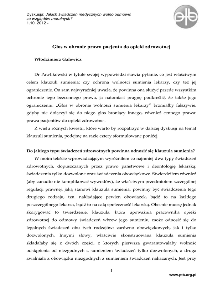 Dyskusja: Jakich świadczeń medycznych wolno odmówić ze względów moralnych? 1.10. 2012 - Głos w obronie prawa pacjenta do opieki zdrowotnej Włodzimierz Galewicz Dr Pawlikowski w tytule swojej wypowiedzi stawia pytanie, co jest właściwym celem klauzuli sumienia: czy ochrona wolności sumienia lekarzy, czy też jej ograniczenie. On sam najwyraźniej uważa, że powinna ona służyć przede wszystkim ochronie tego bezcennego prawa, ja natomiast pragnę podkreślić, że także jego ograniczeniu. „Głos w obronie wolności sumienia lekarzy” brzmiałby fałszywie, gdyby nie dołączył się do niego głos broniący innego, również cennego prawa: prawa pacjentów do opieki zdrowotnej. Z wielu różnych kwestii, które warto by rozpatrzyć w dalszej dyskusji na temat klauzuli sumienia, podejmę na razie cztery sformułowane poniżej. Do jakiego typu świadczeń zdrowotnych powinna odnosić się klauzula sumienia? W moim tekście wprowadzającym wyróżniłem co najmniej dwa typy świadczeń zdrowotnych, dopuszczanych przez prawo państwowe i deontologię lekarską: świadczenia tylko dozwolone oraz świadczenia obowiązkowe. Stwierdziłem również (aby zanadto nie komplikować wywodów), że właściwym przedmiotem szczególnej regulacji prawnej, jaką stanowi klauzula sumienia, powinny być świadczenia tego drugiego rodzaju, tzn. nakładające pewien obowiązek, bądź to na każdego poszczególnego lekarza, bądź to na całą społeczność lekarską. Obecnie muszę jednak skorygować to twierdzenie: klauzula, która upoważnia pracownika opieki zdrowotnej do odmowy świadczeń wbrew jego sumieniu, może odnosić się do legalnych świadczeń obu tych rodzajów: zarówno obowiązkowych, jak i tylko dozwolonych. Innymi słowy, właściwie skonstruowana klauzula sumienia składałaby się z dwóch części, z których pierwsza gwarantowałaby wolność odstąpienia od niezgodnych z sumieniem świadczeń tylko dozwolonych, a druga zwalniała z obowiązku niezgodnych z sumieniem świadczeń nakazanych. Jest przy 1 www.ptb.org.pl Dyskusja: Jakich świadczeń medycznych wolno odmówić ze względów moralnych? 1.10.2012 - tym jasne, że w odniesieniu do każdego z tych przedmiotów prawo do odstąpienia od świadczeń niezgodnych z sumieniem będzie posiadało odmienny charakter: w wypadku świadczeń nieobowiązkowych może być ono prawem (niemalże) bezwarunkowym, a w wypadku świadczeń nakładających zbiorowy obowiązek musi być opatrzone szeregiem warunków. W ten sposób zarysowuję jednak pewien idealny model klauzuli sumienia, a nie jej realny kształt w polskim prawie medycznym. Do jakiego typu świadczeń zdrowotnych odnosi się klauzula sumienia w polskim prawie medycznym? Art. 39 Ustawy o zawodach lekarza i lekarza dentysty stanowi: Lekarz może powstrzymać się od wykonania świadczeń zdrowotnych niezgodnych z jego sumieniem, z zastrzeżeniem art. 30, z tym że ma obowiązek wskazać realne możliwości uzyskania tego świadczenia u innego lekarza lub w innym zakładzie opieki zdrowotnej oraz uzasadnić i odnotować ten fakt w dokumentacji medycznej. W przytoczonym przepisie mowa jest po prostu o świadczeniach zdrowotnych, ale rozumie się, że nie chodzi tutaj o wszystkie takie świadczenia. Do świadczeń zdrowotnych, które leżą w kompetencjach lekarza i o które może on również zostać poproszony, należą także świadczenia niedozwolone w danym systemie prawnym. Jest jednak jasne, że odmowa wykonania takich nielegalnych świadczeń jest nie tylko prawem, ale i legislacyjnym obowiązkiem lekarza i że odmawiając takiego świadczenia, nie może on być w żadnym razie zobowiązany „wskazać realne możliwości uzyskania tego świadczenia u innego lekarza lub w innym zakładzie opieki zdrowotnej”. Czy jednak do owych prawnie dozwolonych świadczeń zdrowotnych, których wykonania może odmówić lekarz żywiący wobec nich moralne obiekcje, należy zaliczyć jedynie świadczenia nakładające zbiorowy obowiązek, czy jedynie świadczenia dopuszczalne, lecz nieobowiązkowe, czy wreszcie zarówno pierwsze, jak i drugie? Przyznam się, że nie mam w tej sprawie jasności. Z jednej bowiem strony od lekarza, który odmawia wykonania świadczeń zdrowotnych niezgodnych 2 www.ptb.org.pl Dyskusja: Jakich świadczeń medycznych wolno odmówić ze względów moralnych? 1.10.2012 - z jego sumieniem, wymaga się tutaj, aby wskazał „realne możliwości uzyskania tego świadczenia u innego lekarza lub w innym zakładzie opieki zdrowotnej”; ten wymóg nie miałby raczej sensu w odniesieniu do świadczeń, które w ogóle nie nakładają żadnego obowiązku na społeczność lekarską. Z drugiej jednak strony klauzulę sumienia – tak u nas, jak w innych krajach – najczęściej przywołuje się po to, aby uzasadnić odmowę udziału w zabiegu przerwania ciąży, i to w wypadkach, gdy jest on prawnie dozwolony. Czy legalna aborcja jest w Polsce zabiegiem tylko dozwolonym, czy też gwarantowanym? Społeczeństwo nie ma chyba jasności w tej sprawie, ale Trybunał Konstytucyjny w swoim orzeczeniu z 15.1.1991 r. (U8/90, OTK 1991, Nr 1, poz. 8), cytowanym także przez dra Pawlikowskiego, przychyla się jednoznacznie do tej pierwszej odpowiedzi: w naszym systemie prawnym nie ma przepisu nakładającego obowiązek orzeczenia o dopuszczalności zabiegu przerwania ciąży, od którego mogłyby być przewidziane wyjątki usprawiedliwiające „uchylenie się” od tego obowiązku. (...) Tak samo nie da się w naszym systemie prawnym znaleźć przepisu nakładającego na lekarza obowiązek przeprowadzenia zabiegu przerwania ciąży. (...) W obowiązującym stanie prawnym można natomiast wskazać normy, zezwalające lekarzowi na „uchylenie się” od wydania orzeczenia o dopuszczalności przerwania ciąży lub od przeprowadzenia takiego zabiegu. W przytoczonym fragmencie „uchylenie się” nie przypadkiem jest wzięte w cudzysłów. Ściśle bowiem biorąc, lekar