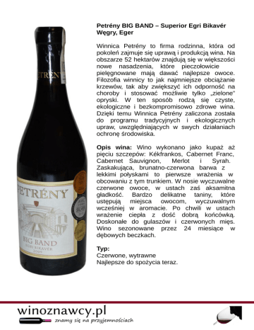 Petrény BIG BAND – Superior Egri Bikavér Węgry, Eger Winnica Petrény to firma rodzinna, która od pokoleń zajmuje się uprawą i produkcją wina. Na obszarze 52 hektarów znajdują się w większości nowe nasadzenia, które pieczołowicie pielęgnowane mają dawać najlepsze owoce. Filozofia winnicy to jak najmniejsze obciążanie krzewów, tak aby zwiększyć ich odporność na choroby i stosować możliwie tylko „zielone” opryski. W ten sposób rodzą się czyste, ekologiczne i bezkompromisowo zdrowe wina. Dzięki temu Winnica Petrény zaliczona została do programu tradycyjnych i ekologicznych upraw, uwzględniających w swych działaniach ochronę środowiska. Opis wina: Wino wykonano jako kupaż aż pięciu szczepów: Kékfrankos, Cabernet Franc, Cabernet Sauvignon, Merlot i Syrah. Zaskakująca, brunatno-czerwona barwa z lekkimi połyskami to pierwsze wrażenia w obcowaniu z tym trunkiem. W nosie wyczuwalne czerwone owoce, w ustach zaś aksamitna gładkość. Bardzo delikatne taniny, które ustępują miejsca owocom, wyczuwalnym wcześniej w aromacie. Po chwili w ustach wrażenie ciepła z dość dobrą końcówką. Doskonałe do gulaszów i czerwonych mięs. Wino sezonowane przez 24 miesiące w dębowych beczkach. Typ: Czerwone, wytrawne Najlepsze do spożycia teraz.