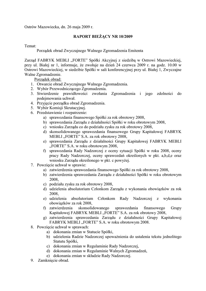 Ostrów Mazowiecka, dn. 26 maja 2009 r. RAPORT BIEśĄCY NR 10/2009 Temat: Porządek obrad Zwyczajnego Walnego Zgromadzenia Emitenta Zarząd FABRYK MEBLI „FORTE” Spółki Akcyjnej z siedzibą w Ostrowi Mazowieckiej, przy ul. Białej nr 1, informuje, Ŝe zwołuje na dzień 24 czerwca 2009 r. na godz. 10.00 w Ostrowi Mazowieckiej, w siedzibie Spółki w sali konferencyjnej przy ul. Białej 1, Zwyczajne Walne Zgromadzenie. Porządek obrad: 1. Otwarcie obrad Zwyczajnego Walnego Zgromadzenia. 2. Wybór Przewodniczącego Zgromadzenia. 3. Stwierdzenie prawidłowości zwołania Zgromadzenia i jego zdolności do podejmowania uchwał. 4. Przyjęcie porządku obrad Zgromadzenia. 5. Wybór Komisji Skrutacyjnej. 6. Przedstawienie i rozpatrzenie: a) sprawozdania finansowego Spółki za rok obrotowy 2008, b) sprawozdania Zarządu z działalności Spółki w roku obrotowym 2008, c) wniosku Zarządu co do podziału zysku za rok obrotowy 2008, d) skonsolidowanego sprawozdania finansowego Grupy Kapitałowej FABRYK MEBLI „FORTE” S.A. za rok obrotowy 2008, e) sprawozdania Zarządu z działalności Grupy Kapitałowej FABRYK MEBLI „FORTE” S.A. w roku obrotowym 2008, f) sprawozdania Rady Nadzorczej z oceny sytuacji Spółki w roku 2008, oceny pracy Rady Nadzorczej, oceny sprawozdań określonych w pkt. a,b,d,e oraz wniosku Zarządu określonego w pkt. c powyŜej. 7. Powzięcie uchwał w sprawie: a) zatwierdzenia sprawozdania finansowego Spółki za rok obrotowy 2008, b) zatwierdzenia sprawozdania Zarządu z działalności Spółki w roku obrotowym 2008, c) podziału zysku za rok obrotowy 2008, d) udzielenia absolutorium Członkom Zarządu z wykonania obowiązków za rok 2008, e) udzielenia absolutorium Członkom Rady Nadzorczej z wykonania obowiązków za rok 2008, f) zatwierdzenia skonsolidowanego sprawozdania finansowego Grupy Kapitałowej FABRYK MEBLI „FORTE” S.A. za rok obrotowy 2008, g) zatwierdzenia sprawozdania Zarządu z działalności Grupy Kapitałowej FABRYK MEBLI „FORTE” S.A. w roku obrotowym 2008. 8. Powzięcie uchwał w sprawach: a) dokonania zmian w Statucie Spółki, b) udzielenia Radzie Nadzorczej upowaŜnienia do ustalenia tekstu jednolitego Statutu Spółki, c) dokonania zmian w Regulaminie Rady Nadzorczej, d) dokonania zmian w Regulaminie Walnych Zgromadzeń, e) dokonania zmian w składzie Rady Nadzorczej. 9. Zamknięcie obrad. W związku z zamiarem wprowadzenia zmian w Statucie Spółki, Zarząd podaje do wiadomości treść dotychczas obowiązujących postanowień Statutu oraz proponowane zmiany (Ad. 8a porządku obrad): I. § 1 pkt. 1.5 Obecne brzmienie: „Spółka posiada oddziały w Suwałkach, Białymstoku, Hajnówce i Przemyślu.” Proponowane brzmienie: „Spółka posiada oddziały w Suwałkach, Białymstoku i Hajnówce.” II. § 3 Obecne brzmienie: „Przedmiot działalności Spółki obejmuje: 1/ produkcję krzeseł i mebli do siedzenia (PKD 36.11.Z) 2/ produkcję mebli biurowych i sklepowych pozostałą (PKD 36.12.Z) 3/ produkcję mebli kuchennych (PKD 36.13.Z) 4/ produkcję mebli pozostałą, z wyjątkiem działalności usługowej (PKD 36.14. A) 5/ działalność usługową w zakresie wykańczania mebli (36.14.B) 6/ produkcję materaców (PKD 36.15.Z) 7/ produkcję mebli medycznych (PKD 33.10.A) 8/ produkcję wyrobów tartacznych (PKD 20.10.A) 9/ działalność usługową w zakresie impregnowania drewna (PKD 20.10.B) 10/ produkcję arkuszy fornirowych, produkcję płyt i sklejek (PKD 20.20.Z), 11/ produkcję wyrobów stolarskich i ciesielskich dla budownictwa (PKD 20.30.Z) 12/ produkcję opakowań drewnianych (PKD 20.40.Z) 13/ produkcję pozostałych wyrobów z drewna (PKD 20.51.Z) 14/ produkcję wyrobów z korka, słomy i materiałów uŜywanych do wyplatania (PKD 20.52.Z) 15/ produkcję odzieŜy skórzanej (PKD 18.10.Z) 16/ produkcję ubrań roboczych (PKD 18.21.Z) 17/ produkcję ubrań wierzchnich dla męŜczyzn i chłopców pozostałą (PKD 18.22.A) 18/ produkcję ubrań wierzchnich dla kobiet i dziewcząt pozostałą (PKD 18.22.B) 19/ produkcję bielizny (PKD 18.23.Z) 20/ produkcję pozostałej odzieŜy i dodatków do odzieŜy, gdzie indziej nie sklasyfikowanej (PKD 18.24.Z) 21/ produkcję elektrycznego sprzętu gospodarstwa domowego (PKD 29.71.Z) 22) produkcję nieelektrycznego sprzętu gospodarstwa domowego (PKD 29.72.Z) 23/ produkcję ciepła (pary wodnej i gorącej wody) (PKD 40.30.A) 24/ dystrybucję ciepła (pary wodnej i gorącej wody) (PKD 40.30. B) 25/ wykonywanie robót budowlanych w zakresie montaŜu i wznoszenia budynków i budowli z elementów prefabrykowanych (PKD 45.21.G) 26/ wykonywanie konstrukcji i pokryć dachowych (PKD 45.22.Z) 27/ zakładanie stolarki budowlanej (PKD 45.42.Z) 28/ działalność agentów zajmujących się sprzedaŜą drewna i materiałów budowlanych (PKD 51.13.Z) 29/ działalność agentów zajmujących się sprzedaŜą mebli, artykułów gospodarstwa domowego i drobnych wyrobów metalowych (PKD 51.15.Z) 30/ działalność agentów specjalizujących się w sprzedaŜy określonego towaru lub określonej grupy towarów, gdzie indziej nie sklasyfikowaną (PKD 51.18.Z) 31/ działalność agentów zajmujących się sprzedaŜą towarów róŜnego rodzaju (PKD 51.19.Z) 32/ sprzedaŜ hurtową elektrycznych artykułów gospodarstwa domowego i artykułów radiowo-telewizyjnych (PKD 51.43.Z) 33/ sprzedaŜ hurtową wyrobów metalowych, porcelanowych, ceramicznych i szklanych do uŜytku domowego, tapet i środków czyszczących (PKD 51.44.Z) 34/ sprzedaŜ hurtową pozostałych artykułów uŜytku domowego i osobistego (PKD 51.47.Z) 35/ sprzedaŜ hurtową drewna (PKD 51.53.A) 36/ sprzedaŜ hurtową maszyn i urządzeń biurowych (PKD 51.64.Z) 37/ pozostałą sprzedaŜ hurtową wyspecjalizowaną (PKD 51.70.A) 38/ pozostałą sprzedaŜ hurtową nie wyspecjalizowaną (PKD 51.70.B) 39/ pozostałą sprzedaŜ detaliczną w nie wyspecjalizowanych sklepach (PKD 52.12.Z) 40/ sprzedaŜ detaliczną mebli, sprzętu oświetleniowego i artyku