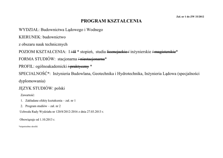 Zał. nr 1 do ZW 33/2012 PROGRAM KSZTAŁCENIA WYDZIAŁ: Budownictwa Lądowego i Wodnego KIERUNEK: budownictwo z obszaru nauk technicznych POZIOM KSZTAŁCENIA: I / II * stopień, studia licencjackie / inżynierskie / magisterskie* FORMA STUDIÓW: stacjonarna / niestacjonarna* PROFIL: ogólnoakademicki / praktyczny * SPECJALNOŚĆ*: Inżynieria Budowlana, Geotechnika i Hydrotechnika, Inżynieria Lądowa (specjalności dyplomowania) JĘZYK STUDIÓW: polski Zawartość: 1. Zakładane efekty kształcenia – zał. nr 1 2. Program studiów – zał. nr 2 Uchwała Rady Wydziału nr 120/8/2012-2016 z dnia 27.03.2013 r. Obowiązuje od 1.10.2013 r. *niepotrzebne skreślić Zał. nr 1 do Programu kształcenia I. EFEKTY KSZTAŁCENIA dla kierunku budownictwo studia pierwszego stopnia – profil ogólnoakademicki Wydział Budownictwa Lądowego i Wodnego Politechnika Wrocławska 1. Deskryptory obszarowe uwzględniane w opisie efektów kształcenia dla kierunku W opisie kierunku budownictwo dla pierwszego stopnia studiów uwzględniono wszystkie efekty kształcenia występujące w opisie efektów kształcenia dla obszaru studiów technicznych. Realizowany kierunek budownictwo jest przyporządkowany wyłącznie do obszaru kształcenia odpowiadającego naukom technicznym i zdefiniowane kierunkowe efekty kształcenia spełniają wszystkie wymagania określone dla tego obszaru, co oznacza, że pokrycie kompetencji inżynierskich przez kierunkowe efekty kształcenia jest spełnione automatycznie. 2. Efekty kształcenia 2.1. Ogólne efekty kształcenia Po zakończaniu studiów pierwszego stopnia o profilu ogólnoakademickim na kierunku budownictwo absolwent, na podstawie nabytej wiedzy, umiejętności i nabytych kompetencji, jest przygotowany do podejmowania decyzji w zakresie prawidłowego stosowania materiałów budowlanych, projektowania elementów i prostych obiektów budownictwa mieszkaniowego, komunalnego, przemysłowego i infrastruktury transportowej oraz technologii ich realizacji. Zna zasady wytrzymałości materiałów i mechaniki budowli oraz potrafi sformułować, zbudować a następnie zastosować modele obliczeniowe prostych konstrukcji inżynierskich. Potrafi tworzyć i odczytać rysunki techniczne, rozpoznawać opracowania kartograficzne i geodezyjne. Zna aktualne trendy w projektowaniu i wykonywaniu robót budowlanych. Potrafi zarządzać robotami budowlanymi. Ma wiedzę i umiejętności w zakresie stosowania zasad bezpieczeństwa i higieny pracy. Zna zasady analizy efektywności, kosztów i czasu realizacji robót budowlanych. Zna i stosuje przepisy prawa budowlanego. Wykorzystuje nowoczesne techniki komputerowe wspomagające modelowanie i projektowanie konstrukcji i procesów budowlanych oraz wspomagające kierowanie robotami budowlanymi. Potrafi krytycznie dobierać argumenty wspomagające kolektywne decyzje dotyczące realizacji zadań w budownictwie. Potrafi pracować w zespole. Jest odpowiedzialny za bezpieczeństwo pracy własnej i zapewnienie bezpieczeństwa współpracowników. Potrafi opracować raport dotyczący przebiegu 1 Zał. nr 1 do Programu kształcenia wykonywanych prac oraz projektowania. Jest świadomy konieczności podnoszenia kompetencji zawodowych i osobistych. Postępuje zgodnie z zasadami etyki. Absolwent jest przygotowany do: kierowania wykonawstwem wszystkich typów obiektów budowlanych; współudziału w projektowaniu obiektów użyteczności publicznej, przemysłowych i infrastruktury transportowej; organizowania produkcji elementów budowlanych; nadzoru wykonawstwa budowlanego oraz ustawicznego samokształcenia i doskonalenia zawodowego. Absolwent jest przygotowany do pracy w: przedsiębiorstwach wykonawczych; nadzorze budowlanym; wytwórniach betonu i elementów budowlanych; przemyśle materiałów budowlanych; jednostkach administracji państwowej i samorządowej związanych z budownictwem i architekturą. Absolwent włada językiem obcym na poziomie biegłości B2 Europejskiego Systemu Opisu Kształcenia Językowego Rady Europy oraz posiada umiejętności posługiwania się językiem specjalistycznym z zakresu kierunku studiów. Jest również przygotowany do podjęcia studiów drugiego stopnia o profilu ogólnoakademickim na kierunku budownictwo. Studenci, po skończonym V semestrze, wybierają jedną z 3 specjalności dyplomowania: Inżynieria Budowlana, Geotechnika i Hydrotechnika, Inżynieria Lądowa, na których otrzymują możliwość uzyskania rozszerzonej wiedzy i kompetencji w zakresie związanym z tą specjalnością dyplomowania. Specjalność dyplomowania Inżynieria Budowlana pozwala uzyskać pogłębioną wiedzę i kompetencje z zakresu projektowania i wykonawstwa obiektów budownictwa przemysłowego, konstrukcji betonowych i metalowych oraz podstaw projektowania architektonicznego. Specjalność dyplomowania Geotechnika i Hydrotechnika umożliwia uzyskanie pogłębionej wiedzy i umiejętności z zakresu geoinżynierii i hydrotechniki, projektowania i wykonawstwa prostych budowli i obiektów inżynierskich takich jak: wykopy, nasypy budowlane oraz związane z infrastrukturą transportową, budowle podziemne i budowle hydrotechniczne. Specyfiką specjalności dyplomowania Inżynieria Lądowa jest rozwinięcie u studentów wiedzy i kompetencji z zakresu budowy, wykonawstwa i utrzymania dróg, lotnisk, mostów, kolei oraz obiektów inżynierii miejskiej. 2 Zał. nr 1 do Programu kształcenia 2.2. Szczegółowe efekty kształcenia Objaśnienie oznaczeń używanych w symbolach: K1 – kierunkowe efekty kształcenia W – kategoria wiedzy (W) U – kategoria umiejętności (U) K (po podkreślniku) – kategoria kompetencji personalnych i społecznych (KPS) K1S – efekty kształcenia związane ze specjalnością dyplomowania _IBB_, _GIH_, _ILB_ - odniesienie odpowiednio do specjalności dyplomowania (Inżynieria Budowlana, Geotechnika i Hydrotechnika, Inżynieria Lądowa) T1A_ – efekty kształcenia dla obszaru nauk technicznych dla studiów pierwsze