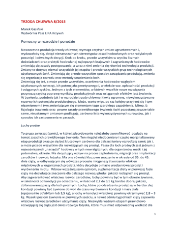 TRZODA CHLEWNA 8/2015 Marek Gasiński Wytwórnia Pasz LIRA Krzywiń Pomocny w rozrodzie i porodzie Nowoczesna produkcja trzody chlewnej wymaga częstych zmian ugruntowanych i, wydawałoby się, dotąd nienaruszalnych stereotypów zasad hodowlanych oraz radykalnych posunięć i odważnych decyzji. Krok po kroku, przede wszystkim w wyniku licznych doświadczeń oraz praktyki hodowlanej najlepszych krajowych i zagranicznych hodowców zmieniają się zasady postępowania, a wraz z nimi zmienia się również technologia produkcji. Zmiany te dotyczą niemal wszystkich jej etapów i prawie wszystkich grup technologicznych użytkowanych świń. Zmieniają się przede wszystkim sposoby zarządzania produkcją, zmienia się organizacja rozrodu oraz metody unasieniania loch. Zmieniają się też, a może przede wszystkim, oczekiwania hodowców względem użytkowanych zwierząt, ich potencjału genetycznego i, w efekcie ww. opłacalności produkcji i osiąganych zysków. Jednym z tych elementów, w których wszelkie nowe rozwiązania przynoszą szybką poprawę wyników produkcyjnych oraz osiąganych efektów jest żywienie. W żywieniu, podobnie jak i w rozrodzie trzody chlewnej tkwią ogromne, niewykorzystywane rezerwy ich potencjału produkcyjnego. Może, warto więc, po raz kolejny przyjrzeć się i tym niezmiennym i tym zmieniającym się elementom tego szerokiego zagadnienia. Mimo, iż fizjologia trawienia oraz pewne zasady prawidłowego żywienia świń pozostaną zawsze takie same, nieustannym zmianom podlegają, zarówno lista wykorzystywanych surowców, jak i sposobu ich zastosowania w paszach. Lochy prośne To grupa zwierząt (samic), w której zdecydowanie należałoby zweryfikować poglądy na temat zasad ich prawidłowego żywienia. Ten niegdyś niedoceniany i często marginalizowany etap produkcji okazuje się być kluczowym zarówno dla dalszej kariery rozrodczej samic jak i, a może przede wszystkim dla rozwijających się prosiąt. Pasza dla loch prośnych jest jednym z najważniejszych „narzędzi” hodowcy w tych newralgicznych, dla organizmów matki i jej potomstwa, okresie. Ma decydujący wpływ na proces zapłodnienia, migracji oraz implantacji zarodków i rozwoju łożyska. Ma ona również kluczowe znaczenie w okresie od 35. do 45. dnia ciąży, w odbywającym się wówczas procesie miogenezy (tworzenia włókien mięśniowych w organizmach prosiąt), który decyduje o masie urodzeniowej prosiąt i wyrównaniu miotu. Wbrew wcześniejszym opiniom, suplementacja diety w pierwszej fazie ciąży ma decydujące znaczenie dla dalszego rozwoju płodu i jakości rodzących się prosiąt. Aby zagwarantować właściwy rozwój zarodków, lochy powinny być w tym okresie żywione, w zależności od kondycji po odsadzeniu, w ilości od 2,2 do 3,5 kg bardzo dobrej jakości, zbilansowanej paszy dla loch prośnych. Lochy, które po odsadzeniu prosiąt są w bardzo złej kondycji powinny być żywione do woli do czasu wyrównania kondycji i masy ciała (opcjonalnie ad libitum lub 3,5 kg), a lochy w kondycji właściwej powinny otrzymywać 2,8 – 3 kg. Wysoki poziom żywienia w pierwszych sześciu, a nawet ośmiu tygodniach ciąży zapewnia właściwy rozwój zarodków i utrzymanie ciąży. Niezwykle ważnym etapem prawidłowo rozwijającej się ciąży jest okres rozwoju łożyska, które musi mieć odpowiednią wielkość dla 1 właściwego odżywiania prosiąt. Wielkość łożyska zależy również od wielkości zarodków, należy więc zadbać także podczas laktacji o właściwe pobieranie paszy, bowiem to decyduje o prawidłowym i równomiernym rozwoju pęcherzyków jajnikowych, tym samym o jakości komórki jajowej i, dalej, o wielkości zarodka. Jeżeli łożysko będzie zbyt małe, to w ostatniej fazie ciąży, bez względu na ilość podawanej lochom paszy masa miotu nie będzie już wzrastać (okres miogenezy). Ponadto może następować otłuszczanie gruczołu mlekowego ze wszelkimi tego negatywnymi konsekwencjami. Optymalnym i sprawdzonym rozwiązaniem jest podawanie lochom okresie ciąży średnio zaawansowanej ok. 2,2 kg paszy, a w okresie ostatnich czterech tygodni ok. 3,5 kg na sztukę. Lochy karmiące Prawidłowe żywienie w okresie ciąży, właściwe przygotowanie samicy do laktacji oraz żywienie w okresie karmienia prosiąt to zagadnienia warunkujące optymalne użytkowanie rozpłodowe loch w całym ich życiu. Dlatego szczególnie ważnym jest przebieg pierwszej laktacji u loch pierwiastek. Najczęstszymi problemami w tej grupie loch są wyniki osiągane w drugim miocie, a przyczynami obniżonej plenności oraz gorszej skuteczności krycia jest mniejsza liczba komórek jajowych uwalnianych z pęcherzyków jajnikowych oraz zwiększona śmiertelność zarodków. Przyczyn tych niepowodzeń należy dopatrywać się w okresie poprzedzającym laktację. Laktacja jest ogromnym obciążeniem dla młodych samic, zdecydowanie większym niż dla starszych loch. Pierwiastki, wykazujące nieustannie wysokie zapotrzebowanie na składniki pokarmowe, wykazują równocześnie niższą zdolność pobierania pokarmu, posiadając przy tym mniejsze zapasy własne tłuszczu i białek. Niższa zdolność pobierania pokarmu powoduje, że i tak mniejsze zasoby własne organizmu lochy są bardzo poważnie uszczuplane. Lochy pierwiastki, które otrzymują odpowiednie ilości energii i białka w paszy w okresie laktacji, charakteryzują się znacznie krótszym okresem tzw. dni pustych w porównaniu do samic żywionych paszą ubogą w energię i białko. Ponadto, niski poziom pobierania paszy podczas laktacji może także negatywnie wpłynąć na przeżywanie zarodków. Dotyczy to przede wszystkim tych loch, które otrzymują ograniczoną dawkę pokarmową w ostatnich 2-3 tygodniach laktacji. Poważnym problemem jest nadmierne zapasanie loch i nadwaga. Jednym ze sposobów zapobiegania wystąpieniu nadwagi u samic jest prawidłowe bilansowanie i optymalizacja zawartości składników odżywczy