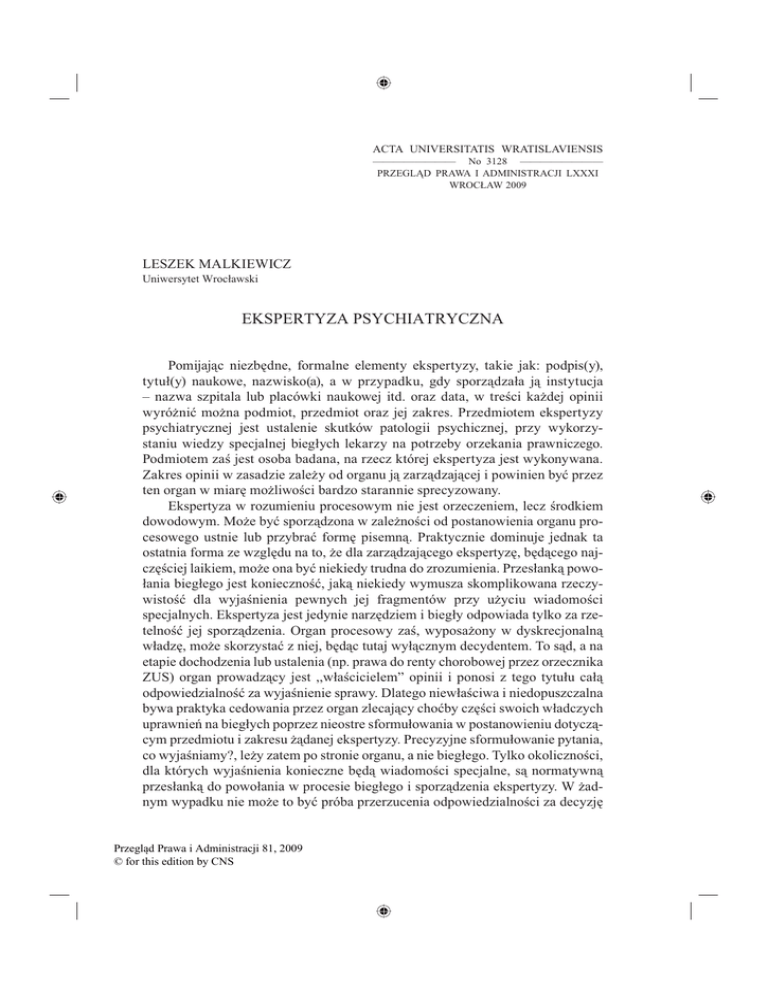 ACTA UNIVERSITATIS WRATISLAVIENSIS ———————— No 3128 ———————— PRZEGLĄD PRAWA I ADMINISTRACJI LXXXI WROCŁAW 2009 LESZEK MALKIEWICZ Uniwersytet Wrocławski EKSPERTYZA PSYCHIATRYCZNA Pomijając niezbędne, formalne elementy ekspertyzy, takie jak: podpis(y), tytuł(y) naukowe, nazwisko(a), a w przypadku, gdy sporządzała ją instytucja – nazwa szpitala lub placówki naukowej itd. oraz data, w treści każdej opinii wyróżnić można podmiot, przedmiot oraz jej zakres. Przedmiotem ekspertyzy psychiatrycznej jest ustalenie skutków patologii psychicznej, przy wykorzystaniu wiedzy specjalnej biegłych lekarzy na potrzeby orzekania prawniczego. Podmiotem zaś jest osoba badana, na rzecz której ekspertyza jest wykonywana. Zakres opinii w zasadzie zależy od organu ją zarządzającej i powinien być przez ten organ w miarę możliwości bardzo starannie sprecyzowany. Ekspertyza w rozumieniu procesowym nie jest orzeczeniem, lecz środkiem dowodowym. Może być sporządzona w zależności od postanowienia organu procesowego ustnie lub przybrać formę pisemną. Praktycznie dominuje jednak ta ostatnia forma ze względu na to, że dla zarządzającego ekspertyzę, będącego najczęściej laikiem, może ona być niekiedy trudna do zrozumienia. Przesłanką powołania biegłego jest konieczność, jaką niekiedy wymusza skomplikowana rzeczywistość dla wyjaśnienia pewnych jej fragmentów przy użyciu wiadomości specjalnych. Ekspertyza jest jedynie narzędziem i biegły odpowiada tylko za rzetelność jej sporządzenia. Organ procesowy zaś, wyposażony w dyskrecjonalną władzę, może skorzystać z niej, będąc tutaj wyłącznym decydentem. To sąd, a na etapie dochodzenia lub ustalenia (np. prawa do renty chorobowej przez orzecznika ZUS) organ prowadzący jest ,,właścicielem” opinii i ponosi z tego tytułu całą odpowiedzialność za wyjaśnienie sprawy. Dlatego niewłaściwa i niedopuszczalna bywa praktyka cedowania przez organ zlecający choćby części swoich władczych uprawnień na biegłych poprzez nieostre sformułowania w postanowieniu dotyczącym przedmiotu i zakresu żądanej ekspertyzy. Precyzyjne sformułowanie pytania, co wyjaśniamy?, leży zatem po stronie organu, a nie biegłego. Tylko okoliczności, dla których wyjaśnienia konieczne będą wiadomości specjalne, są normatywną przesłanką do powołania w procesie biegłego i sporządzenia ekspertyzy. W żadnym wypadku nie może to być próba przerzucenia odpowiedzialności za decyzję Przegląd Prawa i Administracji 81, 2009 © for this edition by CNS 100 LESZEK MALKIEWICZ z organu orzekającego na biegłego. Biegły sporządza – relatio periti – opinię, która może być (lecz nie musi) wykorzystana jako samoistny, inny niż zeznania świadka, dowód rozstrzygający o istotnych dla sprawy okolicznościach, do których ustalenia niezbędne są wiadomości specjalne. Od świadka rola procesowa biegłego różni się tym, że o fakcie dowodzonym przez sąd (strony) relacjonuje on pośrednio. Świadek zaś co do zasady, pomijając testis ex auditu, jest naocznym uczestnikiem dowodzonych faktów. Podobieństwo świadka i biegłego normatywnie wyraża się tym, że przepisy wykluczające ze sceny procesowej dotyczą podobnego zakresu i okoliczności. Biegłym nie może być osoba, która w wypadku powołania go na świadka mogłaby odmówić zeznań, uzyskać od sądu zwolnienie albo nie mogłaby być przesłuchiwana z powodu bezwzględnego zakazu dowodowego. Chociaż biegły nie jest sędzią faktu, lecz opiniodawcą, to ustawodawca wyklucza udział w procesie biegłego wszędzie tam, gdzie zaistnieją okoliczności, które ex lege wyłączają sędziego. Biegły jest wyłączony, gdy sprawa dotyczy go osobiście, gdy był świadkiem dowodzonego zdarzenia lub był przesłuchiwany w charakterze świadka, kiedy małżonek lub konkubent jest stroną lub pokrzywdzonymi. Ponadto wówczas, gdy prowadził postępowanie przygotowawcze lub był obrońcą, pełnomocnikiem, przedstawicielem ustawowym strony lub pokrzywdzonego. Wymienione zakazy tym razem przybliżają rolę procesową biegłego do sędziego. Wiadomości specjalne mogą niekiedy wyjaśnić pewne kwestie procesowe dotyczące zarówno płaszczyzny faktycznej, jak i prawnej. Zadaniem i celem opinii psychiatrycznej jest opis i stopień rzeczywistości psychopatologicznej lub jej brak u badanego podmiotu przez biegłego psychiatrę. O skutkach prawnych wynikających z ułomności psychicznej opiniowanego orzeka natomiast organ decydencki. Ocena stopnia niepoczytalności jest głównym powodem zarządzenia ekspertyzy psychiatrycznej. Przesłanką jej sporządzenia są uzasadnione wątpliwości co do normalności stanu psychicznego danej osoby. Kompetencje do jej zarządzenia wynikają z literalnego brzmienia art. 202 § 1 k.p.k. W celu wydania opinii o stanie zdrowia psychicznego oskarżonego sąd, a w postępowaniu przygotowawczym prokurator powołuje co najmniej dwóch biegłych lekarzy psychiatrów. Uzasadnione wątpliwości co do stanu psychicznego pokrzywdzonego i świadka są konieczną, niezbędną przesłanką do sporządzenia na tę okoliczność ekspertyzy. Art. 192 k.p.k. bowiem w paragrafie pierwszym dotyczącym pokrzywdzonego stanowi: ,,jeśli karalność czynu zależy od stanu zdrowia pokrzywdzonego nie może on sprzeciwić się oględzinom i badaniom niepołączonym z zabiegiem chirurgicznym lub obserwacją w szpitalu psychiatrycznym. Przepis ten stanowi, iż pokrzywdzony musi w pewnych okolicznościach poddać się badaniom lekarskim, w tym psychiatrycznym, jeśli nie jest ono połączone z zabiegiem chirurgicznym lub hospitalizacją psychiatryczną”. Paragraf drugi zaś wymienionego przepisu reguluje sytuację świadka, wobec którego istnieją wątpliwości co do jego stanu Przegląd Prawa i Administracji 81, 2009 © for this edition by CNS EKSPERTYZA PSYCHIATRYCZNA 101 psychicznego, stanu rozwoju umysłowego, 
