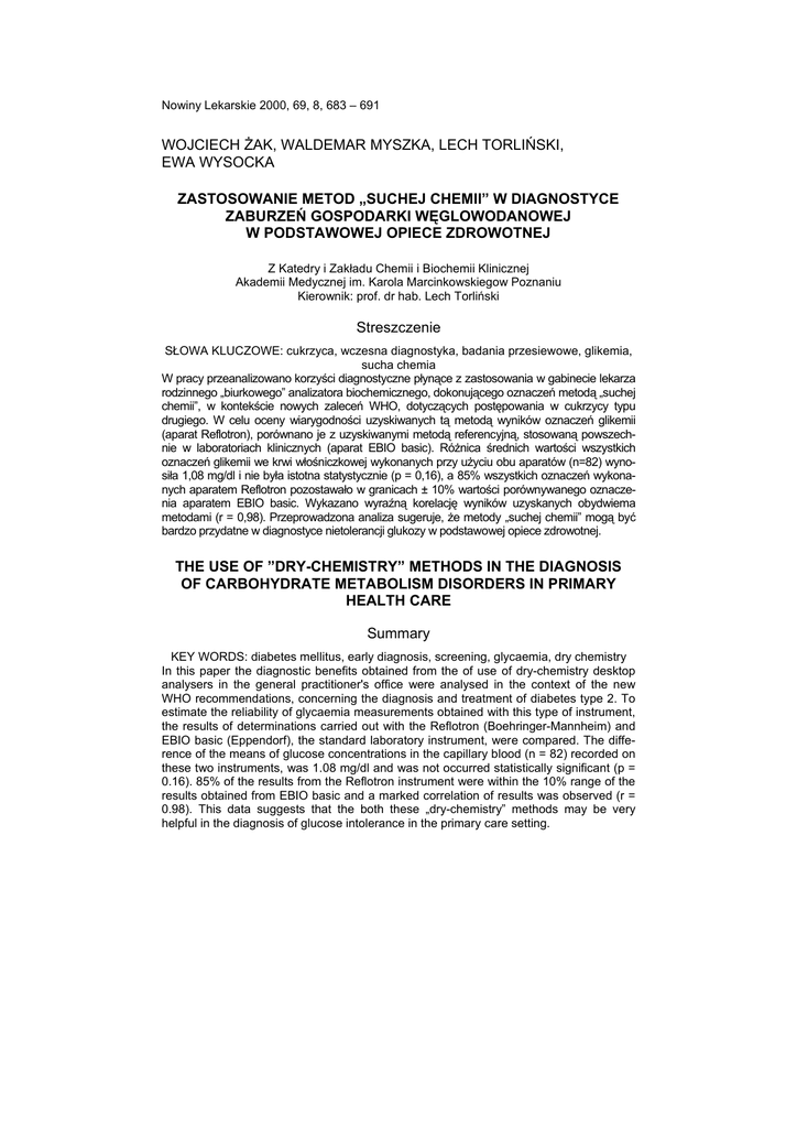 Nowiny Lekarskie 2000, 69, 8, 683 – 691 WOJCIECH ŻAK, WALDEMAR MYSZKA, LECH TORLIŃSKI, EWA WYSOCKA ZASTOSOWANIE METOD „SUCHEJ CHEMII” W DIAGNOSTYCE ZABURZEŃ GOSPODARKI WĘGLOWODANOWEJ W PODSTAWOWEJ OPIECE ZDROWOTNEJ Z Katedry i Zakładu Chemii i Biochemii Klinicznej Akademii Medycznej im. Karola Marcinkowskiegow Poznaniu Kierownik: prof. dr hab. Lech Torliński Streszczenie SŁOWA KLUCZOWE: cukrzyca, wczesna diagnostyka, badania przesiewowe, glikemia, sucha chemia W pracy przeanalizowano korzyści diagnostyczne płynące z zastosowania w gabinecie lekarza rodzinnego „biurkowego” analizatora biochemicznego, dokonującego oznaczeń metodą „suchej chemii”, w kontekście nowych zaleceń WHO, dotyczących postępowania w cukrzycy typu drugiego. W celu oceny wiarygodności uzyskiwanych tą metodą wyników oznaczeń glikemii (aparat Reflotron), porównano je z uzyskiwanymi metodą referencyjną, stosowaną powszechnie w laboratoriach klinicznych (aparat EBIO basic). Różnica średnich wartości wszystkich oznaczeń glikemii we krwi włośniczkowej wykonanych przy użyciu obu aparatów (n=82) wynosiła 1,08 mg/dl i nie była istotna statystycznie (p = 0,16), a 85% wszystkich oznaczeń wykonanych aparatem Reflotron pozostawało w granicach ± 10% wartości porównywanego oznaczenia aparatem EBIO basic. Wykazano wyraźną korelację wyników uzyskanych obydwiema metodami (r = 0,98). Przeprowadzona analiza sugeruje, że metody „suchej chemii” mogą być bardzo przydatne w diagnostyce nietolerancji glukozy w podstawowej opiece zdrowotnej. THE USE OF ”DRY-CHEMISTRY” METHODS IN THE DIAGNOSIS OF CARBOHYDRATE METABOLISM DISORDERS IN PRIMARY HEALTH CARE Summary KEY WORDS: diabetes mellitus, early diagnosis, screening, glycaemia, dry chemistry In this paper the diagnostic benefits obtained from the of use of dry-chemistry desktop analysers in the general practitioner's office were analysed in the context of the new WHO recommendations, concerning the diagnosis and treatment of diabetes type 2. To estimate the reliability of glycaemia measurements obtained with this type of instrument, the results of determinations carried out with the Reflotron (Boehringer-Mannheim) and EBIO basic (Eppendorf), the standard laboratory instrument, were compared. The difference of the means of glucose concentrations in the capillary blood (n = 82) recorded on these two instruments, was 1.08 mg/dl and was not occurred statistically significant (p = 0.16). 85% of the results from the Reflotron instrument were within the 10% range of the results obtained from EBIO basic and a marked correlation of results was observed (r = 0.98). This data suggests that the both these „dry-chemistry” methods may be very helpful in the diagnosis of glucose intolerance in the primary care setting. 684 W. Żak i inni Za jedno z podstawowych wyzwań w leczeniu cukrzycy typu drugiego uznaje się obecnie zapobieganie jej przewlekłym powikłaniom [16]. Ich objawy stwierdza się aż w 50% przypadków już w momencie rozpoznania choroby [18, 19]. Jednocześnie spośród osób, u których wykrywa się cukrzycę w badaniach populacyjnych, zaledwie połowa okazuje się wiedzieć o swojej chorobie wcześniej [5, 10, 16]. Klinicznie jawna postać cukrzycy poprzedzona jest zwykle około dziesięcioletnim okresem zaburzeń metabolizmu węglowodanów, wykrywalnych za pomocą badań biochemicznych, przede wszystkim – oznaczenia glikemii na czczo oraz w dwie godziny po obciążeniu glukozą [6]. W zależności od uzyskanych wartości możliwe jest w tym okresie rozpoznanie cukrzycy lub poprzedzających ją stanów metabolicznych, jak upośledzona tolerancja glukozy (IGT), czy nieprawidłowa glikemia na czczo (IFG). W pierwszym przypadku (cukrzyca) wdrożenie intensywnego leczenia umożliwia zahamowanie, a przynajmniej spowolnienie tempa rozwoju powikłań. W drugim (IFG, IGT), wprowadzenie odpowiednich zaleceń może powstrzymać rozwój choroby, a u części pacjentów przywrócić nawet stan prawidłowego metabolizmu cukrów [2, 6]. Wszystko to wskazuje na kluczowe znaczenie wczesnego rozpoznawania zaburzeń gospodarki węglowodanowej, którego główny ciężar spoczywa na podstawowej opiece zdrowotnej. W celu poprawy jego skuteczności światowa Organizacja Zdrowia, w przyjętych w 1999 roku ustaleniach, zaleca rozpoczęcie diagnostyki od przesiewowego badania glikemii o dowolnej porze dnia, czyli tzw. przygodnej (nie wymagającej od pacjenta bycia na czczo) [16]. Stwierdzenie stężenia glukozy przekraczającego w osoczu krwi żylnej wartość 100 mg/dl powinno skłonić lekarza do zlecenia oznaczenia glikemii na czczo, a uzyskanie w tym ostatnim wartości pomiędzy górną granicą normy a sygnalizującą cukrzycę (110-125 mg/dl w osoczu lub 100-110 we krwi włośniczkowej) – do wykonania doustnego testu tolerancji glukozy (OGTT) [11]. Zastosowanie w gabinecie lekarza rodzinnego metod tzw. „suchej chemii”, dostarczających wyniku oznaczenia glikemii we krwi włośniczkowej w przeciągu kilku minut, umożliwiałoby skrócenie czasu realizacji zalecanego przez WHO algorytmu postępowania i zwiększenie jego diagnostycznej skuteczności. Możliwość oceny glikemii przygodnej jeszcze w trakcie wizyty pacjenta, zwłaszcza obarczonego większym ryzykiem rozwoju cukrzycy, ułatwiałaby – w przypadku stwierdzenia podwyższonej wartości – nakłonienie go do oznaczenia glikemii na czczo, a w razie potrzeby wykonania od razu OGTT i postawienia rozpoznania już w czasie drugiej wizyty (ryc. 1). Zastosowanie metod „suchej chemii” w diagnostyce zaburzeń ... 685 686 W. Żak i inni Skoro koszty wykonywanych tą metodą oznaczeń glikemii w porównaniu z metodą tradycyjną są podobne [14], nasuwa się pytanie o przyczyny stosunkowo ich niewielkiej popularności w Polsce. Być może leżą one również w przekonaniu o mniejszej wiarygodności uzyskiwanych w ten sposób wyników. Skłoniło to autorów do porównania war