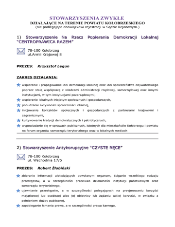 STOWARZYSZENIA ZWYKŁE DZIAŁAJĄCE NA TERENIE POWIATU KOŁOBRZESKIEGO (nie podlegające obowiązkowi rejestracji w Sądzie Rejonowym.) 1) Stowarzyszenie Na Rzecz “CENTROPRAWICA RAZEM” Popierania Demokracji Lokalnej 78-100 Kołobrzeg ul.Armii Krajowej 8 PREZES: Krzysztof Legun ZAKRES DZIAŁANIA: wspieranie i propagowanie idei demokracji lokalnej oraz idei społeczeństwa obywatelskiego poprzez stałą współpracę z władzami administracji rządowej, samorządowej oraz innymi instytucjami, w tym instytucjami pozarządowymi, wspieranie lokalnych inicjatyw społecznych i gospodarczych, pobudzanie aktywności społeczności lokalnej, inicjowanie kontaktów społecznych i gospodarczych z partnerami krajowymi i zagranicznymi, kultywowanie tradycji demokratycznych i patriotycznych, wypowiadanie się w sprawach publicznych, istotnych dla mieszkańców Kołobrzegu i powiatu na forum organów samorządu terytorialnego oraz w lokalnych mediach 2) Stowarzyszenie Antykorupcyjne “CZYSTE RĘCE” 78-100 Kołobrzeg ul. Wschodnia 17/5 PREZES: Robert Żłobiński zbieranie informacji ułatwiających powołanym organom, ściganie wszelkiego rodzaju przestępstw, a w szczególności przeciwko działalności instytucji państwowych oraz samorządu terytorialnego, ujawnianie przestępstw, a w szczególności polegających na przyjmowaniu korzyści majątkowej lub osobistej albo jej obietnicy lub żądaniu takiej korzyści, w związku z pełnieniem służby publicznej, zapobieganie łamania prawa, a w szczególności prawa karnego, promocja pozytywnych zachowań społecznych, których zadaniem jest wypracowanie wzorcowej obywatelskiej postawy polegającej na przestrzeganiu prawa w każdej dziedzinie, zwalczanie patologi społecznych związanych z łamaniem prawa, a w szczególności przestępstw tzw. Łapownictwa. 3) Stowarzyszenie Kupców Nadmorskich 78-100 Kołobrzeg ul.Dąbrówki 8/8 354 45 37 PREZES: Roman Wojciechowski ZAKRES DZIAŁANIA: przedstawienie organom samorządu terytorialnego projektów przedsięwzięć oraz aktów prawnych, organizowanie szkoleń i spotkań informacyjnych dla członków stowarzyszenia, jak również dla zainteresowanych mieszkańców w zakresie objętym celami stowarzyszenia, reprezentowanie interesów członków wobec organów władzy i administracji państwowej, samorządowej i innych instytucji, 4) Kołobrzeskie Towarzystwo Gospodarczo-Kulturalne 78-100 Kołobrzeg ul. Zapleczna 5A/1 PREZES: Roman Strobejko ZAKRES DZIAŁANIA: wszechstronna ochrona interesów społeczno-zawodowych grup związanych z handlem, gospodarką morską oraz spraw dotyczących społecznego oddziaływania na ich rzecz, poprzez: wszechstronną pomoc w prowadzeniu działalności, reprezentowanie uzasadnionych interesów członków stowarzyszenia wobec organów władzy i administracji państwowej oraz organów samorządowych. 5) Kołobrzeskie Stowarzyszenie Dziennikarzy 78-100 Kołobrzeg ul.Piastowska 7/1 352 09 30 PREZES: Mariusz Wolański ZAKRES DZIAŁANIA: działalność na rzecz społeczeństwa obywatelskiego przez upowszechnianie i rozwój komunikacji społecznej, rzetelnego przekazywania informacji oraz swobodnego wypowiadania opinii za pośrednictwem wszystkich środków komunikacji społecznej, działalność kulturalna i edukacyjna na rzecz członków, działanie na rzecz osiągania wysokich kwalifikacji moralnych i zawodowych dziennikarzy, ochrona godności i etyki zawodu, reprezentowanie oraz ochrona twórczych i zawodowych, materialnych i społecznych potrzeb dziennikarzy. 6) Kołobrzeskie Stowarzyszenie Wspólnot Mieszkaniowych 78-100 Kołobrzeg ul. Zwycięzców 1/11 tel. 354 06 29 E-MAIL: [email protected] PREZES: Eugeniusz Sienkiewicz ZAKRES DZIAŁANIA: wspieranie informacyjne, szkoleniowe, organizacyjne i prawne Wspólnot Mieszkaniowych, popularyzacja idei i doświadczeń Wspólnot Mieszkaniowych współpraca z organami administracji rządowej i samorządowej. 7) Towarzystwo Opieki nad Zabytkami Koło w Kołobrzegu 78-100 Kołobrzeg ul.Armii Krajowej 28/3 tel. 354 23 68 PREZES: Robert Dziemba 8) Stowarzyszenie Sympatyków Kołobrzeskiej Kotwicy 78-100 Kołobrzeg ul.Walki Młodych 36/15 PREZES: Piotr Drewkowski ZAKRES DZIAŁANIA: wspieranie Klubu MKP Kotwica Kołobrzeg, pozyskiwanie sponsorów dla Klubu, wspieranie działań reklamowych Klubu, działania mające na celu pozyskiwanie członków Stowarzyszenia, rozwijanie i propagowanie inicjatyw, postaw i działań sprzyjających wcielaniu w życie idei czynnego kibicowania i wspierania kołobrzeskiej Kotwicy, wytwarzania atmosfery szacunku i zaufania do kibiców i Klubu Kotwica Kołobrzeg oraz ich upowszechnianie,rzeczenictwo interesów członków Stowarzyszenia przed organami władzy państwowej i samorządowej oraz innymi podmiotami życia publicznego, skupienie kubiców dla utrzymania stałego pogłębiania więzi koleżeńskich i różnorodne świadczenia w ramach pomocy koleżeńskiej, współpraca z Klubem, mediami i środowiskiem biznesowym, organizowanie imrez sportowych, kulturalnych i rozrywkowych, opieka nad osobami dotkniętymi przypadkami losowymi. 9) Stowarzyszenie “BEZPIECZNI” 78-100 Kołobrzeg ul. Złota 11B/27 PREZES: Wiesława Sielicka ZAKRES DZIAŁANIA: Działanie na rzecz małych i średnich podmiotów gospodarczych, osób prowadzących jednoosobową działalność gospodarczą, osób poszukujących pracy, popularyzacja wiedzy z dziedziny ubezpieczeń na życie wśród społeczeństwa, promocja i popieranie działań związanych z ochroną zdrowia i zapobieganie skutkom nieszczęśliwych wypadków, tworzenie płaszczyzn wymiany informacji i doświadczeń pomiędzy osobami i instytucjami. 10) Grupa Ratownicza “PARAMEDIC” Kołobrzeg 78-100 Kołobrzeg ul. Koniecpolskiego 1c/1 PREZES: Jolanta Pius ZAKRES DZIAŁANIA: upowszechnianie i rozwijanie wiedzy o medycynie ratunkowej, współudział w inicjowaniu i koordynacji programów edukacyjnych z zakresu pierwszej pomocy przedmedycznej, prowadzenie działalności 