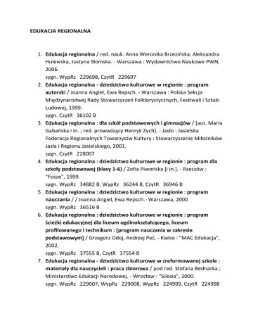 EDUKACJA REGIONALNA 1. Edukacja regionalna / red. nauk. Anna Weronika Brzezińska, Aleksandra Hulewska, Justyna Słomska. - Warszawa : Wydawnictwo Naukowe PWN, 2006. sygn. WypRz 229698, CzytR 229697 2. Edukacja regionalna - dziedzictwo kulturowe w regionie : program autorski / Joanna Angiel, Ewa Repsch. - Warszawa : Polska Sekcja Międzynarodwej Rady Stowarzyszeń Folklorystycznych, Festiwali i Sztuki Ludowej, 1999. sygn. CzytR 36102 B 3. Edukacja regionalna : dla szkół podstawowych i gimnazjów / [aut. Maria Gabańska i in. ; red. prowadzący Henryk Zych]. - Jasło : Jasielska Federacja Regionalnych Towarzystw Kultury : Stowarzyszenie Miłośników Jasła i Regionu Jasielskiego, 2001. sygn. CzytR 228007 4. Edukacja regionalna : dziedzictwo kulturowe w regionie : program dla szkoły podstawowej (klasy 1-6) / Zofia Piwońska [i in.]. - Rzeszów : "Fosze", 1999. sygn. WypRz 34882 B, WypRz 36244 B, CzytR 36946 B 5. Edukacja regionalna : dziedzictwo kulturowe w regionie : program nauczania / / Joanna Angiel, Ewa Repsch.- Warszawa, 2000 sygn. WypRz 36516 B 6. Edukacja regionalna : dziedzictwo kulturowe w regionie : program ścieżki edukacyjnej dla liceum ogólnokształcącego, liceum profilowanego i technikum : [program nauczania w zakresie podstawowym] / Grzegorz Odoj, Andrzej Peć. - Kielce : "MAC Edukacja", 2002. sygn. WypRz 37555 B, CzytR 37554 B 7. Edukacja regionalna - dziedzictwo kulturowe w zreformowanej szkole : materiały dla nauczycieli : praca zbiorowa / pod red. Stefana Bednarka ; Ministerstwo Edukacji Narodowej. - Wrocław : "Silesia", 2000. sygn. WypRz 229007, WypRz 229008, WypRz 224999, CzytR 224998 8. Edukacja regionalna - dziedzictwo kulturowe w zreformowanej szkole : praca zbiorowa / pod red. Stefana Bednarka ; Ministerstwo Edukacji Narodowej. - Wrocław : "Silesia", 1999. sygn. WypRz 223271, WypRz 222700, CzytR 222699 9. Edukacja regionalna : poradnik dla nauczycieli szkoły podstawowej / pod. red. Zofii Piwońskiej ; [aut. Andrzej Łobaza i in.]. - Rzeszów : "Fosze", 2001. sygn. WypRz 225143, CzytR 224971 10.Edukacja regionalna : problemy podstawowe i otwarte / Piotr Paweł Petrykowski. - Toruń : Toruń : Uniwersytet Mikołaja Kopernika, 2003. sygn. WypRz 228079, 11.Edukacja regionalna : z historii, teorii i praktyki / red. Maria Teresa Michalewska ; Uniwersytet Śląski w Katowicach. Instytut Pedagogiki. Katedra Pedagogiki Wczesnoszkolnej. - Kraków : "Impuls", 1999. sygn. WypRz 222778, CzytR 222741 12.Między adwentem a karnawałem : dziedzictwo kulturowe w regionie : materiały pomocnicze dla nauczycieli i wychowawców / wybór i oprac. Barbara Kozik.- Nowy Sącz, 1997 sygn. WypRz 34123 B 13.Pokoleniowe przemiany wsi podkarpackiej 1930-2010 : wybrane dziedziny tradycji, kultury i edukacji regionu krośnieńskiego / Kazimierz Szmyd. - Rzeszów : Uniwersytet Rzeszowski, 2012. sygn. WypRz 240237 14.Regionalizm w nauczaniu historii / Henryk Krzyżewski. - Warszawa : Państwowe Zakłady Wydawnictw Szkolnych, 1962. sygn. WypRz 60883, WypRz 60882, WypRz 59621 15.Regionalizm w nauczaniu języka polskiego : zbiór prac / pod. red. Edmunda Rosnera. - Warszawa : Wydawnictwa Szkolne i Pedagogiczne, 1975. sygn. WypRz 147371, WypRz 147372, WypRz 147180 16. Rzeszów - Rzeszowszczyzna : przeszłość daleka i bliska : materiały pomocnicze dla nauczycieli / [red. Sylwester Czopek]. - Rzeszów : Muzeum Okręgowe : Stowarzyszenie Naukowe Archeologów Polskich. Oddział, 2000. sygn. WypRz 228310, CzytR 224602 17.Szkoła a regionalizm : materiały z sesji popularnonaukowej (Jasło, 21 maja 1999 r.) / pod red. Wiesława Hapa. - Jasło : Stowarzyszenie Miłośników Jasła i Regionu Jasielskiego, 2000. sygn. CzytR 228014