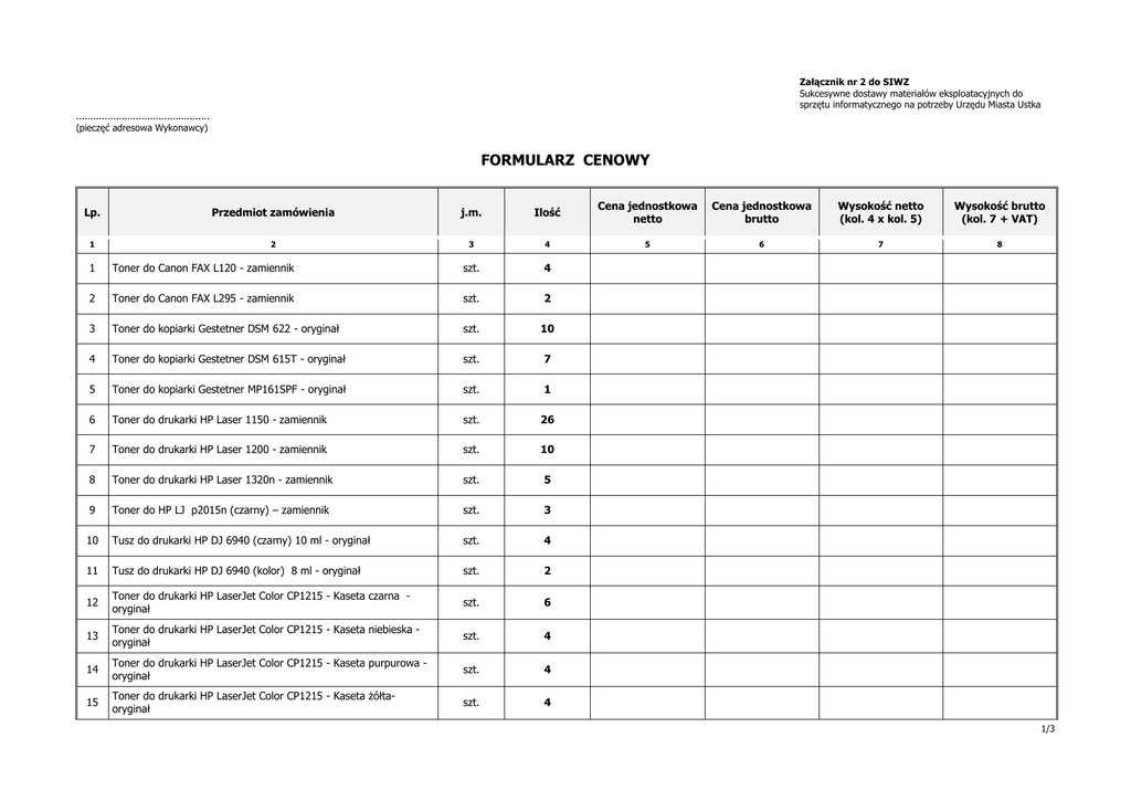 Załącznik nr 2 do SIWZ Sukcesywne dostawy materiałów eksploatacyjnych do sprzętu informatycznego na potrzeby Urzędu Miasta Ustka ............................................... (pieczęć adresowa Wykonawcy) FORMULARZ CENOWY Lp. Przedmiot zamówienia j.m. Ilość Cena jednostkowa netto Cena jednostkowa brutto Wysokość netto (kol. 4 x kol. 5) Wysokość brutto (kol. 7 + VAT) 1 2 3 4 5 6 7 8 1 Toner do Canon FAX L120 - zamiennik szt. 4 2 Toner do Canon FAX L295 - zamiennik szt. 2 3 Toner do kopiarki Gestetner DSM 622 - oryginał szt. 10 4 Toner do kopiarki Gestetner DSM 615T - oryginał szt. 7 5 Toner do kopiarki Gestetner MP161SPF - oryginał szt. 1 6 Toner do drukarki HP Laser 1150 - zamiennik szt. 26 7 Toner do drukarki HP Laser 1200 - zamiennik szt. 10 8 Toner do drukarki HP Laser 1320n - zamiennik szt. 5 9 Toner do HP LJ p2015n (czarny) – zamiennik szt. 3 10 Tusz do drukarki HP DJ 6940 (czarny) 10 ml - oryginał szt. 4 11 Tusz do drukarki HP DJ 6940 (kolor) 8 ml - oryginał szt. 2 12 Toner do drukarki HP LaserJet Color CP1215 - Kaseta czarna oryginał szt. 6 13 Toner do drukarki HP LaserJet Color CP1215 - Kaseta niebieska oryginał szt. 4 14 Toner do drukarki HP LaserJet Color CP1215 - Kaseta purpurowa oryginał szt. 4 15 Toner do drukarki HP LaserJet Color CP1215 - Kaseta żółtaoryginał szt. 4 1/3 16 Toner do drukarki Samsung CLX-3170 (czarny) – oryginał szt. 2 17 Toner do drukarki Samsung CLX-3170 (purpura) – oryginał szt. 2 18 Toner do drukarki Samsung CLX-3170 (żółty) – oryginał szt. 2 19 Toner do drukarki Samsung CLX-3170 (niebieski) – oryginał szt. 2 20 Bęben światłoczuły OPC DRUM do drukarki Samsung CLX-3170– (oryginał) szt. 1 21 Toner do drukarki Samsung ML-2850DR– oryginał szt. 10 22 Tusz do drukarki HP Officejet Pro 8000 (czarny) - oryginał szt. 3 23 Tusz do drukarki HP Officejet Pro 8000 (niebieski) - oryginał szt. 3 24 Tusz do drukarki HP Officejet Pro 8000 (purpura) - oryginał szt. 3 25 Tusz do drukarki HP Officejet Pro 8000 (żółty) - oryginał szt. 3 26 Toner do drukarki OKI C610 (czarny) - oryginał szt. 2 27 Toner do drukarki OKI C610 (niebieski) - oryginał szt. 2 28 Toner do drukarki OKI C610 (purpura) - oryginał szt. 2 29 Toner do drukarki OKI C610 (żółty) - oryginał szt. 2 30 Bęben do OKI c8800 (niebieski) - oryginał szt. 1 31 Bęben do OKI c8800 (purpura) - oryginał szt. 1 32 Bęben do OKI c8800 (żółty) - oryginał szt. 1 33 Bęben do OKI c8800 (czarny) - oryginał szt. 1 34 Toner do drukarki HP Color Laser Jet 5500 (kaseta czarna) oryginał szt. 1 35 Taśma do drukarki igłowej OKI ML 6300FB – oryginał szt. 6 36 Bęben światłoczuły OPC DRUM do drukarki Konica Minolta PagePro 2550 - oryginał szt. 4 2/3 37 Toner do drukarki Konica Minolta PagePro 2550 (kaseta czarna) zamiennik szt. 16 38 Toner do drukarki Konica Minolta PagePro 2550 (kaseta niebieska) - zamiennik szt. 18 39 Toner do drukarki Konica Minolta PagePro 2550 (kaseta żółta) zamiennik szt. 15 40 Toner do drukarki Konica Minolta PagePro 2550 (kaseta purpurowa - zamiennik szt. 15 41 Toner do drukarki XeroxWorkCentre 3220 (czarny) - oryginał szt. 2 Wartość (cena) oferty: ............................... dnia .......................... (miejscowość) .......................................................................... (pieczątka i podpis uprawomocnionego przedstawiciela Wykonawcy) 3/3