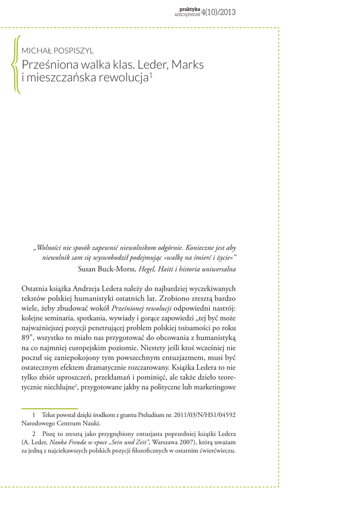 praktyka anzcyteroet 4(10)/2013 } Michał Pospiszyl Prześniona walka klas. Leder, Marks i mieszczańska rewolucja1 „Wolności nie sposób zapewnić niewolnikom odgórnie. Konieczne jest aby niewolnik sam się wyswobodził podejmując »walkę na śmierć i życie«” Susan Buck-Morss, Hegel, Haiti i historia uniwersalna Ostatnia książka Andrzeja Ledera należy do najbardziej wyczekiwanych tekstów polskiej humanistyki ostatnich lat. Zrobiono zresztą bardzo wiele, żeby zbudować wokół Prześnionej rewolucji odpowiedni nastrój: kolejne seminaria, spotkania, wywiady i gorące zapowiedzi „tej być może najważniejszej pozycji penetrującej problem polskiej tożsamości po roku 89”, wszystko to miało nas przygotować do obcowania z humanistyką na co najmniej europejskim poziomie. Niestety jeśli ktoś wcześniej nie poczuł się zaniepokojony tym powszechnym entuzjazmem, musi być ostatecznym efektem dramatycznie rozczarowany. Książka Ledera to nie tylko zbiór uproszczeń, przekłamań i pominięć, ale także dzieło teoretycznie niechlujne2, przygotowane jakby na polityczne lub marketingowe 1 Tekst powstał dzięki środkom z grantu Preludium nr. 2011/03/N/HS1/04592 Narodowego Centrum Nauki. 2 Piszę to zresztą jako przygnębiony entuzjasta poprzedniej książki Ledera (A. Leder, Nauka Freuda w epoce „Sein und Zeit”, Warszawa 2007), którą uważam za jedną z najciekawszych polskich pozycji filozoficznych w ostatnim ćwierćwieczu. praktyka anzcyteroet 4(10)/2013 206 zamówienie, a niebędące efektem porządnej badawczej pracy. Wydaje się zresztą, że sam autor, być może nieco przerażony obwieszczonym zawczasu wielkim sukcesem, opatruje książkę skromnym i eleganckim podtytułem zapowiadającym zaledwie „ćwiczenie” z logiki historycznej. Faktycznie mamy tu do czynienia z czymś w rodzaju marginaliów czy wypisków z lektury, problem w tym, że te nieśmiałe wprawki zgłaszają teoretyczne pretensje w rażący sposób nieadekwatne. Cel, jaki stawia sobie ta książka, nie ma oczywiście nic wspólnego z żadnymi ćwiczeniami, jeśli ktoś tu w czymś powinien się ćwiczyć, to przede wszystkim czytelnicy i analizanci Ledera w przebudzeniu, do którego ostatecznie lektura Prześnionej rewolucji miałaby ich doprowadzić. Znana już chyba wszystkim teza Prześnionej rewolucji głosi, że wbrew utartym poglądom w Polsce miała miejsce rewolucja burżuazyjna. Nie dokonała się ona jednak po 1989 roku ani tym bardziej przed rokiem 1939, jej właściwe epicentrum przypada na lata 1939-1956. Problem w tym, że choć jej ostatecznymi beneficjentami miały być polskie masy, to właściwym podmiotem byli najpierw Niemcy (dokonujący zagłady żydowskiego mieszczaństwa) i staliniści (przeprowadzający reformę rolną). Trauma transpasywnego współuczestnictwa w zagładzie Żydów i wywłaszczeniu ziemian miała uruchomić proces zacierania wszelkiej pamięci o tych zbrodniach. Współczesna klasa średnia, wypierając się własnej historycznej genezy, brnie dziś albo w kuriozalne rojenia o swojej szlacheckiej przeszłości, albo we wzorce hiperglobalne, których najbardziej groteskowym ucieleśnieniem stała się „zawrotna kariera jaką w polskim mieszczaństwie zrobiło spożywanie sushi”3. Na pewnym poziomie trudno się dziwić, że teza ta spotkała się z takim entuzjazmem: w bezkompromisowej ocenie faszyzującego, antysemickiego i opartego na skrajnych nierównościach dziedzictwa II RP Lederowi ciężko odmówić słuszności. Podobnie jeśli chodzi o kwestie odzyskania pamięci o ambiwalentnej modernizacji powojennej skonfrontowanej z IPN-owską narracją o totalitarnym imperium zła, które zawładnęło ziemiami od Odry po Bug4. Pomijając kwestię tego, na ile rzeczywiście dokonało się tu masowe społeczne zapomnienie, zastanawia to, w jaki sposób Leder chce nam o tym przypomnieć i o jakich rzeczach przy tej okazji sam zapomina. s. 7. 3 A. Leder, Prześniona rewolucja. Ćwiczenie z logiki historycznej, Warszawa 2014, 4 Co zresztą nie chroni autora Prześnionej rewolucji przed powtarzaniem obiegowych opinii o porządku społecznym PRL i miejscu, jakie przypadało w nim robotnikom, porównując ich ówczesną pozycję społeczną do chłopów pańszczyźnianych (!) (oczywiście nie czyniąc w tym kontekście żadnego odniesienia do literatury, która dowodziłaby prawdziwości takiej tezy – tamże, s. 193) Michał Pospiszyl 207 praktyka anzcyteroet 4(10)/2013 Choć autor Prześnionej rewolucji przyznaje się przede wszystkim do dwóch teoretycznych inspiracji (to znaczy psychoanalizy lacanowskiej i filozofii historii Waltera Benjamina), to wydaje się, że główną przewodniczką po analityce nowoczesnych rewolucji jest tu Hannah Arendt. Jest to wybór, któremu moim zdaniem zostaje podporządkowana główna linia interpretacyjna Ledera, to znaczy jednostronna argumentacja mająca udowodnić zawsze bierny i tylko reaktywny charakter masowego oporu. O ile więc wątpliwości może budzić stosowanie konserwatywnych narzędzi lacanowskiej psychoanalizy do budowania – o ile dobrze rozumiem – „postępowej” teorii społecznej, to kwestia tego – jakby nie było zewnętrznego – zarzutu będzie mnie tu zajmować w możliwie jak najmniejszym stopniu. Prześnienie przez Ledera podmiotowości mas (multitudo) wiele zawdzięcza z pewnością używaniu psychoanalizy, jednak w dużo większym stopniu jest to efekt przyjęcia zupełnie liberalnej perspektywy w opisie nowoczesnych rewolucji. Taka perspektywa powoduje, że mimo licznych apeli o uprawianie historii uwzględniającej wszystkie klasy i stany, cały czas mamy do czynienia z narracją reprodukującą przekonanie o wyłącznej sprawczości elit. Dochodzi tu więc do podwójnego kamuflażu (w którym retoryczne podkreślanie wagi problemu ma służyć jeszcze większemu teoretycznemu wyparciu). Świetnie mechanizm ten opisuje zresztą sam Leder: Otóż „sprawa chłopska” i k