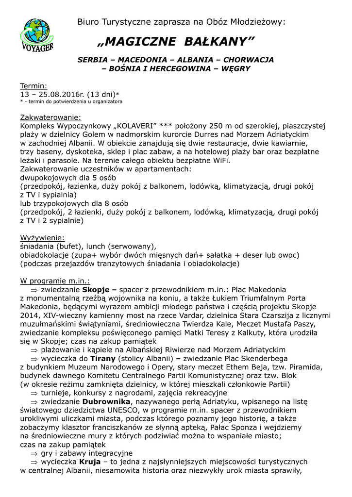 Biuro Turystyczne zaprasza na Obóz Młodzieżowy: „MAGICZNE BAŁKANY” SERBIA – MACEDONIA – ALBANIA – CHORWACJA – BOŚNIA I HERCEGOWINA – WĘGRY Termin: 13 – 25.08.2016r. (13 dni)* * - termin do potwierdzenia u organizatora Zakwaterowanie: Kompleks Wypoczynkowy „KOLAVERI” *** położony 250 m od szerokiej, piaszczystej plaży w dzielnicy Golem w nadmorskim kurorcie Durres nad Morzem Adriatyckim w zachodniej Albanii. W obiekcie zanajdują się dwie restauracje, dwie kawiarnie, trzy baseny, dyskoteka, sklep i plac zabaw, a na hotelowej plaży bar oraz bezpłatne leżaki i parasole. Na terenie całego obiektu bezpłatne WiFi. Zakwaterowanie uczestników w apartamentach: dwupokojowych dla 5 osób (przedpokój, łazienka, duży pokój z balkonem, lodówką, klimatyzacją, drugi pokój z TV i sypialnia) lub trzypokojowych dla 8 osób (przedpokój, 2 łazienki, duży pokój z balkonem, lodówką, klimatyzacją, drugi pokój z TV i 2 sypialnie) Wyżywienie: śniadania (bufet), lunch (serwowany), obiadokolacje (zupa+ wybór dwóch mięsnych dań+ sałatka + deser lub owoc) (podczas przejazdów tranzytowych śniadania i obiadokolacje) W programie m.in.: ⇒ zwiedzanie Skopje – spacer z przewodnikiem m.in.: Plac Makedonia z monumentalną rzeźbą wojownika na koniu, a także Łukiem Triumfalnym Porta Makedonia, będącymi wyrazem ambicji młodego państwa i częścią projektu Skopje 2014, XIV-wieczny kamienny most na rzece Vardar, dzielnica Stara Czarszija z licznymi muzułmańskimi świątyniami, średniowieczna Twierdza Kale, Meczet Mustafa Paszy, zwiedzanie kompleksu poświęconego pamięci Matki Teresy z Kalkuty, która urodziła się w Skopje; czas na zakup pamiątek ⇒ plażowanie i kąpiele na Albańskiej Riwierze nad Morzem Adriatyckim ⇒ wycieczka do Tirany (stolicy Albanii) – zwiedzanie Plac Skenderbega z budynkiem Muzeum Narodowego i Opery, stary meczet Ethem Beja, tzw. Piramida, budynek dawnego Komitetu Centralnego Partii Komunistycznej oraz tzw. Blok (w okresie reżimu zamknięta dzielnicy, w której mieszkali członkowie Partii) ⇒ turnieje, konkursy z nagrodami, zajęcia rekreacyjne ⇒ zwiedzanie Dubrownika, nazywanego perłą Adriatyku, wpisanego na listę światowego dziedzictwa UNESCO, w programie m.in. spacer z przewodnikiem urokliwymi uliczkami miasta, podczas którego poznamy jego historię, a także zobaczymy klasztor franciszkanów ze słynną apteką, Pałac Sponza i wejdziemy na średniowieczne mury z których podziwiać można to wspaniałe miasto; czas na zakup pamiątek ⇒ gry i zabawy integracyjne ⇒ wycieczka Kruja – to jedna z najsłynniejszych miejscowości turystycznych w centralnej Albanii, niesamowita historia oraz niezwykły urok miasta sprawiły, że jest ono potocznie nazywane "albańskim Krakowem" ⇒ dyskoteki ⇒ wycieczka do Mostaru – zwiedzanie wizytówki miasta – XVIw. kamiennego mostu oraz Starówki pełnej tradycyjnych warsztatów rzemieślniczych, restauracji z lokalną kuchnią, meczetów, z których dobiegają głosy muezinów wzywających do modlitwy; czas na zakup pamiątek ⇒ zwiedzanie Sarajewa – stolicy Bośni i Hercegowiny, spacer po zabytkowym centrum miasta, gdzie mieszają się wpływy różnych kultur i religii, miedzy innymi Meczet Gazi Husrev-beja, bazar – sarajewskie sukiennice, oraz Latinski Most – miejsce zamachu na arcyksięcia Ferdynanda; czas na zakup pamiątek ⇒ całodniowy pobyt w Aquaparku w Hajduszoboszlo – 15 różnych zjeżdżalni: Cztery tory”, „Kamikaze”, „Zjeżdżalnia wodna”, „Czarna dziura”, „Szalona rzeka”, „Wielka zjeżdżalnia”, „Wielka dziura”, „Tornado”, „Niagara”, „Big hole” a także wieża startowa o wysokości 16 metrów z której wychodzą zjeżdżalnie, tunel grawitacyjny, pętle wodne, superfale, tsunami, łódź kosmiczna i rura wodna, ponadto 10 basenów, plaża, ściana wspinaczkowa Koszt: 2290,00 zł/os. (przy zgłoszeniu i wpłacie zaliczki do 10 marca) 2490,00 zł/os. (po 10 marca) UWAGA: Cena zawiera: transport, noclegi, wyżywienie, wszystkie bilety wstępu, opiekę wychowawczą, ubezpieczenie, opłaty za przewodników, opłaty autostradowe, drogowe i parkingowe, taksy klimatyczne i miejscowe podatki Uczestnik nie ponosi żadnych dodatkowych kosztów! Informacje dodatkowe: 1. BT „VOYAGER” zobowiązuje się do zabezpieczenia wszystkich świadczeń ujętych w przedstawionym programie wyjazdu. 2. Cena skierowania zawiera bilety wstępu do zwiedzanych obiektów ujętych w programie. 3. Organizator dysponuje własnymi środkami finansowymi, które zabezpieczają nieplanowane wydatki wynikłe z nieprzewidzianych zdarzeń podczas realizacji imprezy. 4. Biuro ubezpiecza uczestników wyjazdu od następstw nieszczęśliwych wypadków (NNW) na kwotę 2000,00 euro i kosztów leczenia (KL) zagranicą na kwotę 10000,00 euro oraz bagaż podróżny na kwotę 200,00 euro w TUiR AXA S.A. 5. Organizator zobowiązuje się do uzyskania wpisu do ewidencji kuratoryjnych placówek wypoczynku, na 14 dni przed rozpoczęciem wypoczynku. 6. Na placówce opiekę sprawować będzie wykwalifikowana kadra pedagogiczna (1 opiekun na 15 uczestników) oraz kierownik. 7. Organizator zapewnia transport autokarem klasy turystycznej wyposażonym w klimatyzację, regulowane fotele oraz DVD. 8. Rezerwacja miejsca następuje po podpisaniu umowy i wpłacie zaliczki w wys. 550,00 zł/os. Ilość miejsc ograniczona, decyduje kolejność zgłoszeń. 9. Wychodząc naprzeciw oczekiwaniom Rodziców proponujemy rozłożenie odpłatności na raty. Jednocześnie informujemy, że wystawiamy wnioski o dofinansowanie do zakładów pracy oraz faktury vat. 10. Biuro zastrzega sobie prawo do odwołania wyjazdu z powodu zbyt małej ilości uczestników. Zgłoszenia: Biuro Turystyczne „VOYAGER”, ul. Kosynierów Kościuszkowskich 11, 87-100 Toruń tel. 56 645 50 40 ; tel. kom.: 0603 628 785; fax 56 621 97 91, www.voyagertorun.pl; e-mail: [email protected]; facebook.com/