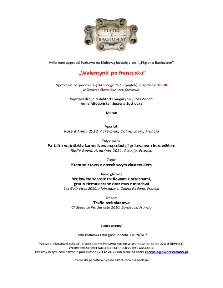 Miło nam zaprosić Państwa na klubową kolację z serii „Piątek z Bachusem” „Walentynki po francusku” Spotkanie rozpocznie się 14 lutego 2013 (piątek), o godzinie 18.00 w Dworze Sieraków koło Krakowa. Poprowadzą je redaktorki magazynu „Czas Wina”: Anna Miodońska i Justyna Suchocka Menu: Aperitif: Rosé d'Anjou 2012, Ackerman, Dolina Loary, Francja Przystawka: Parfait z wątróbki z karmelizowaną cebulą i grilowanym borowikiem Rieflé Gewürztraminer 2011, Alzacja, Francja Zupa: Krem selerowy z orzechowym ciasteczkiem Danie główne: Wołowina w sosie truflowym z orzechami, gratin ziemniaczane oraz mus z marchwi Les Gélinottes 2010, Alain Jaume, Dolina Rodanu, Francja Deser: Trufle czekoladowe Château Le Pin Sacriste 2010, Bordeaux, Francja Zapraszamy! Cena klubowa i dla gości hotelu 110 zł/os.* Podczas „Piątków Bachusa” proponujemy Państwu nocleg w promocyjnej cenie 220 zł (dwójka). Wcześniejsza rezerwacja stolika i noclegu jest wskazana. Prosimy w tym celu dzwonić pod numer 12 312 24 23 lub pisać na adres [email protected] *cena dla pozostałych gości: 149 zł, cena bez noclegu