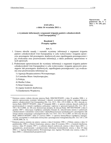 ©Kancelaria Sejmu s. 1/20 Opracowano na podstawie: Dz. U. z 2011 r. Nr 230, poz. 1371. USTAWA z dnia 16 września 2011 r. o wymianie informacji z organami ścigania państw członkowskich Unii Europejskiej1), 2) Rozdział 1 Przepisy ogólne Art. 1. 1. Ustawa określa zasady i warunki wymiany informacji z organami ścigania państw członkowskich Unii Europejskiej w celu wykrywania i ścigania sprawców przestępstw lub przestępstw skarbowych oraz zapobiegania przestępczości i jej zwalczania oraz przetwarzania informacji, a także podmioty uprawnione w tych sprawach. 2. Podmiotami uprawnionymi do wymiany informacji z organami ścigania państw członkowskich Unii Europejskiej w celu wykrywania i ścigania sprawców przestępstw lub przestępstw skarbowych, zapobiegania przestępczości i jej zwalczania oraz przetwarzania informacji są: 1) Agencja Bezpieczeństwa Wewnętrznego; 2) Centralne Biuro Antykorupcyjne; 3) Policja; 4) Służba Celna; 5) Straż Graniczna; 6) organy kontroli skarbowej; 7) Żandarmeria Wojskowa. 1) 2) Niniejsza ustawa wdraża decyzję ramową Rady 2006/960/WSiSW z dnia 18 grudnia 2006 r. w sprawie uproszczenia wymiany informacji i danych wywiadowczych między organami ścigania państw członkowskich Unii Europejskiej (Dz. Urz. UE L 386 z 29.12.2006, str. 89) i decyzję ramową Rady 2008/977/WSiSW z dnia 27 listopada 2008 r. w sprawie ochrony danych osobowych przetwarzanych w ramach współpracy policyjnej i sądowej w sprawach karnych (Dz. Urz. UE L 350 z 30.12.2008, str. 60) oraz dostosowuje przepisy do decyzji Rady 2007/845/WSiSW z dnia 6 grudnia 2007 r. dotyczącej współpracy pomiędzy biurami ds. odzyskiwania mienia w państwach członkowskich w dziedzinie wykrywania i identyfikacji korzyści pochodzących z przestępstwa lub innego mienia związanego z przestępstwem (Dz. Urz. UE L 332 z 18.12.2007, str.103) oraz decyzji Rady 2008/615/WSiSW z dnia 23 czerwca 2008 r. w sprawie intensyfikacji współpracy transgranicznej, szczególnie w zwalczaniu terroryzmu i przestępczości transgranicznej (Dz. Urz. UE L 210 z 06.08.2008, str. 1). Niniejszą ustawą zmienia się ustawy: ustawę z dnia 6 kwietnia 1990 r. o Policji, ustawę z dnia 12 października 1990 r. o Straży Granicznej, ustawę z dnia 28 września 1991 r. o kontroli skarbowej, ustawę z dnia 29 sierpnia 1997 r. o ochronie danych osobowych, ustawę z dnia 6 lipca 2001 r. o gromadzeniu, przetwarzaniu i przekazywaniu informacji kryminalnych, ustawę z dnia 24 maja 2002 r. o Agencji Bezpieczeństwa Wewnętrznego oraz Agencji Wywiadu oraz ustawę z dnia 13 lipca 2006 r. o dokumentach paszportowych. 2012-07-19 ©Kancelaria Sejmu s. 2/20 3. Ustawę stosuje się również do wymiany oraz przetwarzania informacji: 1) z organami ścigania państw niebędących państwami członkowskimi Unii Europejskiej, które stosują przepisy dorobku Schengen; 2) w sposób całkowicie lub częściowo zautomatyzowany, zgromadzonych w zbiorach danych referencyjnych, w szczególności obejmujących dane o wynikach analizy kwasu dezoksyrybonukleinowego (DNA), oraz w zbiorach danych daktyloskopijnych. 4. Ustawa nie narusza przepisów o pomocy prawnej w sprawach karnych oraz postanowień umów międzynarodowych dotyczących współpracy w sprawach zapobiegania przestępczości, jej zwalczania oraz współdziałania na terenach przygranicznych. Art. 2. 1. Przepisy ustawy stosuje się odpowiednio do wymiany informacji przez krajowe biuro do spraw odzyskiwania mienia, o którym mowa w decyzji Rady 2007/845/WSiSW z dnia 6 grudnia 2007 r. dotyczącej współpracy pomiędzy biurami ds. odzyskiwania mienia w państwach członkowskich w dziedzinie wykrywania i identyfikacji korzyści pochodzących z przestępstwa lub innego mienia związanego z przestępstwem (Dz. Urz. UE L 332 z 18.12.2007, str.103). 2. Podmiotami uprawnionymi do wymiany informacji za pośrednictwem krajowego biura do spraw odzyskiwania mienia są podmioty, o których mowa w art. 1 ust. 2, oraz: 1) minister właściwy do spraw finansów publicznych; 2) Generalny Inspektor Informacji Finansowej; 3) izby i urzędy skarbowe; 4) prokurator. Art. 3. Ilekroć w ustawie jest mowa o: 1) anonimizacji – rozumie się przez to przekształcenie danych osobowych w sposób uniemożliwiający przyporządkowanie poszczególnych informacji do określonej lub możliwej do zidentyfikowania osoby fizycznej albo jeżeli przyporządkowanie takie wymagałoby niewspółmiernych kosztów, czasu lub działań; 2) blokowaniu – rozumie się przez to oznaczanie informacji w celu ograniczenia ich przetwarzania; 3) informacji – rozumie się przez to informacje, w tym dane osobowe, do których pobierania, uzyskiwania, przekazywania, gromadzenia, wykorzystywania i przetwarzania, w celu realizacji swoich zadań ustawowych są uprawnione, na podstawie przepisów odrębnych, podmioty uprawnione; 4) organach ścigania państw członkowskich Unii Europejskiej – rozumie się przez to organy państw członkowskich Unii Europejskiej oraz państw niebędących państwami członkowskimi Unii Europejskiej stosujących przepisy dorobku Schengen, które są uprawnione w tych państwach do wykrywania i ścigania sprawców przestępstw lub przestępstw skarbowych oraz zapobiegania przestępczości i jej zwalczania; 5) państwie trzecim – rozumie się przez to państwo niebędące państwem członkowskim Unii Europejskiej i niestosujące przepisy dorobku Schengen; 2012-07-19 ©Kancelaria Sejmu s. 3/20 6) podmiotach uprawnionych – rozumie się przez to podmioty, o których mowa w art. 1 ust. 2 oraz art. 2 ust. 2; 7) wstawianiu odnośników – rozumie się przez to oznaczanie przechowywanych danych osobowych, w przypadkach zakwestionowania ich poprawności przez osobę, której dane te dotyczą, którego celem nie jest ograniczenie przetwarzania tych danych w przyszłości; 8) wymianie – rozumie się przez to przekazywanie, udostępnianie, uzyskiwanie lub otrzymywanie informacji przez organy ścigania pa