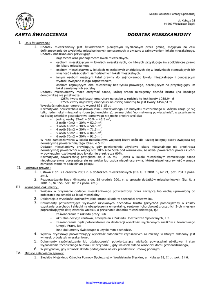Miejski Ośrodek Pomocy Społecznej ul. Kubsza 28 44-300 Wodzisław Śląski KARTA ŚWIADCZENIA DODATEK MIESZKANIOWY I. Opis świadczenia: 1. Dodatek mieszkaniowy jest świadczeniem pieniężnym wypłacanym przez gminę, mającym na celu II. III. IV. dofinansowanie do wydatków mieszkaniowych ponoszonych w związku z zajmowaniem lokalu mieszkalnego. Dodatek mieszkaniowy przysługuje: − najemcom oraz podnajemcom lokali mieszkalnych, − osobom mieszkającym w lokalach mieszkalnych, do których przysługuje im spółdzielcze prawo do lokalu mieszkalnego, − osobom mieszkającym w lokalach mieszkalnych znajdujących się w budynkach stanowiących ich własność i właścicielom samodzielnych lokali mieszkalnych, − innym osobom mającym tytuł prawny do zajmowanego lokalu mieszkalnego i ponoszącym wydatki związane z jego zajmowaniem, − osobom zajmującym lokal mieszkalny bez tytułu prawnego, oczekującym na przysługujący im lokal zamienny lub socjalny. Dodatek mieszkaniowy może otrzymać osoba, której średni miesięczny dochód brutto (na każdego domownika) nie przekracza: − 125% kwoty najniższej emerytury na osobę w rodzinie to jest kwoty 1038,94 zł − 175% kwoty najniższej emerytury na osobę samotną to jest kwoty 1454,51 zł Wysokość najniższej emerytury wynosi 831,15 zł. Normatywna powierzchnia użytkowa lokalu mieszkalnego lub budynku mieszkalnego w którym znajduje się tylko jeden lokal mieszkalny (dom jednorodzinny), zwana dalej "normatywną powierzchnią", w przeliczeniu na liczbę członków gospodarstwa domowego nie może przekroczyć dla: − jednej osoby 35m2 + 30% = 45,5 m2, − 2 osób 40m2 + 30% = 52,0 m2, − 3 osób 45m2 + 30% = 58,5 m2, − 4 osób 55m2 + 30% = 71,5 m2, − 5 osób 65m2 + 30% = 84,5 m2, − 6 osób 70m2 + 30% = 91,0 m2, W razie zamieszkiwania w lokalu mieszkalnym większej liczby osób dla każdej kolejnej osoby zwiększa się normatywną powierzchnię tego lokalu o 5 m2. Dodatek mieszkaniowy przysługuje, gdy powierzchnia użytkowa lokalu mieszkalnego nie przekracza normatywnej powierzchni o więcej niż: 30% albo 50% pod warunkiem, że udział powierzchni pokoi i kuchni w powierzchni użytkowej tego lokalu nie przekracza 60%. Normatywną powierzchnię powiększa się o 15 m2 - jeżeli w lokalu mieszkalnym zamieszkuje osoba niepełnosprawna poruszająca się na wózku lub osoba niepełnosprawna, której niepełnosprawność wymaga zamieszkiwania w oddzielnym pokoju. Podstawa prawna: 1. Ustawa z dn. 21 czerwca 2001 r. o dodatkach mieszkaniowych (Dz. U. z 2001 r., Nr 71, poz. 734 z późn. zm.), 2. Rozporządzenie Rady Ministrów z dn. 28 grudnia 2001 r. w sprawie dodatków mieszkaniowych (Dz. U. z 2001 r., Nr 156, poz. 1817 z późn. zm.). Wymagane dokumenty: 1. Wniosek o przyznanie dodatku mieszkaniowego potwierdzony przez zarządcę lub osobę uprawnioną do pobierania należności za lokal mieszkalny, 2. Deklaracja o wysokości dochodów jakie strona składa w obecności pracownika, 3. Dokumenty potwierdzające wysokość uzyskanych dochodów brutto (przychód pomniejszony o koszty uzyskania przychodu i składki na ubezpieczenia emerytalne, rentowe i chorobowe) z ostatnich 3-ch miesięcy poprzedzających datę złożenia wniosku o przyznanie dodatku mieszkaniowego, tj.: − zaświadczenie z zakładu pracy, lub − aktualna decyzja rentowa, emerytalna z Zakładu Ubezpieczeń Społecznych, lub − zaświadczenie bądź potwierdzenie na deklaracji wysokości wypłaconych zasiłków z Powiatowego Urzędu Pracy, lub − inne dokumenty świadczące o uzyskanym dochodzie. 4. Wydruk czynszowy potwierdzający wysokość składników czynszowych za miesiąc w którym składany jest wniosek o dodatek mieszkaniowy, 5. Dokumenty (zaświadczenie lub oświadczenie) potwierdzające wielkość powierzchni użytkowej i stan wyposażenia technicznego budynku w przypadku, gdy wniosek składa właściciel domu jednorodzinnego, 6. W przypadku, gdy wniosek składa podnajemca należy przedstawić umowę podnajmu. Miejsce załatwiania sprawy: 1. Siedziba Miejskiego Ośrodka Pomocy Społecznej w Wodzisławiu Śląskim, ul. Kubsza 28, II p., pok. 5 i 6. http://www.mops.wodzislaw.pl