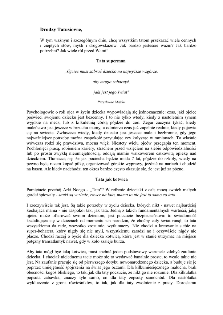 Drodzy Tatusiowie, W tym ważnym i szczególnym dniu, chcę wszystkim tatom przekazać wiele cennych i ciepłych słów, myśli i drogowskazów. Jak bardzo jesteście ważni? Jak bardzo potrzebni? Jak wiele ról przed Wami! Tata superman „Ojciec musi zabrać dziecko na najwyższe wzgórze, aby mogło zobaczyć, jaki jest jego świat" Przysłowie Majów Psychologowie o roli ojca w życiu dziecka wypowiadają się jednoznacznie: czas, jaki ojciec poświeci swojemu dziecku jest bezcenny. I to nie tylko wtedy, kiedy z nastoletnim synem wyjdzie na mecz, lub z kilkuletnią córką pójdzie do zoo. Zegar zaczyna tykać, kiedy maleństwo jest jeszcze w brzuchu mamy, a odmierza czas już zupełnie realnie, kiedy pojawia się na świecie. Zwłaszcza wtedy, kiedy dziecko jest jeszcze małe i bezbronne, gdy jego najważniejsze potrzeby można zaspokoić przytulając czy kołysząc w ramionach. To właśnie wówczas rodzi się prawdziwa, mocna więź. Niestety wielu ojców przegapia ten moment. Pochłonięci pracą, robieniem kariery, strachem przed wzięciem na siebie odpowiedzialności lub po prostu zwykłą nieumiejętnością, oddają mamie walkowerem całkowitą opiekę nad dzieckiem. Tłumaczą się, że jak pociecha będzie miała 7 lat, pójdzie do szkoły, wtedy na pewno będą razem kopać piłkę, organizować górskie wyprawy, jeździć na nartach i chodzić na basen. Ale kiedy nadchodzi ten okres bardzo często okazuje się, że jest już za późno. Tata jak kotwica Pamiętacie przebój Arki Noego - „Tato"? W refrenie dzieciaki z całą mocą swoich małych gardeł śpiewały - sanki są w zimie, rower na lato, mama to nie jest to samo co tato... . I rzeczywiście tak jest. Są takie potrzeby w życiu dziecka, których nikt - nawet najbardziej kochająca mama - nie zaspokoi tak, jak tata. Jedną z takich fundamentalnych wartości, jaką ojciec może ofiarować swoim dzieciom, jest poczucie bezpieczeństwa: to świadomość kształtująca się w dzieciach od momentu ich narodzin, że choćby cały świat runął, to tata wszystkiemu da radę, wszystko zrozumie, wytłumaczy. Nie chodzi o kreowanie siebie na super-bohatera, który nigdy się nie myli, wszystkiemu zaradzi no i oczywiście nigdy nie płacze. Chodzi raczej o bycie dla dziecka kotwicą, która jest w stanie utrzymać na miejscu potężny transatlantyk nawet, gdy w koło szaleje burza. Aby tata mógł być taką kotwicą, musi spełnić jeden podstawowy warunek: zdobyć zaufanie dziecka. I chociaż niejednemu tacie może się to wydawać banalnie proste, to wcale takie nie jest. Na zaufanie pracuje się od pierwszego dotyku nowonarodzonego dziecka, a buduje się je poprzez umiejętność spojrzenia na świat jego oczami. Dla kilkumiesięcznego malucha, brak obecności kogoś bliskiego, to tak, jak dla taty poczucie, że nikt go nie rozumie. Dla kilkulatka popsuta zabawka, znaczy tyle samo, co dla taty zepsuty samochód. Dla nastolatka wykluczenie z grona rówieśników, to tak, jak dla taty zwolnienie z pracy. Dorosłemu człowiekowi, a zwłaszcza mężczyźnie, który powinien być głową rodziny, przedsiębiorczym i zaradnym, spojrzenie na świat z takiej perspektywy jest bardzo trudne. Problemy jakie mają dzieci, dla taty wydają się błahostką. Często je lekceważy, czasami zupełnie nieświadomie, tylko dla tego - że przecież to nic ważnego, może poczekać. Kiedy kilkulatek oczekuje od taty, że naprawi jego popsutą zabawkę, a ten je zlekceważy, lub co gorsza nakrzyczy, że ją zepsuło, wówczas niech nie oczekuje, że za pięć czy dziesięć lat dziecko zwróci się do niego z prośbą o radę i pomoc w trudnej życiowej sytuacji, która będzie naprawdę poważna. Jeśli tata obiecuje dziecku, że razem pójdą do kina, a później bez uprzedzenia i podania powodu odwołuje wyjście, nie może oczekiwać, że kiedy jego dziecko będzie nastolatkiem/ką, dotrzyma obietnicy, że na swojej pierwszej imprezie nie da się namówić na spróbowanie środków odurzających. Kiedy tata łamie obietnice, te małe w jego oczach, ale wielkie w oczach dziecka, musi się liczyć z tym, że kiedy przyjdzie pora na te obietnice naprawdę wielkie, one również będą łamane. Budowania zaufania nie można odkładać na „potem", bo może się okazać, że to "potem" już nie istnieje. Życie to pyszne ciastko Tata wywiera ogromny wpływ na rozwój swojego dziecka. To stwierdzenie jest oczywiste dla wszystkich mężczyzn. Często zapominają jednak, że wpływ ten trwa ciągle, a nie tylko wówczas, kiedy „wychowują" swoje dziecko. Tata powinien mieć świadomość, że jego pociecha obserwuje go cały czas: kiedy rano wychodzi do pracy i zapomina o pożegnalnym buziaku, gdy wraca do domu i zatapia się w telewizor, kiedy opowiada koledze - jak to miał kiepski dzień. Dziecko przejmuje zachowania swojego taty, jest przecież dla niego autorytetem i wzorem. Obserwując go, jego zachowanie, sposób bycia, stosunek do świata, wyrabia w sobie i kształtuje poglądy na różne dziedziny życia społecznego i moralnego. Dlatego tak ważne, z punktu widzenia dziecka, są dwie kwestie: pozytywny stosunek taty do życia oraz do mamy. W pierwszym przypadku, zadaniem taty jest angażowanie się w rozwój malucha, nauczenie go odkrywania i doceniania piękna życia. O ile potrzeba mamy w pierwszym okresie życia dziecka jest oczywista i mama czuje to instynktownie, o tyle potrzeba taty zostaje potwierdzona dopiero wraz z rozwojem malucha (istnieje jednak już z chwilą narodzin). Zarówno zadaniem mamy, jak i taty jest uświadomienie dziecku, że jest kochane i akceptowane. Mama okazuje to w codziennej trosce, tata poprzez otwarcie dziecka na świat. Mówi się, że zadaniem taty jest oderwanie małego człowieka od spódnicy mamy. To tata ma pokazać dziecku jak należy się ze światem zmierzyć. Druga istotna kwestia, to stosunek taty do mamy dziecka. Jedną z najcenniejszych rzeczy, jaką tata może ofiarować swoim dzie
