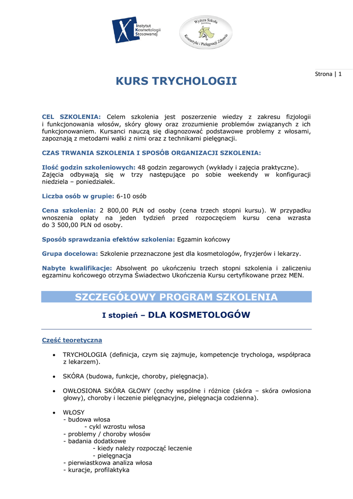 KURS TRYCHOLOGII CEL SZKOLENIA: Celem szkolenia jest poszerzenie wiedzy z zakresu fizjologii i funkcjonowania włosów, skóry głowy oraz zrozumienie problemów związanych z ich funkcjonowaniem. Kursanci nauczą się diagnozować podstawowe problemy z włosami, zapoznają z metodami walki z nimi oraz z technikami pielęgnacji. CZAS TRWANIA SZKOLENIA I SPOSÓB ORGANIZACJI SZKOLENIA: Ilość godzin szkoleniowych: 48 godzin zegarowych (wykłady i zajęcia praktyczne). Zajęcia odbywają się w trzy następujące po sobie weekendy w konfiguracji niedziela – poniedziałek. Liczba osób w grupie: 6-10 osób Cena szkolenia: 2 800,00 PLN od osoby (cena trzech stopni kursu). W przypadku wnoszenia opłaty na jeden tydzień przed rozpoczęciem kursu cena wzrasta do 3 500,00 PLN od osoby. Sposób sprawdzania efektów szkolenia: Egzamin końcowy Grupa docelowa: Szkolenie przeznaczone jest dla kosmetologów, fryzjerów i lekarzy. Nabyte kwalifikacje: Absolwent po ukończeniu trzech stopni szkolenia i zaliczeniu egzaminu końcowego otrzyma Świadectwo Ukończenia Kursu certyfikowane przez MEN. SZCZEGÓŁOWY PROGRAM SZKOLENIA I stopień – DLA KOSMETOLOGÓW Część teoretyczna TRYCHOLOGIA (definicja, czym się zajmuje, kompetencje trychologa, współpraca z lekarzem). SKÓRA (budowa, funkcje, choroby, pielęgnacja). OWŁOSIONA SKÓRA GŁOWY (cechy wspólne i różnice (skóra – skóra owłosiona głowy), choroby i leczenie pielęgnacyjne, pielęgnacja codzienna). WŁOSY - budowa włosa - cykl wzrostu włosa - problemy / choroby włosów - badania dodatkowe - kiedy należy rozpocząć leczenie - pielęgnacja - pierwiastkowa analiza włosa - kuracje, profilaktyka Strona | 1 Część praktyczna (warsztaty) ZAJĘCIA PRAKTYCZNE - mikrokamera – obsługa - wprowadzenie do badania przedmiotowego i diagnozowania - kuracje zabiegowe - techniki masażu - zalecenia zabiegowe do domu II stopień – DLA KOSMETOLOGÓW; FRYZJERÓW Część teoretyczna CHECK UP OWŁOSIONEJ SKÓRY GŁOWY I WŁOSÓW - karta badania - wywiad z ostatnich 4 miesięcy - wywiad rodzinny, predyspozycje genetyczne - badanie pacjenta NAJCZĘSTSZE PRZYCZYNY ŁYSIENIA - łysienie androgenowe kobiet - łysienie androgenowe mężczyzn - łysienie plackowate FARMAKOLOGIA I CHEMIA KOSMETYKÓW - farmakologia i stosowane receptury - chemia kosmetyków, odżywek - preparaty do trwałej - farby, lakiery do włosów MASAŻ Część praktyczna ZAAWANSOWANE TECHNIKI ZABIEGOWE - we współpracy z dermatologiem, endokrynologiem, ginekologiem, pediatrą, dietetykiem, psychologiem ZASADY WŁAŚCIWEJ PIELĘGNACJI - wcierki - rozbudowane techniki masażu ZABIEGI LECZNICZE – wprowadzenie, podstawy prawne - mezoterapia o efektywne techniki zabiegowe - aparatura i sprzęt - wybrane przypadki kliniczne - zastawanie terapii LED - kosmetologia o preparaty pielęgnacyjne (gama produktów) Strona | 2 Strona | 3 III stopień - DLA KOSMETOLOGÓW; FRYZJERÓW; LEKARZY pod auspicjami POLSKIEGO TOWARZYSTWA MEZOTERAPII I LED Academy POLOGNE, z zamieszczeniem adresu gabinetu na portalu PTMezo – gabinety rekomendowane. Część teoretyczna CHECK UP OWŁOSIONEJ SKÓRY GŁOWY I WŁOSÓW - elektroniczna karta badania ROLA STRESU W ŁYSIENIU - najnowsze doniesienia o metody zaradcze CHOROBY OWŁOSIONEJ SKÓRY GŁOWY skóra łojotokowa, - skóra sucha - łojotokowe zapalenie skóry ciemieniucha, - łupież, - łuszczyca, - łysienie plackowate, - łysienie łojotokowe, - łysienie androgenowe TERAPIA LED - wprowadzenie do leczenia światłem - zastosowanie praktyczne MEZOTERAPIA - podstawy mezoterapii, - obowiązujące prawo medyczne, wytyczne prawne - różnice mezoterapii igłowej i tzw. „bezigłowej” - wybrane techniki mezoterapii dla owłosionej skóry głowy Część praktyczna ZAAWANSOWANE TECHNIKI ZABIEGOWE - omawianie przypadku o praktyczne wprowadzanie technik zabiegowych Osoby zainteresowane uczestnictwem w szkoleniu proszone są o kontakt pod numerem telefonu +48 728 577 885 lub adresem e-mail:[email protected] SERDECZNIE ZAPRASZAMY