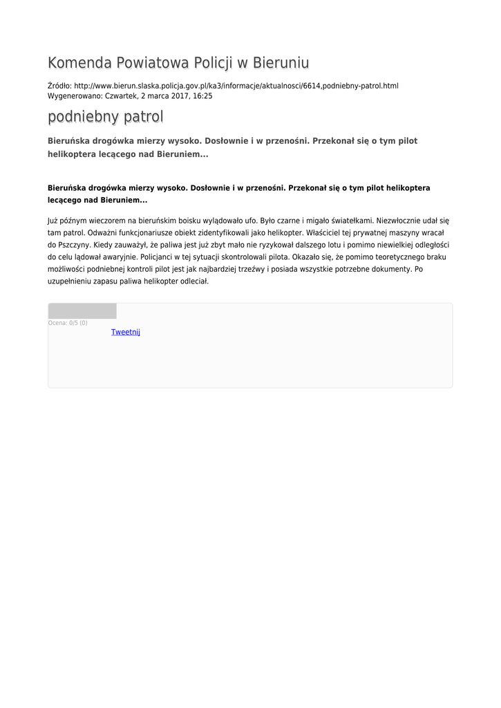 Komenda Powiatowa Policji w Bieruniu Źródło: http://www.bierun.slaska.policja.gov.pl/ka3/informacje/aktualnosci/6614,podniebny-patrol.html Wygenerowano: Czwartek, 2 marca 2017, 16:25 podniebny patrol Bieruńska drogówka mierzy wysoko. Dosłownie i w przenośni. Przekonał się o tym pilot helikoptera lecącego nad Bieruniem... Bieruńska drogówka mierzy wysoko. Dosłownie i w przenośni. Przekonał się o tym pilot helikoptera lecącego nad Bieruniem... Już późnym wieczorem na bieruńskim boisku wylądowało ufo. Było czarne i migało światełkami. Niezwłocznie udał się tam patrol. Odważni funkcjonariusze obiekt zidentyfikowali jako helikopter. Właściciel tej prywatnej maszyny wracał do Pszczyny. Kiedy zauważył, że paliwa jest już zbyt mało nie ryzykował dalszego lotu i pomimo niewielkiej odległości do celu lądował awaryjnie. Policjanci w tej sytuacji skontrolowali pilota. Okazało się, że pomimo teoretycznego braku możliwości podniebnej kontroli pilot jest jak najbardziej trzeźwy i posiada wszystkie potrzebne dokumenty. Po uzupełnieniu zapasu paliwa helikopter odleciał. Ocena: 0/5 (0) Tweetnij