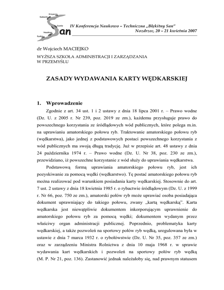 Krzywcza Dubiecko Dynów Nozdrzec IV Konferencja Naukowo – Techniczna „Błękitny San” Nozdrzec, 20 – 21 kwietnia 2007 Dydnia dr Wojciech MACIEJKO WYśSZA SZKOŁA ADMINISTRACJI I ZARZĄDZANIA W PRZEMYŚLU ZASADY WYDAWANIA KARTY WĘDKARSKIEJ 1. Wprowadzenie Zgodnie z art. 34 ust. 1 i 2 ustawy z dnia 18 lipca 2001 r. – Prawo wodne (Dz. U. z 2005 r. Nr 239, poz. 2019 ze zm.), kaŜdemu przysługuje prawo do powszechnego korzystania ze śródlądowych wód publicznych, które polega m.in. na uprawianiu amatorskiego połowu ryb. Traktowanie amatorskiego połowu ryb (wędkarstwa), jako jednej z podstawowych postaci powszechnego korzystania z wód publicznych ma swoją długą tradycję. JuŜ w przepisie art. 48 ustawy z dnia 24 października 1974 r. – Prawo wodne (Dz. U. Nr 38, poz. 230 ze zm.), przewidziano, iŜ powszechne korzystanie z wód słuŜy do uprawiania wędkarstwa. Podstawową formą uprawiania amatorskiego połowu ryb, jest ich pozyskiwanie za pomocą wędki (wędkarstwo). Tę postać amatorskiego połowu ryb moŜna realizować pod warunkiem posiadania karty wędkarskiej. Stosownie do art. 7 ust. 2 ustawy z dnia 18 kwietnia 1985 r. o rybactwie śródlądowym (Dz. U. z 1999 r. Nr 66, poz. 750 ze zm.), amatorski połów ryb moŜe uprawiać osoba posiadająca dokument uprawniający do takiego połowu, zwany „kartą wędkarską”. Karta wędkarska jest niewątpliwie dokumentem inkorporującym uprawnienie do amatorskiego połowu ryb za pomocą wędki; dokumentem wydanym przez właściwy organ administracji publicznej. Poprzednio, problematyka karty wędkarskiej, a takŜe pozwoleń na sportowy połów ryb wędką, uregulowana była w ustawie z dnia 7 marca 1932 r. o rybołówstwie (Dz. U. Nr 35, poz. 357 ze zm.) oraz w zarządzeniu Ministra Rolnictwa z dnia 10 maja 1968 r. w sprawie wydawania kart wędkarskich i pozwoleń na sportowy połów ryb wędką (M. P. Nr 21, poz. 136). Zastanowić jednak naleŜałoby się, nad prawnym statusem Wojciech Maciejko czynności wydania karty wędkarskiej. W szczególności zaś określić naleŜałoby, jakiego rodzaju aktem administracyjnym jest karta wędkarska i w jaki sposób właściwy organ moŜe ograniczać za jego pomocą dostęp do amatorskiego połowu ryb oraz pozbawiać prawa do tej postaci powszechnego korzystania z wody. 2. Czynność wydania karty wędkarskiej Karta wędkarska jest dokumentem urzędowym uprawniającym do amatorskiego połowu ryb (art. 7 ust. 2 ustawy o rybactwie śródlądowym). Czynnością warunkującą nabycie prawa do amatorskiego połowu ryb jest wydanie karty wędkarskiej przez właściwy organ administracji publicznej. Jak postanowiono w art. 7 ust. 5 ustawy o rybactwie śródlądowym, kartę wędkarską wydaje starosta. Inkorporowane w dokumencie karty wędkarskiej prawo do połowu ryb za pomocą wędki doznaje aktualizacji z chwilą „wydania” takiej karty przez właściwego starostę. Wydanie karty wędkarskiej nie jest decyzją administracyjną, podobnie jak decyzją nie jest sama karta wędkarska. Wydanie karty wędkarskiej jest materialno-techniczną czynnością polegającą na wystawieniu dokumentu karty wędkarskiej. Wystawienie dokumentu osobie zainteresowanej następuje w chwili nadania blankietowi karty wędkarskiej wszystkich wymaganych prawem elementów, oraz przeniesienia faktycznego władztwa nad tym dokumentem osobie pragnącej korzystać z wód poprzez uprawianie amatorskiego połowu ryb. Blankiet karty wędkarskiej, nazwany przez prawodawcę „wzorem karty wędkarskiej”, określony został w art. 21 pkt 4 ustawy o rybactwie śródlądowym w związku z § 1 pkt 3 rozporządzenia Ministra Rolnictwa i Rozwoju Wsi z dnia 12 listopada 2001 r. w sprawie połowu ryb oraz warunków chowu i połowu innych organizmów Ŝyjących w wodzie (Dz. U. Nr 138, poz. 1559 ze zm.; dalej: rozporządzenie w sprawie połowu ryb). Dokument ten składa się z czterech stron. Na pierwszej stronie zamieszczono oznaczenie rodzaju dokumentu („KARTA WĘDKARSKA”), oraz jego numer. Strona druga obejmuje imię i nazwisko osoby uprawnionej do amatorskiego połowu ryb, datę i miejsce jej urodzenia, miejsce zamieszkania i adres, a takŜe fotografię oraz podpis posiadacza dokumentu. Na tej samej stronie znajduje się oznaczenie organu, który dokonał wydania karty wędkarskiej, data wydania karty, podpis osoby wydającej kartę, odcisk pieczęci osoby wydającej kartę i odcisk okrągłej pieczęci organu. Ostatnia, czwarta strona 160 Zasady wydawania karty wędkarskiej blankietu karty wędkarskiej, zawiera 2-punktowe pouczenie o treści art. 7 ust. 2 ustawy o rybactwie śródlądowym. W pouczeniu tym zawarto informacje o tym, Ŝe karta wędkarska jest dokumentem uprawniającym do amatorskiego połowu ryb za pomocą wędki, oraz Ŝe w przypadku, gdy połów odbywa się w wodach uprawnionego do rybactwa, obok karty wędkarskiej osoba wędkująca obowiązana jest uzyskać zezwolenie takiego podmiotu. Nagłówek załącznika nr 1 do rozporządzenia w sprawie połowu ryb, nakłada na organ wydający kartę wędkarską obowiązek posługiwania się blankietem o formacie jednej strony A7. Podczas ustalania charakteru czynności wydania karty wędkarskiej, doniosłego znaczenia nabierają trzy unormowania, zawarte w: 1) art. 7 ust. 2 ustawy o rybactwie śródlądowym; 2) art. 7 ust. 5 tejŜe ustawy, oraz 3) § 2 ust. 1 i załączniku nr 1 do rozporządzenia w sprawie połowu ryb. Pierwszy z wymienionych przepisów stwierdza, Ŝe karta wędkarska jest „dokumentem”, którego posiadanie uprawnia do uprawiania amatorskiego połowu ryb. Drugi natomiast nakazuje właściwemu staroście „wydawanie” kart wędkarskich. Przepisy te wskazują na związanie skutku prawnego w postaci powstania tytułu do oznaczonego sposobu powszechnego korzystania z wody z technicznymi aspektami posługiwania się kartą wędkarską. Osoba uprawiająca amatorski połów ryb nie będzie tego czyniła legalnie, jeŜeli ograniczy się 