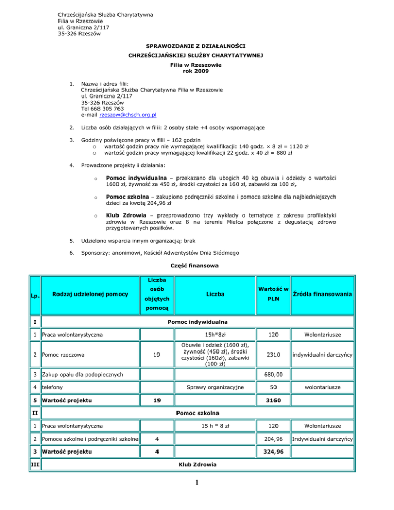 Chrześcijańska Służba Charytatywna Filia w Rzeszowie ul. Graniczna 2/117 35-326 Rzeszów SPRAWOZDANIE Z DZIAŁALNOŚCI CHRZEŚCIJAŃSKIEJ SŁUŻBY CHARYTATYWNEJ Filia w Rzeszowie rok 2009 1. Nazwa i adres filii: Chrześcijańska Służba Charytatywna Filia w Rzeszowie ul. Graniczna 2/117 35-326 Rzeszów Tel 668 305 763 e-mail [email protected] 2. Liczba osób działających w filii: 2 osoby stałe +4 osoby wspomagające 3. Godziny poświęcone pracy w filii – 162 godzin o wartość godzin pracy nie wymagającej kwalifikacji: 140 godz. × 8 zł = 1120 zł o wartość godzin pracy wymagającej kwalifikacji 22 godz. x 40 zł = 880 zł 4. Prowadzone projekty i działania: o Pomoc indywidualna – przekazano dla ubogich 40 kg obuwia i odzieży o wartości 1600 zł, żywność za 450 zł, środki czystości za 160 zł, zabawki za 100 zł, o Pomoc szkolna – zakupiono podręczniki szkolne i pomoce szkolne dla najbiedniejszych dzieci za kwotę 204,96 zł o Klub Zdrowia – przeprowadzono trzy wykłady o tematyce z zakresu profilaktyki zdrowia w Rzeszowie oraz 8 na terenie Mielca połączone z degustacją zdrowo przygotowanych posiłków. 5. Udzielono wsparcia innym organizacją: brak 6. Sponsorzy: anonimowi, Kościół Adwentystów Dnia Siódmego Część finansowa Liczba Lp. Rodzaj udzielonej pomocy osób Liczba objętych Wartość w PLN Źródła finansowania pomocą I Pomoc indywidualna 1 Praca wolontarystyczna 2 Pomoc rzeczowa 19 15h*8zł 120 Wolontariusze Obuwie i odzież (1600 zł), żywność (450 zł), środki czystości (160zł), zabawki (100 zł) 2310 indywidualni darczyńcy 3 Zakup opału dla podopiecznych 680,00 4 telefony 5 Wartość projektu Sprawy organizacyjne 19 II 50 3160 Pomoc szkolna 1 Praca wolontarystyczna 15 h * 8 zł 120 Wolontariusze Indywidualni darczyńcy 2 Pomoce szkolne i podręczniki szkolne 4 204,96 3 Wartość projektu 4 324,96 III wolontariusze Klub Zdrowia 1 20 zł * 2 h * 11 spotkań 440 Diecezja Południowa Kościoła Adwentystów DS., Kościół Adwentystów DS. w Rzeszowie (2h * 40 zł + 10h * 8 zł) * 11 spotkań 1760 wolontariusze 50 zł * 11 spotkań 550 wolontariusze Zakup ciśniomierza i glukometru 165,86 Filia ChSCh Zakup aparatu do pomiaru tkanki tłuszczowej 306,00 Filia ChSCh 1 Wynajem sali 2 Praca wolontariuszy 3 Żywność na degustacje 2 3 Wartość projektu V CAŁKOWITA WARTOŚĆ PROJEKTÓW 35 3221,86 58 3956,82 Filia Chrześcijańskiej Służby Charytatywnej w Rzeszowie udzieliła pomocy dla 58 osobom o łącznej wartości 6706,82 zł. Sporządziła Kierownik filii ChSCh w Rzeszowie Jolanta Wąsik 2