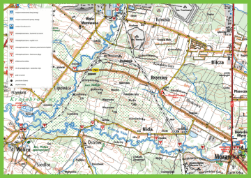 Przewodnik kajakarza Czarna Nida i Bobrza Przewodnik kajakarza Czarna Nida i Bobrza Przewodnik kajakarza Czarna Nida i Bobrza Morawica – Wolica Odcinek liczy ok. 14 km, czas spływu ok. 5 godz. Trasa dość łatwa, chociaż miejscami znajdują się brody przez rzekę i wówczas kajaki trzeba spławić, czyli wysiąść i trzymając kajak na lince przeciągnąć po wodzie bez obciążenia, gdy stan wody jest niski. Trasa bardzo kręta, nie pozwala na bezczynne płynięcie z prądem. Mogą występować nisko nad wodą konary drzew. Za mostem kolejowym, za miejscowością Ostrów prosimy skręcić w lewo na rozwidleniu rzeki, bo w prawo trafimy na kamienistą tamę i węższy odcinek trasy. W Wolicy przed młynem wodnym jest tama i tutaj kończy się omawiany odcinek. Opis trasy Czarna Nida na odcinku: Morawica do Wolicy Kilometraż/opis: 8 km – w odległości ok. 100 metrów od siebie znajdują się dwa mosty na drodze krajowej nr 73 Kielce – Tarnów – płyniemy prawą lub lewą odnogą w zależności od tego, gdzie kierowana jest woda przez zastawkę 8,8 km – łączą się obydwie odnogi rzeki 10,6 km - rzeka skręca od drogi i kieruje się w stronę lasu. Mijamy zakłady – Kopalnia Wapienia „Morawica” w Morawicy. Dalej mamy bród z przemiałem. Przy niskiej wodzie konieczność przeciągania kajaków. 11,3 km – zaleca się przepłynięcie wąskim przesmykiem między wyspami. Możliwość przepłynięcia również z prawej strony ale wymaga to manewrowania między dużymi kamieniami Po prawej stronie wysoki, piaszczysty brzeg. Po ok. 10 min. płytki, kamienisty bród za zakrętem i konary drzew w nurcie, płyniemy ostrożnie środkiem. 11,9 km – z lewej dopływ czystej strugi z pobliskiego zbiornika wody. 11,98 km – przepływamy pod kładką dla pieszych i rowerów. 11,99 km – przepływamy bród dla pojazdów. W rzece przemiały. Przy niskich stanach wody uwaga na wystające kamienie. 12 km – przepływamy pod mostem kolejowym Kielce – Busko Zdrój. Przy niskich stanach wody uwaga na wystające kamienie. Malowniczy odcinek rzeki, która płynie wśród krzewów i łąk. 13,6 km – po prawej stronie w oddali widać zabudowania miejscowości Nida. 13,9 km – 100 m za linią energetyczną płytki bród, zabudowania po prawej stronie w odległości ok. 200 m. 14 km – zabudowania Chudwi i pastwisko po prawej stronie. Przepływamy kamieniste ok. 10 – metrowe bystrze (spore kamienie). Rzeka ostro zakręca na południe. Ze względów bezpieczeństwa zaleca się przeniesienie kajaka. Przewodnik kajakarza Czarna Nida i Bobrza 14,7 km – przepływamy pod metalową kładką dla pieszych i rowerów – odcinek szlaku rowerowego Chałupki Zbrzańskie – Nida (pętla rowerowa wokół gminy Morawica). 15,5 km – po lewej stronie mijamy zabudowania wsi Golęciny. Na rzece przemiał i bród, dalej małe, kamieniste bystrze, potem przemiał. Płyniemy pod prowizoryczną kładką dla pieszych. 16 km – pokonujemy kolejny bród – płyniemy lewą stroną. 17,3 km – zbliżamy się po prawej stronie do drogi Nida – Ostrów. 17,5 km – przed nami zabudowania wsi Ostrów. W miejscowości jest zlokalizowany „Ptasi Azyl“. 18 km – przepływamy lewą stroną pod mostem na drodze lokalnej Nida – Wolica. 18,5 km – po lewej stronie rzeki zabudowania miejscowości Ostrów. Malowniczy odcinek rzeki silnie meandrującej. Niewielkie bystrza i przemiały. Widać działalność bobrów. Przed mostem kolejowym bród, łączka po lewej. 21 km – most kolejowy. Pod mostem rozlewisko. Uwaga na drewniane pale w wodzie! 21,1 km – mijamy wał – zaporę z kamieni, która kieruje wodę w lewo pod młyn w Wolicy. Prawa odnoga – kanał ulgi jest przez to płytki i zarośnięty. Na starych mapach jako główny nurt! 22,1 km – młyn w Wolicy z elektrownią wodną, przenoska.