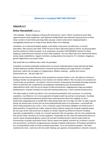 Weterani o Fundacji NIKT NIE ZOSTAJE Załącznik nr 2 Artur Karasiński weteran Pani Jadwigo - bardzo dziękuję za Waszą dla mnie pomoc, bycie z Wami na plenerze przez Was organizowanym było wyjątkowe. Jeśli będziecie kiedykolwiek potrzebowali mojej pomocy to Wam służę i przykro mi jest kiedy powstają takie sytuacje. Jestem weteranem i będę pamiętał o wyciągniętej waszej ręce w moją stronę. Bardzo Wam za to dziękuję. Uważałem, że w tej kwestii będzie spokój, a jak widzę i tutaj ostrzy się włócznię, co nie jest potrzebne. Oby wszyscy tyle robili. PTSD nie jest mi obce stąd wiem jakie to ważne. Są sytuacje gdzie kwestie polityczne należy zostawić i ja je zostawiam, bo jestem WETERANEM i bardzo Fundacji dziękuję a dziennikarzom stawiam za wzór takie działanie. Też coś zróbcie dla armii weteranów którzy wtedy, kiedy siedzieliście z nogami na fotelu i przełączaliście inny kanał w TV z drinkiem, biegali po górach Afganistanu czy pustyni Iraku. Zbyt wiele dla nas zrobiliście aby o Was nie pamiętać. Uważałem że kwestie podziałów politycznych czy innych niedoskonałości naszej demokracji będą omijały delikatny problem Weteranów a kwestia sporów politycznych tego obszaru nie będzie dotyczyła i żadne siły nie będą w to angażowane. Miałem nadzieję…..jednak jest inaczej. Zastanawiam się - jaki jest tego cel ? Dobrze że jest Centrum Weterana, które przypomina czasami światu o nas. Jak widzę na stronie to działają i bardzo się starają byśmy w tym świecie nie zniknęli całkiem. Nie ma wojny /na szczęście/ to i weteranów nie przybywa , czas płynie i historie Caracali i prywatyzacji Chmielnej okrywają wszystko. Wiem że jeśli ktoś wie o popełnieniu przestępstwa zobowiązany jest do powiadomienia odpowiednich służb. Jeśli tak się nie dzieje to takie pomówienia i obgadywania stają się zwykłym plotkowaniem. Kwestia Fundacji nie może być kwestią polityczną, a niech zostanie kwestią serca. Tak sobie myślę że trzeba się zebrać i coś w tej kwestii powiedzieć choć przyznam, że wcześniej uważałem, iż ja Weteran i inni moi przyjaciele nie będą musieli się nad tym zatrzymywać. A jednak, jednak jest niepokój powodowany politycznymi zawirowaniami które bez względu na sens i okoliczności pogrążają tych co podali Nam rękę wtedy kiedy nikt inny tego nie robił. Tę rękę czuję do dzisiaj, do dzisiaj wiem że ktoś sam do mnie podszedł kiedy było mi to potrzebne. I przyszedł taki dzień, kiedy pojawiłem się u nich i z nimi, w świecie często tak bardzo odległym od codzienności w jakiej jesteśmy. Przyjechali tam ludzie, weterani którzy dobrze wiedzą jak smakuje niepokój wojny, jak się czuje strach i lęk przed tym co będzie za chwilę. Pojawili się Weterani których Fundacja zaprosiła, przyjechaliśmy z myślą, że o naszych sprawach nikt nie pamięta, nikt nie chce wiedzieć jak tam jest bo może i do końca to nie jest wygodne. Przyjechało nas 20, może 30 weteranów którzy na wojnie często otrzepywali głowę z piachu po ostrzale moździerzowym, których palec bolał od trzymania go na języku spustowym broni, którzy często tam płakali, martwili się, w których rzucano tam kamieniami. na których przygotowywano wkopane ładunki wybuchowe. W fundacji spotkaliśmy się i uzmysłowiliśmy sobie że komuś jesteśmy potrzebni , że im nie jesteśmy obojętni. Tak wiele, osobiście dla mnie , weterana nikt nie zrobił. Siedząc przy ognisku rozmawialiśmy o różnych rzeczach, ale tam od polityki byliśmy bardzo daleko choć widać było że w tych kwestiach jesteśmy często inni, często spoglądamy w inne strony. Jednak kiedy podaje się tę rękę, są rzeczy które należy zostawić. Na wojnę pojechaliśmy nie pytając się nikogo czy jest to potrzebne, wierząc że dla kraju, dla Państwa, dla Rządu i Prezydenta jest to potrzebne. Potrzebne dla Nich i dla Nas. Jak tam jest ? - nie sposób opowiedzieć. Przyjeżdżali parlamentarzyści….. jednak trzymano ich z daleka od ryzyka które dla nas było codziennością. Nie wszystkim się udało tak jak mi, byli ze mną weterani którzy nie mieli tyle co ja szczęścia, znerwicowani ze swoimi tajemnicami, z poczuciem, że na tym świecie są sami, kulawi , z urazami kręgosłupa , bez oka, gdzie w każdym drzemie w większym lub mniejszym stopniu PTSD. Wiele o tym by powiedział i pokazał W.Milewicz, niestety , więc może T.Sekielski, warto popytać bo mieszkał ze mną w namiocie i o ile moje słowa mogą nie być wiarygodne, jego pewnie takie będą. Spotkałem w Fundacji ludzi którzy byli dosłownie zachwyceni tym co im dano , a dano - dużo spokoju, dużo zrozumienia , dużo tego czego wcześniej brakowało. Warto popytać, tych poszkodowanych, rannych, którym zostanie ta misja już do końca ich bycia, czym jest Nikt Nie Zostaje. Przyznam, że ja poczułem np, że idąc do teatru na spektakl… jest on dla mnie i że pani która gra na fortepianie to też gra dla mnie. To oni spowodowali, że będąc w Akademii Fotograficznej u Pawła czułem że nie jestem jemu i nikomu tam obojętny, poczułem że jestem Weteranem i to co zabrała mi wojna w postaci dobra, od nich do mnie wraca. Więc dziwię się spekulacjom i doszukiwaniom się niewłaściwej działalności Fundacji. Ja wiem, że ona jest właściwa, że ona czyni wiele, czyni to czego nikt inny do dzisiaj dla mnie Weterana nie potrafił zrobić i nie zrobił. Ustawa, dziękujemy - piękna spraw , ale kilka tysięcy Nas czeka na więcej, bo to do Nas strzelali, do Nas…. Teraz kiedy obserwuję zawirowania wokół fundacji „Nikt nie Zostaje” dzięki której zaczynam się odnajdywać, a może się już odnalazłem, nie mam spokoju, bo wiem, że Weterani na nich czekają, czekają aż ktoś się i do nich uśmiechnie pomijając wszystkie polityczne zawirowania !!!! Moi drodzy , są miejsca gdzie dla polityki miejsca nie ma, zrozumcie proszę. Bez w