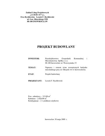 Zakład Usług Projektowych „L E R B U D ”s.c.. Ewa Rychłowska Leszek F. Rychłowski ul. Gen. Sikorskiego 23/8 88-100 INOWROCŁAW PROJEKT BUDOWLANY INWESTOR: Przedsiębiorstwo Gospodarki Komunalnej Mieszkaniowej Spółka z o.o. 88-100 Inowrocław ul. Wawrzyniaka 33 TEMAT: Naprawa i remont ścian zewnętrznych budynku mieszkalnego przy ul. Okrężek 4-6 w Inowrocławiu. ETAP: Projekt budowlany PROJEKTANT: Leszek F. Rychłowski Pow. zabudowy – 315,00 m2 Kubatura – 2.820,00 m3 Kondygnacje – 2 + poddasze użytkowe Inowrocław 30 maja 2009 r. i ZAWARTOŚĆ OPRACOWANIA 1. 2. 3. 4. Dane informacyjne. Plan sytuacyjny obiektu w skali 1 : 500. Inwentaryzacja fotograficzna. Opinia nr 60/09 Miejskiego Konserwatora Zabytków w Inowrocławiu z dnia 04.06.2009 r. 5. Opis istniejącego budynku. 6. Opis techniczny: • roboty remontowe i wzmacniające ścian zewnętrznych • docieplenie ścian zewnętrznych (od wewnątrz) • roboty zewnętrzne 7. Rysunki: Nr 1 Elewacja północna 1 : 100 Nr 1a Elementy remontu elewacji północnej 1 : 100 Nr 2 1 : 100 Elewacja południowa Nr 2 a Elementy remontu elewacji południowej 1 : 100 Nr 3 1 : 100 Elewacja wschodnia Nr 3 a Elementy remontu elewacji wschodniej 1 : 100 Nr 4 1 : 100 Elewacja zachodnia Nr 4 a Elementy remontu elewacji zachodniej 1 : 100 Nr 5 Rzut parteru i piętra 1 : 100 Nr 6 Schemat rozmieszczenia elementów drewnianych rusztu 1 : 50 8. Informacja BIOZ 9. Oświadczenie projektanta. 10. Kserokopia uprawnień budowlanych projektanta. 11. Kserokopia zaświadczenia o przynależności projektanta do Izby Inżynierów Budownictwa. 2 DANE INFORMACYJNE Zamawiający: Przedsiębiorstwo Gospodarki Komunalnej Mieszkaniowej Spółka z o.o. 88-100 Inowrocław ul. Wawrzyniaka 33 Zamówienie: Umowa z dnia 04 marca 2009 r. Podstawa opracowania: - oględziny budynku przeprowadzone w kwietniu i maju br. - ekspertyza techniczna ścian zewnętrznych opracowana przez rzeczoznawcę budowlanego mgr inż. Stefana Heise w m-cu grudniu 2008 r. - inwentaryzacja fotograficzna 3 i PLAN SYTUACYJNY 4 OPIS ISTNIEJĄCEGO BUDYNKU. Budynek mieszkalny, wolnostojący, 2 kondygnacyjny z poddaszem użytkowym, nie podpiwniczony. Budynek wykonany metodą tradycyjną CZĘŚĆ ZEWNĘTRZNA: Na wysokości cokołu – ściany murowane z cegły ceramicznej spoinowanej. Powyżej cokołu do okapu – ściany podłużne i szczytowe tzw. mur pruski. Wypełnienie szachulca stanowią ściany z cegły ceramicznej spoinowanej. Stropy międzykondygnacyjne drewniane belkowe ze ślepym pułapem. Więźba dachowa drewniana dwustolcowa z dachem czterospadowym krytym papą. Wymiary budynku: - długość – 34,45 m - szerokość – 8,60 ( 9,80) m - wysokość – 7,40 m - powierzchnia zabudowy – 315,00 m2 - kubatura – 2.820,00 m3 OPIS ISTNIEJĄCEJ KONSTRUKCJI: Budynek o podłużnym układzie ścian nośnych. Konstrukcja ścian nośnych szachulcowa z wypełnieniem cegłą ceramiczną – grub. 12 cm. Ściana cokołu z cegły ceramicznej spoinowanej – grub. 25 cm. Ściana zewnętrzna klatki schodowej z cegły ceramicznej – grub. 38 cm. Całość spoinowana. Więźba dachowa drewniana dwustolcowa. OPIS ŚCIANY ZEWNĘTRZNEJ: Szachulec ścian zewnętrznych składa się z elementów drewnianych takich jak: belki, słupy i zastrzały. Wypełnienie szkieletu stanowi cegła pełna ceramiczna grub. 12 cm. 5 Wymiar przekroju w jednej płaszczyźnie elementów ścian szachulcowych wynosi (w zależności od usytuowania w ścianie): - wymiary przy oknach – 12 cm - słupy – 17 cm - belki – 16 i 17 cm - zastrzały 17 i 17 cm - podwaliny – 16 cm Dokonana lustracja wykazała stan elementów konstrukcji nośnej (elementu drewniane) jako średni i po dokonaniu robót wzmacniających i remontowych stan elementów budynku znacznie się poprawi. Całkowita grubość ścian łącznie z tynkiem wynosi 20 cm. (patrz szczegół na rys. nr 5). Cegła – 12 cm Pustka powietrzna – 3 cm Deski – 2 cm Tynk na trzcinie – 3 cm OPIS ISTNIEJĄCEJ ARCHITEKTURY Fakturę zewnętrzną stanowi cegła ceramiczna spoinowana oraz szachulec wypełniony elementami drewnianymi w formie słupa, belki i zastrzału. Elementy drewniane malowane w kolorze czarnym – wypłowiałe. Stolarka okienna drewniana z przewagą z PCV, drzwiowa drewniana. Rynny i rury spustowe z blachy ocynkowanej. Piony kanalizacyjne instalacji wewnętrznej usytuowane są na zewnątrz. Od strony północnej wejścia do budynku stanowią schody betonowe z obudową ściankami murowanymi z cegły i częściowo otynkowane. Wokół budynku ułożona opaska betonowa. Dach drewniany czterospadowy kryty papą. 6 OPIS TECHNICZNY ROBOTY REMONTOWE I WZMACNIAJĄCE ŚCIAN ZEWNĘTRZNYCH Przed przystąpieniem do remontu ścian należy usunąć wszelkie nieszczelności pionów kanalizacji sanitarnej i zdemontować rury spustowe. Naprawić należy również nieszczelne pokrycie dachowe. A. ELEMENTY DREWNIANE 1. Elementy drewniane, które wykazują wyraźne objawy uszkodzenia należy sprawdzić pod kątem zakresu i stopnia występującego uszkodzenia. W tym celu należy usnąć z ich powierzchni zewnętrznej spróchniałą warstwę drewna aż do zdrowego materiału. Jeśli ścięcie elementu nie przekroczy 1/5 grubości można uznać, że nadaje się do naprawy. W przeciwnym razie element kwalifikuje się do wymiany: zniszczony element należy wyciąć i zastąpić nowym. 2. Wymiany lub wzmocnienia – rys. nr 1a, 2a, 3a i 4a Słupy narożne – doprowadzić słupy do pionu lub wymienić. Zastrzały – wyciąć elementy spróchniałe i zastąpić nowym drewnem – rys. nr 1a i 3a Słupy środkowe – wyciąć końcówki zniszczone i zastąpić nowym drewnem – rys. nr 1a i 2a. Belka podwalinowa – wyciąć element zniszczony i zastąpić nowym drewnem – rys 1a, 2a i 3a 3. Flekowanie powierzchni drewna – rys. nr 1a, 2a, 3a i 4a Odcinki z pęknięciem pionowym o szerokości rozwarcia ponad 3 mm naprawić przy użyciu desek, listew, względnie klocków łączonych 