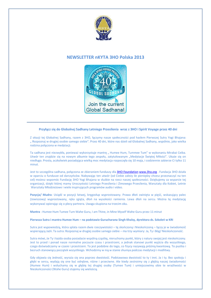 NEWSLETTER nKYTA 3HO Polska 2013 _________________________________________________________________________________ Przyłącz się do Globalnej Sadhany Letniego Przesilenia wraz z 3HO i Spirit Voyage przez 40 dni Z okazji tej Globalnej Sadhany, razem z 3HO, łączymy nasze społeczności pod hasłem Pierwszej Sutry Yogi Bhajana: „ Rozpoznaj w drugiej osobie samego siebie”. Przez 40 dni, które nas dzieli od Globalnej Sadhany, wspólnie, jako wielka rodzina połączona w medytacji. Ta sadhana jest niezwykła, ponieważ wykorzystuje mantrę „ Humee Hum, Tummee Tum” w wykonaniu Mirabai Ceiba. Utwór ten znajdzie się na nowym albumie tego zespołu, zatytułowanym „Medytacje Świętej Miłości”. Ukaże się on niedługo. Prosta, aczkolwiek posiadająca wielką moc medytacja rozpoczęła się 10 maja, i codziennie zabierze Ci tylko 11 minut. Jest to szczególna sadhana, połączona ze zbieraniem funduszy dla 3HO Foundation www.3ho.org . Fundacja 3HO działa w oparciu o fundusze od darczyńców. Nabywając ten utwór (od Ciebie zależy ile pieniędzy chcesz przeznaczyć na ten cel) możesz wspomóc Fundację 3HO Yogi Bhajana w służbie na rzecz naszej społeczności. Dziękujemy za wsparcie tej organizacji, dzięki której mamy Uroczystości Letniego Przesilenia i Zimowego Przesilenia, Warsztaty dla Kobiet, Letnie Warsztaty Młodzieżowe i wiele inspirujących programów audio i video. Pozycja/ Mudra: Usiądź w pozycji łatwej, kręgosłup wyprostowany. Prawa dłoń zwinięta w pięść, wskazujący palec (Jowiszowy) wyprostowany, ręka zgięta, dłoń na wysokości ramienia. Lewa dłoń na sercu. Można tę medytację wykonywać opierając się o plecy partnera. Uwaga skupiona na trzecim oku. Mantra : Humee Hum Tumee Tum Wahe Guru, I am Thine, in Mine Myself Wahe Guru przez 11 minut Pierwsza Sutra i mantra Humee Hum – na podstawie Gurucharana Singh Khalsy, dyrektora ds. Szkoleń w KRI Sutra jest wypowiedzią, która splata razem dwie rzeczywistości – tę skończoną i Nieskończoną – łączy je w świadomość wspierającą Jaźń. Ta sutra: Rozpoznaj w drugiej osobie samego siebie – ma trzy wymiary: Ja, Ty i Bóg/ Nieskończoność. Sutra mówi, że Ty i każda osoba posiadacie wspólną cząstkę, nieruchomy punkt, który z natury swojej jest nieskończony. Jest to przed i ponad nasze normalne poczucie czasu i przestrzeni, a jednak stanowi punkt wyjścia dla wszystkiego, czego doświadczamy w czasie i przestrzeni. To jest podobne do tego, co fizycy nazywają próżnią kwantową. To pustka i bezruch stanowiący początek wszystkiego. Wchodzimy w nią w stanie shuniya podczas medytacji i modlitwy. Gdy objawia się Jedność, wyraża się ona poprzez dwoistość. Podstawowa dwoistość to ty i inni. Ja i ty. Bez spokoju i głębi w sercu, wydają się one być odrębne, różne i przeciwne. Ale kiedy zestroimy się z głębią naszej świadomości (Humee Hum) i wsłuchamy się w głębię tej drugiej osoby (Tumee Tum) i umiejscowimy obie te wrażliwości w Nieskończoności (Wahe Guru) stajemy się wielością. Ta mantra Humee Hum Tumee Tum Wahe Guru, I am Thine, in Mine Myself Wahe Guru – ma subtelną strukturę dźwięku, rytmu i aranżacji. Wibrujemy ją z głębi serca, wsłuchujemy się w jej dźwięk i stapiamy się z nią. Rytm energetyczny tej mantry opiera się na 3, 5 cyklu. Nie chodzi tu tylko o rytm. Chodzi o energetyczny wydźwięk mantry w jej znaczeniu, energii i projekcji. Nie ma silniejszej afirmacji niż Humee Hum Tumee Tum Wahe Guru, I am Thine, in Mine Myself Wahe Guru, żeby oddać i zamanifestować subtelną głębię tej sutry. Kriya na wzmocnienie wewnętrznego światła 1. Usiądź w Pozycji Łatwej, kręgosłup wyprostowany. Dłonie oparte na kolanach w Gyan Mudrze. Ręce wyprostowane. Zamknij oczy wejdź w stan głębokiej koncentracji. Oddychaj głęboko. Ten cykl będzie trwał 8 sekund. Zrób 12 oddechów. Przy trzynastym oddechu, zrób całkowity wydech i wstrzymaj oddech. Wykonaj ruch pompowania brzuchem w spokojnym tempie. (Możesz mentalnie powtarzać Sat, kiedy wciągasz brzuch, a Nam, kiedy go rozluźniasz.) Kiedy już nie możesz utrzymać bezdechu, weź wdech i powtórz ćwiczenie. Kontynuuj przez 3 minuty. 2. Wyprostuj nogi. Utrzymuj prosty kręgosłup, prawą stopę przyciągnij do pachwiny i umieść ją na lewym udzie na wysokości biodra. Pochyl się z tali i złap obiema dłońmi za palce lewej stopy. Utrzymuj wyprostowany kręgosłup i skieruj wzrok na palce stopy. Oddychaj głęboko: zaciśnij czubek nosa tak, żeby oddech był „niuchający”. Kontynuuj przez 3 minuty. Następnie weź wdech, zatrzymaj na chwilę, wydech i odpręż się. 3. Siedź wyprostowany(a) i medytuj nad spokojnym przepływem oddechu. Przez chwilę wizualizuj swój kręgosłup od podstawy do samej góry i następnie Punkt Trzeciego Oka. Odpręż się i medytuj. Ta kriya pomaga stać się wytrwałym. Pierwsze ćwiczenie stymuluje Punkt Pępka i wspomaga trwienie. Drugie ćwiczenie energetyzuje tułów i rozciąga nerw kulszowy. Trzecie wprowadza zmiany energetyczne, co daje efekt stabilizujący i konsolidujący. W zyciu musimy zwiększać swoją mądrość i doświadczenie, żebyśmy mogli żyć normalnie ale na wyższym poziomie świadomości. Celem jogina jest efektywne życie w maksymalnym świetle, z dużą pokorą. Dlatego nauczyciel pozostaje uczniem do końca swojego życia i z wiekiem pokornieje jeszcze bardziej. Ta kriya pozwala Jaźni zatroszczyć się o wielką jaźń, po to żeby ciało fizyczne miało wystarczające pokłady energii, żeby sprostać potrzebom Jaźni. Ta kriya regularnie praktykowana pomaga zrównoważyć różnice pomiędzy wewnętrzną rzeczywistością a naszą ekspresją. Dobrym sposobem jest powtarzanie całego zestawu 3-4 razy, a następnie się głeboko odprężyć przez 5-10 minut. Medytacja na słuchanie Yogi Bhajan nauczał tej techniki w 1989 r. Praktyka ta rozwija intuicję, uspakaja „małpi umysł” i w