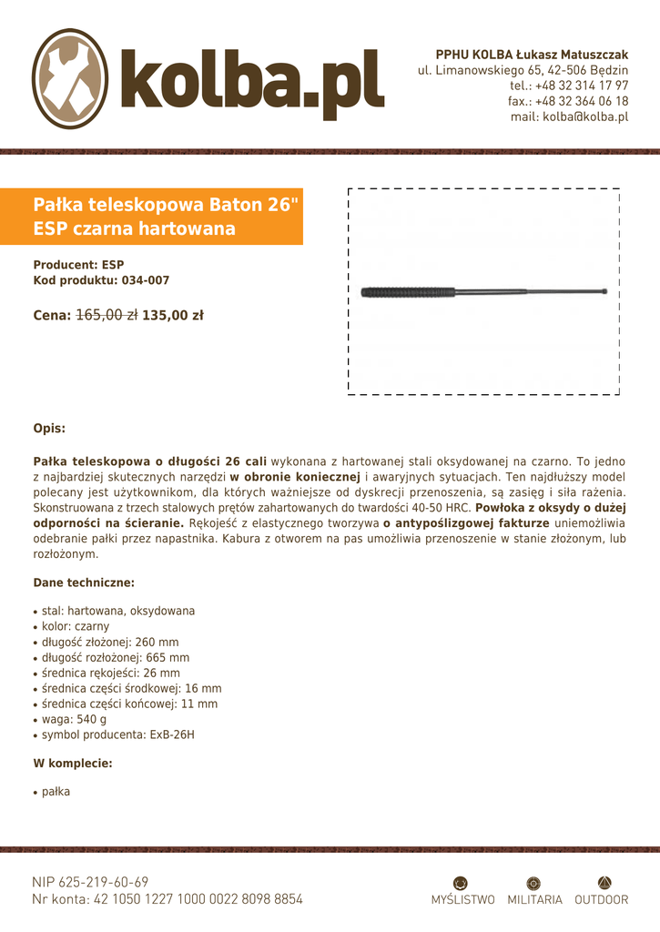 Pałka teleskopowa Baton 26" ESP czarna hartowana Producent: ESP Kod produktu: 034-007 Cena: 165,00 zł 135,00 zł Opis: Pałka teleskopowa o długości 26 cali wykonana z hartowanej stali oksydowanej na czarno. To jedno z najbardziej skutecznych narzędzi w obronie koniecznej i awaryjnych sytuacjach. Ten najdłuższy model polecany jest użytkownikom, dla których ważniejsze od dyskrecji przenoszenia, są zasięg i siła rażenia. Skonstruowana z trzech stalowych prętów zahartowanych do twardości 40-50 HRC. Powłoka z oksydy o dużej odporności na ścieranie. Rękojeść z elastycznego tworzywa o antypoślizgowej fakturze uniemożliwia odebranie pałki przez napastnika. Kabura z otworem na pas umożliwia przenoszenie w stanie złożonym, lub rozłożonym. Dane techniczne: ● ● ● ● ● ● ● ● ● stal: hartowana, oksydowana kolor: czarny długość złożonej: 260 mm długość rozłożonej: 665 mm średnica rękojeści: 26 mm średnica części środkowej: 16 mm średnica części końcowej: 11 mm waga: 540 g symbol producenta: ExB-26H W komplecie: ● pałka ● ● ● kabura pudełko instrukcja Gwarancja: 24 miesiące Porównanie wytrzymałości pałek hartowanych z niehartowanymi. ESP - EURO SECURITY PRODUCTS to czeski producent renomowanych akcesoriów do samoobrony. W jego ofercie można zaleźć najlepszej jakości: pałki teleskopowe, tonfy, paralizatory, gazy i szereg innych produktów do obrony osobistej skierowanych do służb mundurowych i cywili.