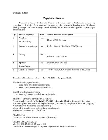 WOŚ.605.2.2016 Zapytanie ofertowe Wydział Ochrony Środowiska Starostwa Powiatowego w Wołominie zwraca się z prośbą o złożenie oferty cenowej na nagrody dla laureatów Powiatowego Konkursu Ekologicznego, dofinansowanego przez WFOŚiGW w Warszawie, zgodnie z poniższym zestawieniem: Lp. Rodzaj nagrody Ilość 1. Projektor 1 szt. Nazwa modelu/ wymagania BenQ W750 3D Ready multimedialny 2. Ekran (do projektora) 1 szt. 3. Tablety Reflect Crystal Line Rollo 200x200 cm 6 szt. Lenovo TAB 2 A8-50 4. Aparaty 6 szt. Model Canon Ixus 165 6 szt. Model InkBOOK Classic z ekranem E Ink Carta fotograficzne 5. Czytnik e booków Termin realizacji zamówienia – do 31.05.2016 r. do godz. 12.00. W ofercie należy przedstawić: cena netto przedmiotu zamówienia, cena brutto przedmiotu zamówienia, Sposób oraz kryterium wyboru: cena wykonania przedmiotu zamówienia. TERMIN I SPOSÓB ZŁOŻENIA OFERTY: Prosimy o złożenie oferty do dnia 13.05.2016 r. do godz. 12.00, w Kancelarii Starostwa Powiatowego w Wołominie, ul. Prądzyńskiego 3, w kopercie z napisem: Oferta na: „Nagrody w Powiatowym Konkursie Ekologicznym”; lub na adres e-mail: [email protected]; lub faksem na numer: 022 776 50 93. PŁATNOŚĆ: Przelewem do 30 dni od daty wystawienia faktury. OSOBA DO KONTAKTU: tel.: (22) 787-43-01 lub 03 wew.: 158 Barbara Kocikowska-Kopyt – inspektor Wydziału Ochrony Środowiska UNIEWAŻNIENIE POSTĘPOWANIA: Zamawiający zastrzega sobie możliwość unieważnienia postępowania bez podania przyczyny. …………………………………………… Podpis Starosty lub osoby upoważnionej