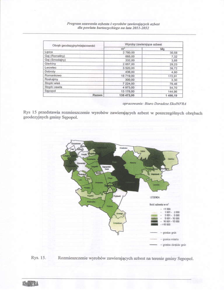 Program usuwania afbestti I wyrob6w zawierajqcych azbest diapowiatii barfoszychiego na lota 2011-2032 Wyrobyzawierajaceazbest Obr$bgeodezyjny/m'iejscowoSli Lipica Gaj(Romaliny) Gaj(Smodajny) Gierkiny Lvrowiec Dobroty Romankowo Roskajmy Stopkiwies Stopkiosada S^popol Razem nT1 2780,00 665,00 332,00 2657,00 3520,00 436,00 15719,00 300,00 7224,00 4973,00 13178,00 135472,00 Mg 30,58 7,32 3,65 29,23 38,72 4,80 172,91 3,30 79,46 54,70 144,96 1490,19 opracowanie: Biuro Do Rys 15 przedstawia rozmieszczenie wyrob6w zawierajacych azbest w poszczegolnych obr?bach geodezyjnych gminy S?popol. - gronice gn-iin - grGnice miastG - yanice obr?b6w gmn Rys. 15.Rozmieszczenie wyrob6w zawierajacych azbest na terenie gminy S?popol.