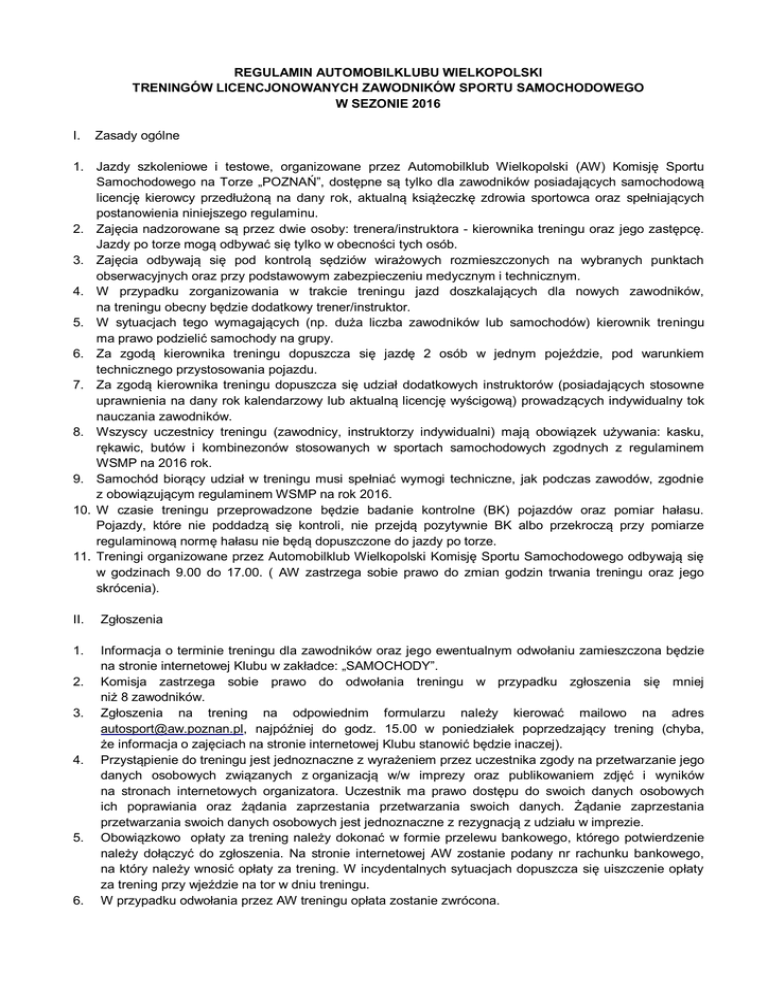REGULAMIN AUTOMOBILKLUBU WIELKOPOLSKI TRENINGÓW LICENCJONOWANYCH ZAWODNIKÓW SPORTU SAMOCHODOWEGO W SEZONIE 2016 I. Zasady ogólne 1. Jazdy szkoleniowe i testowe, organizowane przez Automobilklub Wielkopolski (AW) Komisję Sportu Samochodowego na Torze „POZNAŃ”, dostępne są tylko dla zawodników posiadających samochodową licencję kierowcy przedłużoną na dany rok, aktualną książeczkę zdrowia sportowca oraz spełniających postanowienia niniejszego regulaminu. 2. Zajęcia nadzorowane są przez dwie osoby: trenera/instruktora - kierownika treningu oraz jego zastępcę. Jazdy po torze mogą odbywać się tylko w obecności tych osób. 3. Zajęcia odbywają się pod kontrolą sędziów wirażowych rozmieszczonych na wybranych punktach obserwacyjnych oraz przy podstawowym zabezpieczeniu medycznym i technicznym. 4. W przypadku zorganizowania w trakcie treningu jazd doszkalających dla nowych zawodników, na treningu obecny będzie dodatkowy trener/instruktor. 5. W sytuacjach tego wymagających (np. duża liczba zawodników lub samochodów) kierownik treningu ma prawo podzielić samochody na grupy. 6. Za zgodą kierownika treningu dopuszcza się jazdę 2 osób w jednym pojeździe, pod warunkiem technicznego przystosowania pojazdu. 7. Za zgodą kierownika treningu dopuszcza się udział dodatkowych instruktorów (posiadających stosowne uprawnienia na dany rok kalendarzowy lub aktualną licencję wyścigową) prowadzących indywidualny tok nauczania zawodników. 8. Wszyscy uczestnicy treningu (zawodnicy, instruktorzy indywidualni) mają obowiązek używania: kasku, rękawic, butów i kombinezonów stosowanych w sportach samochodowych zgodnych z regulaminem WSMP na 2016 rok. 9. Samochód biorący udział w treningu musi spełniać wymogi techniczne, jak podczas zawodów, zgodnie z obowiązującym regulaminem WSMP na rok 2016. 10. W czasie treningu przeprowadzone będzie badanie kontrolne (BK) pojazdów oraz pomiar hałasu. Pojazdy, które nie poddadzą się kontroli, nie przejdą pozytywnie BK albo przekroczą przy pomiarze regulaminową normę hałasu nie będą dopuszczone do jazdy po torze. 11. Treningi organizowane przez Automobilklub Wielkopolski Komisję Sportu Samochodowego odbywają się w godzinach 9.00 do 17.00. ( AW zastrzega sobie prawo do zmian godzin trwania treningu oraz jego skrócenia). II. Zgłoszenia 1. Informacja o terminie treningu dla zawodników oraz jego ewentualnym odwołaniu zamieszczona będzie na stronie internetowej Klubu w zakładce: „SAMOCHODY”. Komisja zastrzega sobie prawo do odwołania treningu w przypadku zgłoszenia się mniej niż 8 zawodników. Zgłoszenia na trening na odpowiednim formularzu należy kierować mailowo na adres [email protected], najpóźniej do godz. 15.00 w poniedziałek poprzedzający trening (chyba, że informacja o zajęciach na stronie internetowej Klubu stanowić będzie inaczej). Przystąpienie do treningu jest jednoznaczne z wyrażeniem przez uczestnika zgody na przetwarzanie jego danych osobowych związanych z organizacją w/w imprezy oraz publikowaniem zdjęć i wyników na stronach internetowych organizatora. Uczestnik ma prawo dostępu do swoich danych osobowych ich poprawiania oraz żądania zaprzestania przetwarzania swoich danych. Żądanie zaprzestania przetwarzania swoich danych osobowych jest jednoznaczne z rezygnacją z udziału w imprezie. Obowiązkowo opłaty za trening należy dokonać w formie przelewu bankowego, którego potwierdzenie należy dołączyć do zgłoszenia. Na stronie internetowej AW zostanie podany nr rachunku bankowego, na który należy wnosić opłaty za trening. W incydentalnych sytuacjach dopuszcza się uiszczenie opłaty za trening przy wjeździe na tor w dniu treningu. W przypadku odwołania przez AW treningu opłata zostanie zwrócona. 2. 3. 4. 5. 6. 7. W przypadku nieobecności zawodnika na treningu wniesiona opłata zostanie zwrócona jedynie na pisemną prośbę złożoną najdalej w 24h od zakończenia treningu. III. Odpłatność 1. Udział zawodników/kierowców w treningu jest odpłatny i wynosi: dla zawodników/kierowców nie będących członkami AW i nie startujących w barwach AW - 600 zł/osoby dla zawodników/kierowców AW nowo przyjętych do klubu (kandydat) - 350 zł/osoby dla członków AW (zawodników/kierowców startujących w barwach AW) - 100 zł/osoby 2. Oplata za korzystanie z indywidualnego instruktora wynosi - 200 zł 3. Ze zniżek korzystać mogą zawodnicy/kierowcy AW - Członkowie Klubu i kandydaci po okazaniu legitymacji członkowskiej, na której potwierdzone jest opłacenie składki na bieżący rok. 4. W przypadku braku legitymacji członkowskiej zawodnik wnosi opłaty za trening, jak osoby nie będące członkami Klubu. 5. Bez względu na sytuacje zaistniałe w trakcie treningu wniesiona odpłatność za trening nie podlega zwrotowi. IV. Informacje dodatkowe 1. W dniach treningu otwarcie bramy głównej Toru „Poznań” (od ul. Wyścigowej) następuje na godzinę przed godziną rozpoczęcia treningu. 2. Przy wjeździe na tor wszyscy uczestnicy zajęć zobowiązani są okazać potwierdzenie dokonania przelewu lub uiścić opłatę oraz przedstawić dokumenty, o których mowa w części I niniejszego regulaminu. 3. Zawodnicy zbierają się w rejonie depot (chyba, że w informacji o zajęciach na stronie internetowej AW wskazane będzie inne miejsce), gdzie odbywać się będzie kontrola wyposażenia, (o którym mowa w pkt. 8 części I niniejszego regulaminu) oraz ewentualna odprawa z zawodnikami. 4. Po zakończeniu zajęć obowiązuje bezwzględny zakaz jazd treningowych po terenie Toru „Poznań”. 5. W przypadku przerwania treningu (np. z powodu wypadku lub innego zdarzenia zagrażającego bezpieczeństwu innych zawodników) kierownik treningu nie przedłuża czasu jego trwania. 6. Automobilklub Wielkopolski Komisja Sportu Samochodowego nie udostępniają samochodów do jazdy. 7. Uczestnicy zajęć zobowiązani są do bezwzględnego przestr