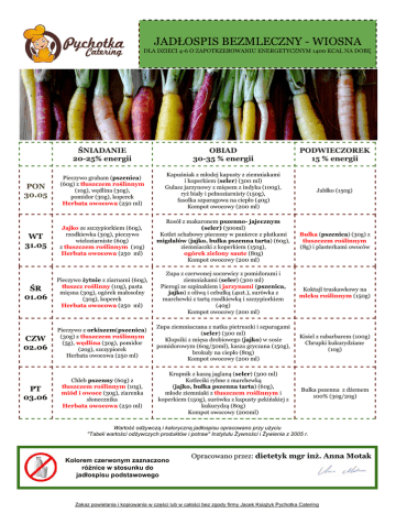 JADŁOSPIS BEZMLECZNY WIOSNA DLA DZIECI 46 O ZAPOTRZEBOWANIU ENERGETYCZNYM 1400 KCAL NA DOBĘ ŚNIADANIE 2025% energii OBIAD 3035 % energii PODWIECZOREK 15 % energii PON 30.05 Pieczywo graham ( pszenica ) (60g) z tłuszczem roślinnym (10g), wędlina (30g), pomidor (30g), koperek Herbata owocowa (250 ml) Kapuśniak z młodej kapusty z ziemniakami i koperkiem ( seler ) (300 ml) Gulasz jarzynowy z mięsem z indyka (100g), ryż biały i pełnoziarnisty (150g), fasolka szparagowa na ciepło (40g) Kompot owocowy (200 ml) Jabłko (150g) WT 31.05 Jajko ze szczypiorkiem (60g), rzodkiewka (30g), pieczywo wieloziarniste (60g) z tłuszczem roślinnym (10g) Herbata owocowa (250 ml) Rosół z makaronem pszenno jajecznym (seler) (300ml) Kotlet schabowy pieczony w panierce z płatkami migdałów ( jajko, bułka pszenna tarta ) (60g), ziemniaczki z koperkiem (150g), ogórek zielony saute (80g) Kompot owocowy (200 ml) Bułka ( pszenica ) (30g) z tłuszczem roślinnym (8g) i plasterkami owoców ŚR 01.06 Pieczywo żytnie z ziarnami (60g), tłuszcz roślinny (10g), pasta mięsna (30g), ogórek małosolny (30g), koperek Herbata owocowa (250 ml) Zupa z czerwonej soczewicy z pomidorami i ziemniakami ( seler ) (300 ml) Pierogi ze szpinakiem i jarzynami ( pszenica, jajko ) z oliwą i cebulką (4szt.), surówka z marchewki z tartą rzodkiewką i szczypiorkiem (40g) Kompot owocowy (200 ml) Koktajl truskawkowy na mleku roślinnym (150g) CZW 02.06 Pieczywo z orkiszem ( pszenica ) (30g) z tłuszczem roślinnym (5g), wędlina (30g), pomidor (20g), szczypiorek Herbata owocowa (250 ml) Zupa ziemniaczana z natka pietruszki i szparagami ( seler ) (300 ml) Klopsiki z mięsa drobiowego ( jajko ) w sosie pomidorowym (60g/50ml), kasza gryczana (150g), brokuły na ciepło (80g) Kompot owocowy (200 ml) Kisiel z rabarbarem (100g) Chrupki kukurydziane (10g) PT 03.06 Chleb pszenny (60g) z tłuszczem roślinnym (10g), miód i owoce (30g), ziarenka słonecznika Herbata owocowa (250 ml) Krupnik z kaszą jaglaną ( seler ) (300 ml) Kotleciki rybne z marchewką ( jajko, bułka pszenna tarta ) (60g), młode ziemniaki z tłuszczem roślinnym i koperkiem (150g), surówka z kapusty pekińskiej z kukurydzą (80g) Kompot owocowy (200ml) Bułka pszenna z dżemem 100% (30g/20g) Wartość odżywczą i kaloryczną jadłospisu opracowano przy użyciu "Tabeli wartości odżywczych produktów i potraw" Instytutu Żywności i Żywienia z 2005 r. Kolorem czerwonym zaznaczono różnice w stosunku do jadłospisu podstawowego Opracowano przez: dietetyk mgr inż. Anna Motak Zakaz powielania i kopiowania w części lub w całości bez zgody firmy Jacek Książyk Pychotka Catering JADŁOSPIS BEZMLECZNY WIOSNA DLA DZIECI 46 O ZAPOTRZEBOWANIU ENERGETYCZNYM 1400 KCAL NA DOBĘ ŚNIADANIE 2025% energii OBIAD 3035 % energii PODWIECZOREK 15 % energii PON 04.0 6 Chleb pszenny (60g) z tłuszczem roślinnym (10g), wędlina (30g), papryka (30g) Herbata owocowa (250 ml) Zupa ogórkowa z dodatkiem zielonego ogórka ryżem i koperkiem ( seler ) (300 ml) Kotlet wieprzowy z mięsa mielonego z warzywami ( jajko, pszenica ) (60g), ziemniaki (150g), sałatka z sałaty masłowej, botwinki z rzodkiewką, pomidorem i ziołowomiodowym sosem vinegrette (60g) Kompot owocowy (200ml) Banan (150g) WT 05.06 Chleb pszenny graham (60g) z tłuszczem roślinnym (10g), pasta jajeczna (30g), rzodkiewka (30g), szczypiorek Herbata owocowa (250 ml) Zupa koperkowa z kalafiorem i ziemniakami niezabielana ( seler ) (300 ml) Kaszotto z kaszy jęczmiennej pęczak z mięsem wieprzowym i młodymi warzywami (180g), sos pomidorowy (50 ml), surówka z ogórka małosolnego z marchewką (40g) Kompot owocowy (200ml) Sałatka owocowa z miodem (150g) ŚR 06.06 Chleb orkiszowy ( orkisz, pszenica ) (30g) z tłuszczem roślinnym (5g), pasta z tuńczyka (30g), pomidor (20g) Herbata owocowa (250 ml) Zupa z zielonego groszku z zacierkami ( seler, mąka pszenna, jajko ) (300 ml) Fileciki indycze w płatkach kukurydzianych ( jajko, ekstrakt słodu jęczmiennego ) (60g), ziemniaki (150g), surówka z buraczków (80g) Kompot owocowy (200ml) Kiwi (150g) CZW 07.06 Chleb razowy ( pszenica ) (60g) z tłuszczem roślinnym (10g), szynka pieczona (30g), kiszony ogórek (30g), sałata Herbata owocowa (250ml) Zupa szczawiowa z jajkiem i ziemniakami niezabielana ( seler ) (300ml) Knedle z truskawkami ( mąka pszenna ) (220g), surówka z marchewki z jabłkiem i ziarnami słonecznika (40g) Kompot owocowy (200ml) Pieczywo chrupkie ( pszenica ) z tłuszczem roślinnym , wędliną i papryką 2szt. PT 08.06 Pasta warzywna (30g), ogórek gruntowy (30g), pieczywo wieloziarniste ( pszenica ) (60g) z tłuszczem roślinnym (10g) Herbata owocowa (250 ml) Zupa pomidorowa z makaronem niezabielana ( pszenica , seler ) (300ml) Kotleciki rybne w sosie greckim (60g/50ml), ziemniaki puree ( tłuszcz roślinny ) (150g), zielone szparagi i marchewka na parze (40g) Kompot mieszany (200 ml) Ciasto bezmleczne z rabarbarem ( mąka pszenna, jajko ) 1 kawałek Wartość odżywczą i kaloryczną jadłospisu opracowano przy użyciu "Tabeli wartości odżywczych produktów i potraw" Instytutu Żywności i Żywienia z 2005 r. Kolorem czerwonym zaznaczono różnice w stosunku do jadłospisu podstawowego Opracowano przez: dietetyk mgr inż. Anna Motak Zakaz powielania i kopiowania w części lub w całości bez zgody firmy Jacek Książyk Pychotka Catering