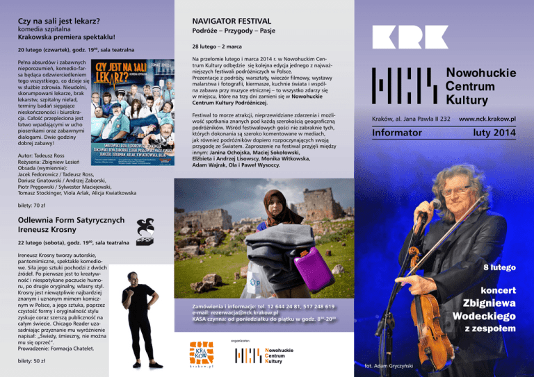 Czy na sali jest lekarz? komedia szpitalna Krakowska premiera spektaklu! 20 lutego (czwartek), godz. 1900, sala teatralna Pełna absurdów i zabawnych nieporozumień, komedio-farsa będąca odzwierciedleniem tego wszystkiego, co dzieje się w służbie zdrowia. Nieudolni, skorumpowani lekarze, brak lekarstw, szpitalny nieład, terminy badań sięgające nieskończoności i biurokracja. Całość przepleciona jest łatwo wpadającymi w ucho piosenkami oraz zabawnymi dialogami. Dwie godziny dobrej zabawy! Autor: Tadeusz Ross Reżyseria: Zbigniew Lesień Obsada (wymiennie): Jacek Fedorowicz / Tadeusz Ross, Dariusz Gnatowski / Andrzej Zaborski, Piotr Pręgowski / Sylwester Maciejewski, Tomasz Stockinger, Viola Arlak, Alicja Kwiatkowska NAVIGATOR FESTIVAL Podróże – Przygody – Pasje 28 lutego – 2 marca Na przełomie lutego i marca 2014 r. w Nowohuckim Centrum Kultury odbędzie się kolejna edycja jednego z najważniejszych festiwali podróżniczych w Polsce. Prezentacje z podróży, warsztaty, wieczór filmowy, wystawy malarstwa i fotografii, kiermasze, kuchnie świata i wspólna zabawa przy muzyce etnicznej – to wszystko zdarzy się w miejscu, które na trzy dni zamieni się w Nowohuckie Centrum Kultury Podróżniczej. Festiwal to morze atrakcji, nieprzewidziane zdarzenia i możliwość spotkania znanych pod każdą szerokością geograficzną podróżników. Wśród festiwalowych gości nie zabraknie tych, których dokonania są szeroko komentowane w mediach, jak również podróżników dopiero rozpoczynających swoją przygodę ze Światem. Zaproszenie na festiwal przyjęli między innym: Janina Ochojska, Maciej Sokołowski, Elżbieta i Andrzej Lisowscy, Monika Witkowska, Adam Wajrak, Ola i Paweł Wysoccy. Kraków, al. Jana Pawła II 232 Informator www.nck.krakow.pl luty 2014 bilety: 70 zł Odlewnia Form Satyrycznych Ireneusz Krosny 22 lutego (sobota), godz. 1900, sala teatralna Ireneusz Krosny tworzy autorskie, pantomimiczne, spektakle komediowe. Siła jego sztuki pochodzi z dwóch źródeł. Po pierwsze jest to kreatywność i niespotykane poczucie humoru, po drugie oryginalny, własny styl. Krosny jest niewątpliwie najbardziej znanym i uznanym mimem komicznym w Polsce, a jego sztuka, poprzez czystość formy i oryginalność stylu zyskuje coraz szerszą publiczność na całym świecie. Chicago Reader uzasadniając przyznanie mu wyróżnienie napisał: „Świeży, śmieszny, nie można mu się oprzeć”. Prowadzenie: Formacja Chatelet. bilety: 50 zł 8 lutego koncert Zbigniewa Wodeckiego Zamówienia i informacje: tel. 12 644 24 81, 517 248 619 e-mail: [email protected] KASA czynna: od poniedziałku do piątku w godz. 830-2000 z zespołem organizator: fot. Adam Gryczyński 3-14 lutego Ferie w NCK Zajęcia i warsztaty dla dzieci i młodzieży spędzających ferie w Krakowie. Szczegóły na stronie www.nck.krakow.pl/ferie NCK 3-14 lutego, godz. 1100, sala teatralna Festiwal Teatrów dla Dzieci – Kraków 2014 W trwającym dwa tygodnie Festiwalu biorą udział teatry z wielu miast Polski, prezentując na scenie NCK swoje najciekawsze spektakle. bilety: 15 zł 8 lutego (sobota), godz. 1900, sala teatralna Koncert Zbigniewa Wodeckiego z zespołem w składzie: Zbigniew Stelmasiak, Mirosław Wiśniewski, Jarosław Zawadzki, Michał Bylica, Paweł Twardoch bilety: 60 zł 15 lutego (sobota) godz. 2000, sala C Bal karnawałowy Muzyka w wykonaniu zespołu „Czakram” bilety:125 zł za osobę 16 lutego (niedziela), godz. 1830, sala teatralna Uroczysty Koncert dla uczczenia pamięci Pani Profesor Janiny Strzembosz W koncercie wystąpią m.in. Zespół Pieśni i Tańca Nowa Huta, Zespół Pieśni i Tańca Małe Słowianki, Balet Dworski Cracovia Danza, Szkoła Baletowa w Krakowie, Zespół Pieśni i Tańca Krakowiacy, Studio Baletowe Opery Krakowskiej. bilety: 10 zł 18 lutego (wtorek), godz. 1800, sala teatralna Salon Literacko Muzyczny – Wieczór sześćdziesiąty Stolik Literacki – A imię Twoje PESEL – Spotkanie z poetą i fotografikiem Andrzejem Walterem. Stolik Muzyczny – Nie czekamy – Recital Basi GąsienicyGiewont. Prowadzenie: Basia Stępniak-Wilk wstęp wolny 20 lutego (czwartek), godz. 1900, sala teatralna Czy na sali jest lekarz? Krakowska premiera spektaklu! Szalona, pełna absurdów i zabawnych nieporozumień komedio-farsa, będąca odzwierciedleniem tego wszystkiego, co dzieje się w służbie zdrowia. Dwie godziny dobrej zabawy. bilety: 70 zł 22 lutego (sobota), godz. 1700-2000, studio C4 3…2…1…TANIEC – Konkurs Choreograficzny Konkurs skierowany jest do choreografów poszukujących własnego, oryginalnego języka scenicznej wypowiedzi. bilety: 25 zł 22 lutego (sobota), godz. 1900, sala teatralna Odlewnia Form Satyrycznych Ireneusz Krosny – pantomimiczny spektakl komediowy bilety: 50 zł 22 lutego (sobota), godz. 1900, sala 209 Teatr Ab Intra – „Czarny kwadrat” wg A. Świrszczyńskiej PREMIERA! scenariusz i reżyseria: Marlena Topolska bilet: 10 zł 23 lutego (niedziela), godz. 1600, sala kameralna Spotkanie z piosenką – prowadzi Wojciech Dąbrowski wstęp wolny 23 lutego (niedziela), godz. 1900, Studio C4 Krakowski Teatr Tańca – Poliamoria bilety: 25 zł 28 lutego – 2 marca (piątek-niedziela) 2. NAVIGATOR FESTIVAL – festiwal podróżników NCK do 20 lutego, budynek A, I piętro wystawa fotografii i trofeów Zespołu Góralskiego „Hamernik” z okazji 30-lecia Zespołu. do 2 marca, Foto-Galeria, budynek A Krakowski Klub Fotograficzny – Fotografie 2013 Wystawa obejmuje najciekawsze zdjęcia wykonane przez członków klubu w 2013 roku. do 20 lutego, Galeria Centrum, budynek B Leszek Dutka – wystawa rysunku z lat 1970-2011 i ceramiki z lat 70. do 20 lutego, Galeria Centrum, budynek B Arkadiusz Andrejkow – wystawa malarstwa i fotografii dokumentalnej 20 lutego, Galeria Centrum, budynek B (foyer) W podróży – wystawa malarstwa rumuńskich i polskich artystów z Grupy KRoma wernisaż wystawy połączony z inauguracją 2. Naviga