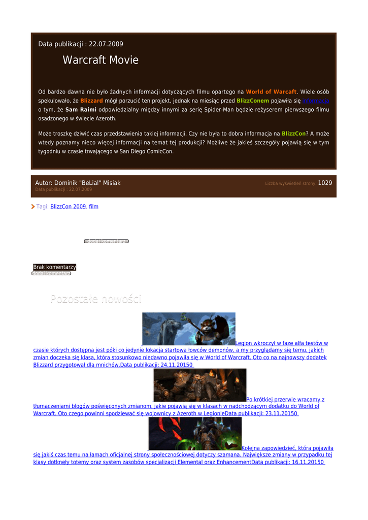 Data publikacji : 22.07.2009 Warcraft Movie Od bardzo dawna nie było żadnych informacji dotyczących filmu opartego na World of Warcaft. Wiele osób spekulowało, że Blizzard mógł porzucić ten projekt, jednak na miesiąc przed BlizzConem pojawiła się informacja o tym, że Sam Raimi odpowiedzialny między innymi za serię Spider-Man będzie reżyserem pierwszego filmu osadzonego w świecie Azeroth. Może troszkę dziwić czas przedstawienia takiej informacji. Czy nie była to dobra informacja na BlizzCon? A może wtedy poznamy nieco więcej informacji na temat tej produkcji? Możliwe że jakieś szczegóły pojawią się w tym tygodniu w czasie trwającego w San Diego ComicCon. Autor: Dominik "BeLial" Misiak Liczba wyświetleń strony: 1029 Data publikacji : 22.07.2009 Tagi: BlizzCon 2009, film Komentarz (0) dodaj komentarz Brak komentarzy dodaj komentarz Pozostałe nowości Zapowiedź zmian w klasach - Mnich Legion wkroczył w fazę alfa testów w czasie których dostępna jest póki co jedynie lokacja startowa łowców demonów, a my przyglądamy się temu, jakich zmian doczeka się klasa, która stosunkowo niedawno pojawiła się w World of Warcraft. Oto co na najnowszy dodatek Blizzard przygotował dla mnichów.Data publikacji: 24.11.20150 Zapowiedź zmian w klasach - Wojownik Po krótkiej przerwie wracamy z tłumaczeniami blogów poświęconych zmianom, jakie pojawią się w klasach w nadchodzącym dodatku do World of Warcraft. Oto czego powinni spodziewać się wojownicy z Azeroth w LegionieData publikacji: 23.11.20150 Zapowiedź zmian w klasach - Szaman Kolejna zapowiedzieć, która pojawiła się jakiś czas temu na łamach oficjalnej strony społecznościowej dotyczy szamana. Największe zmiany w przypadku tej klasy dotknęły totemy oraz system zasobów specjalizacji Elemental oraz EnhancementData publikacji: 16.11.20150 11 urodziny World of Warcraft World of Warcraft obchodzi już swoje 11 urodziny. Z tej okazji Blizzard przygotował kilka zabawek, które powinny wszystkim przypomnieć sam początek przygody w świecie Azeroth - w rolach głównych Edwin VanCleef, Hogger, murlok oraz Windfury (w wersji nadmuchiwanej).Data publikacji: 16.11.20150 Zapowiedź zmian w klasach - Rycerz śmierci Kolejna zapowiedź opublikowana na łamach oficjalnej strony społecznościowej World of Warcraft poświęcona jest klasie rycerzy śmierci. Poniżej znajdziecie informacje między innymi o ujednoliceniu wszystkich run oraz nowej umiejętności specjalizacji Blood, która została zainspirowana Lordem Marrowgarem z Icecrown Citadel.Data publikacji: 15.11.20150 Wszystkie nowości