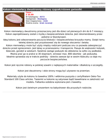 Informacje o produkcie Utworzono 02-03-2017 Kokon niemowlęcy dwustronny różowy zygzak/różowe gwiazdki Cena : £ 55.99 Nr katalogowy : 8372 Dostępność : Dostępny Stan magazynowy : niski Średnia ocena : brak recenzji Kokon niemowlęcy dwustronny przeznaczony jest dla dzieci od pierwszych dni do 6-7 miesięcy. Kokon zaprojektowany został z myślą o bezpieczeństwie dziecka. Jest rekomendowany przez położne w Skandynawii. Ideą kokonu jest odwzorowanie poczucia bliskości i bezpieczeństwa brzuszka mamy. Dzięki temu łatwiej dziecku jest przystosować się do nowego otoczenia i świata. Kokon niemowlęcy może być użyty między rodzicami podczas snu co pozwala zabezpieczyć dziecko przed zgnieceniem. Jest łatwy w przenoszeniu i transporcie. Pasuje do większości kołysek, łóżeczek, gondoli w wózkach. Świetnie zastąpi poduszki do obłożenia na sofie czy podłodze. Można prać go w pralce w 30 stopniach, wirować max. 800 obortów - jak poduszkę. Idealnie sprawdza się w trakcie podróży - dziecko zawsze śpi w swoim łóżeczku co daje mu poczucie bezpieczeństwa. Kokon jest ręcznie robiony w polskiej szwalni z najlepszych materiałów i dbałością o szczegóły. Kokon jest dwustronny i obie strony mogą być używane na przemian. Materiały użyte do kokonu to bawełna 100% i włóknina puszysta z certyfikatem Oeko-Tex Standard 100 Class articles. Tasiemki w kokonie są satynowe bądź bawełniane w zależności od modelu. Falbanka ozdobna wykonana jest z bawełny. Kokon jest świetnym prezentem na babyshower dla przyszłych rodziców. Wygenerowano w programie www.oscGold.com